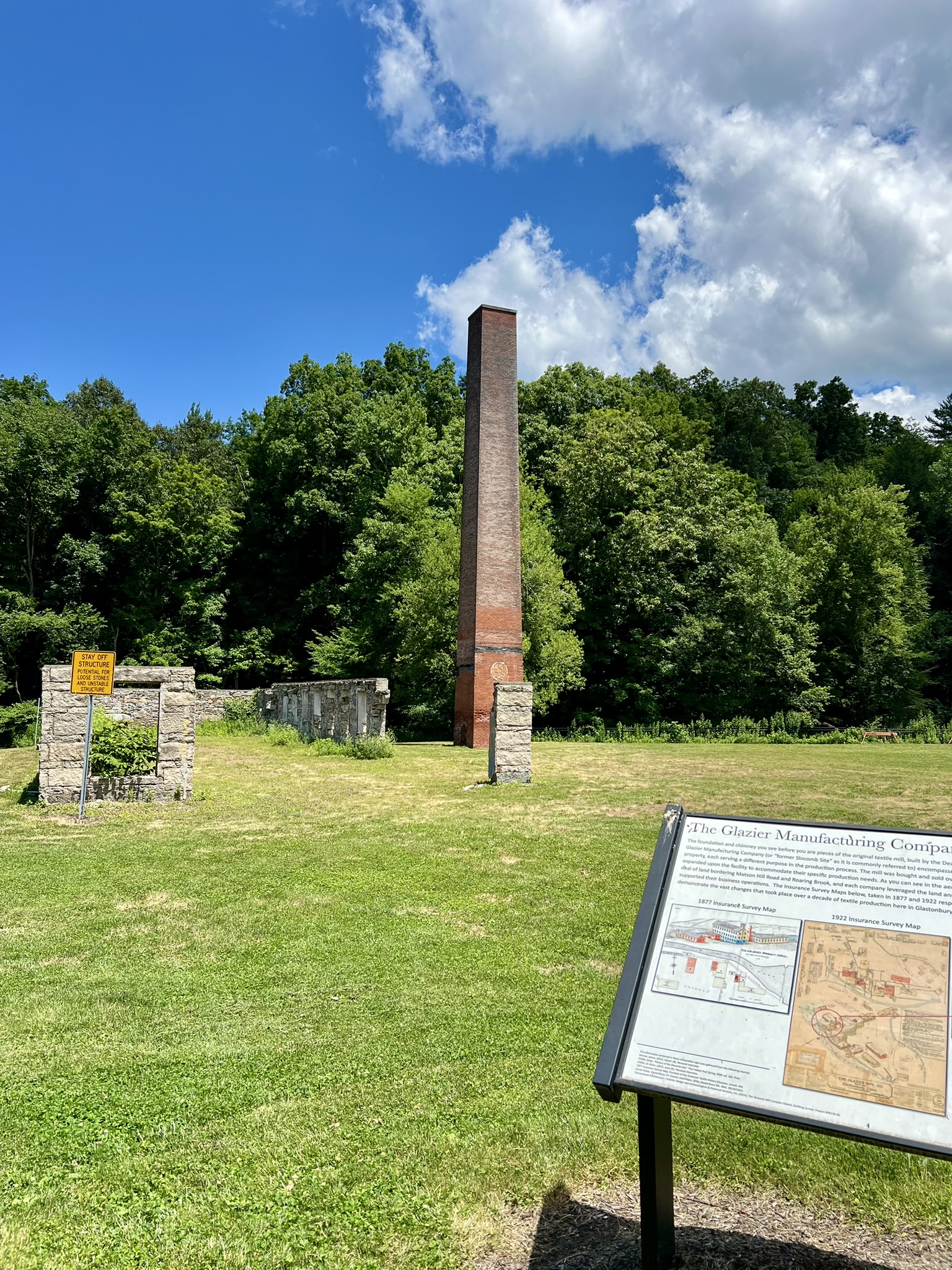 This parcel of town land is just around the corner from the Cotton Hollow North Trail parking area and is the site of the former Glazier Manufacturing Company. At one time there were as many as 28 interconnected buildings on the property. The only remaining remnants are the granite foundation and brick chimney from the original mill built in 1836. Three storyboards scattered around the ruins describe the manufacturing history at this site. The dam on the Roaring Brook and the first mill were built by Amos and Sprowell Dean for producing satinet and woolen textiles. The mill ownership and management changed hands a few times and in 1909 was renamed Glazier Manufacturing Company. Through the years, Glazier kept up with the latest technology and moved from a water wheel to turbine power for increased efficiency which allowed for the production of higher quality garments. After the Great Depression there were a few more ownership changes until in 1956 it was purchased by J. T. Slocomb Company and used to build aerospace parts. In 2007 the Town of Glastonbury purchased the property. There are no trails, but there is a picnic table with two benches under the shade of a tree near the brook that offers a nice place for a picnic lunch between stops. For more information and for directions click HERE.