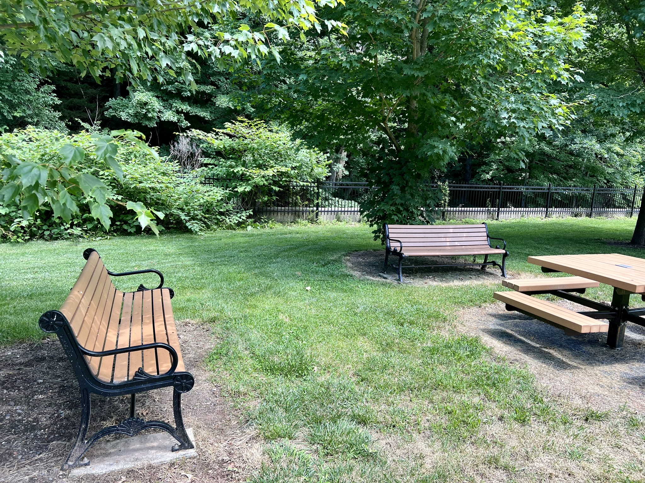Picnic facilities along the banks of Roaring Brook; the remains of the original 1836 mill