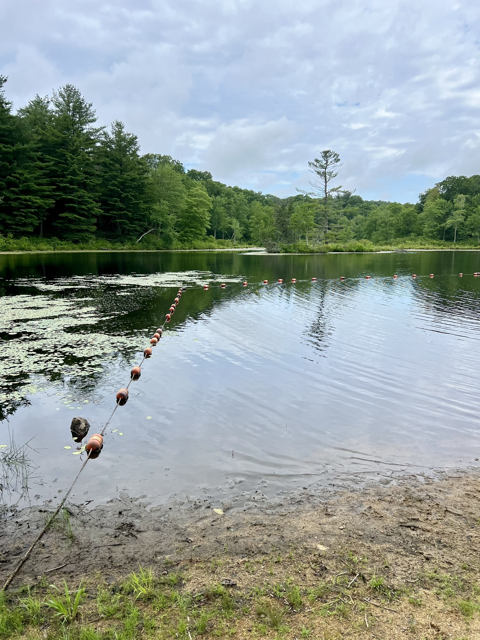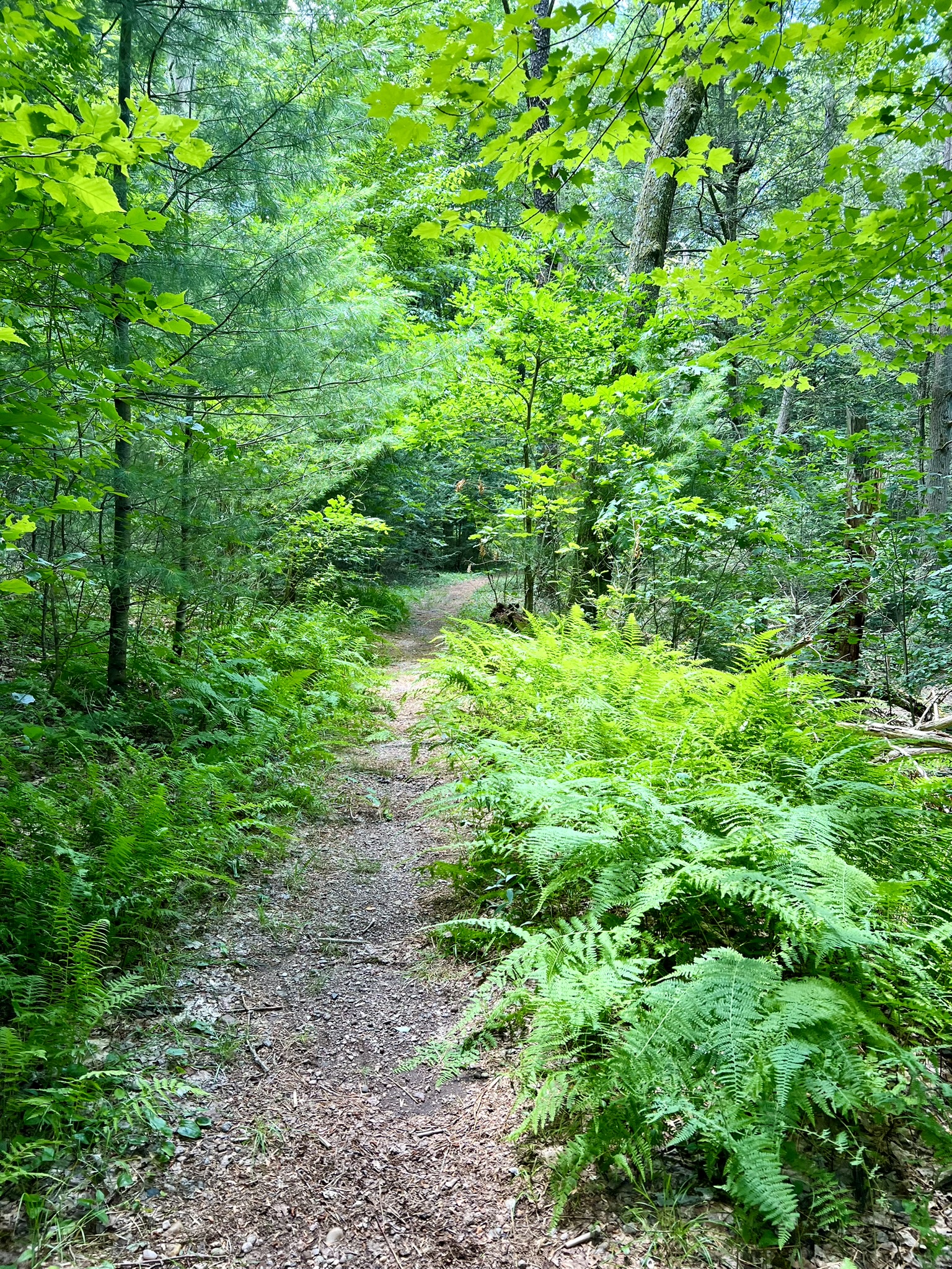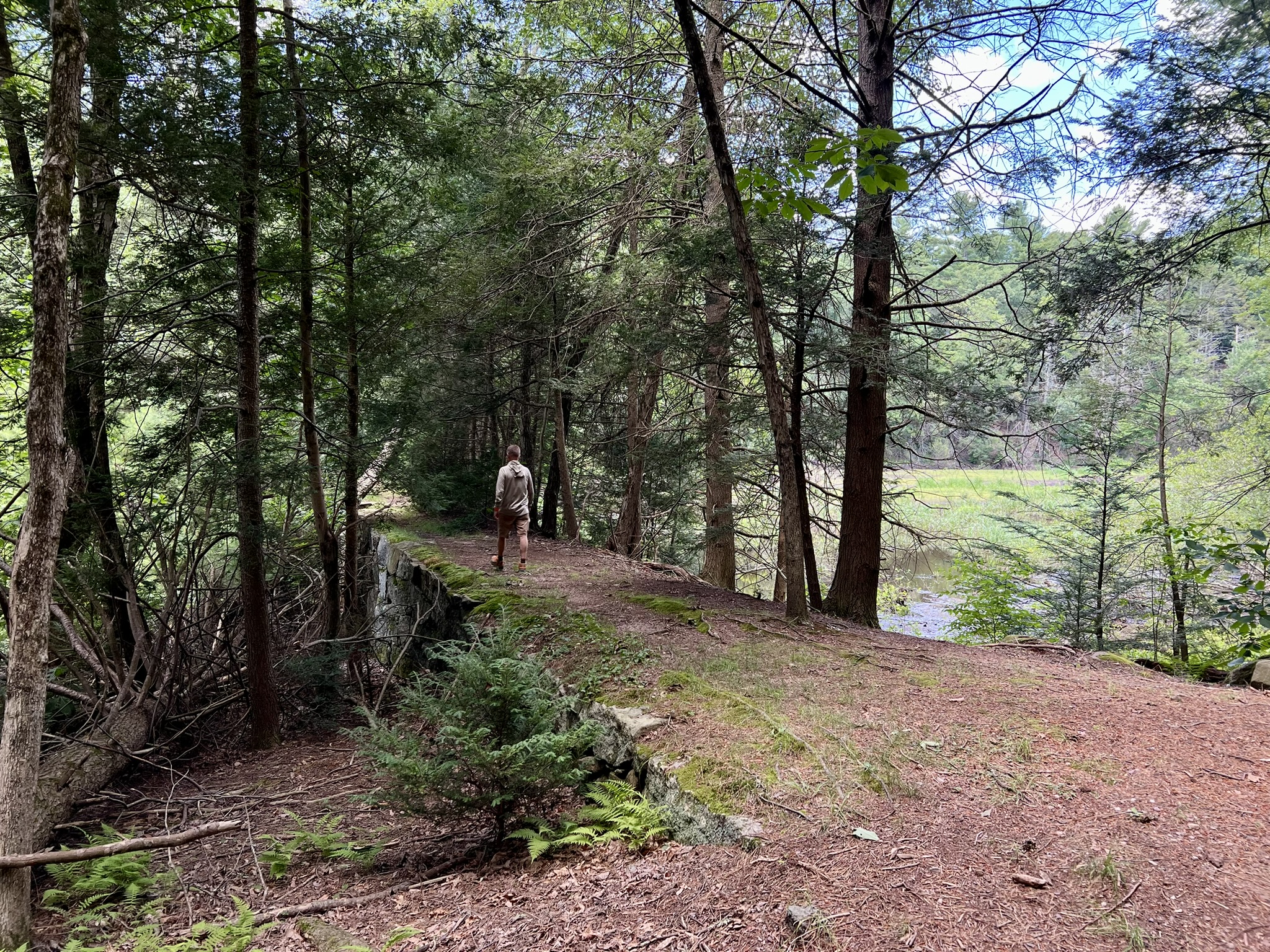 The trailhead is not well-marked and the trail blazes are too faded to be able to follow effectively. However, with the combination of the trail map and description and AllTrails, it is easy to find. From the parking pullout at 111 Shoddy Mill Road continue east over the bridge and watch for an overgrown trail entrance on the left. The trail is flat and bordered by ferns. There is a short section that is quite overgrown in summer, so long pants are advisable. The trail then opens up into a pine forest and veers left where you will see the dam. The dam is surprisingly well built and I recommend following it to its end where you can see the work of some industrious beavers who have helped keep the old pond intact.
