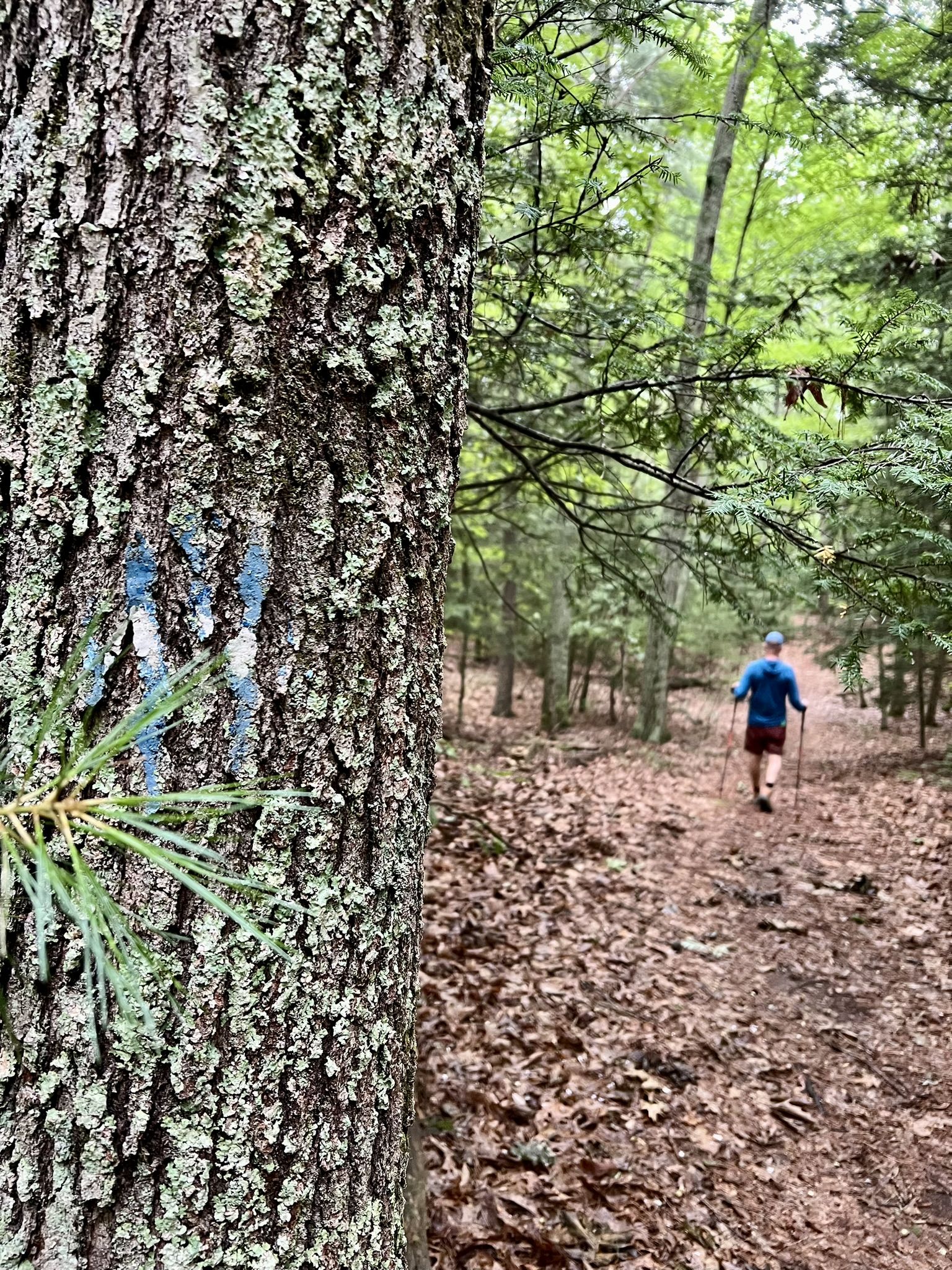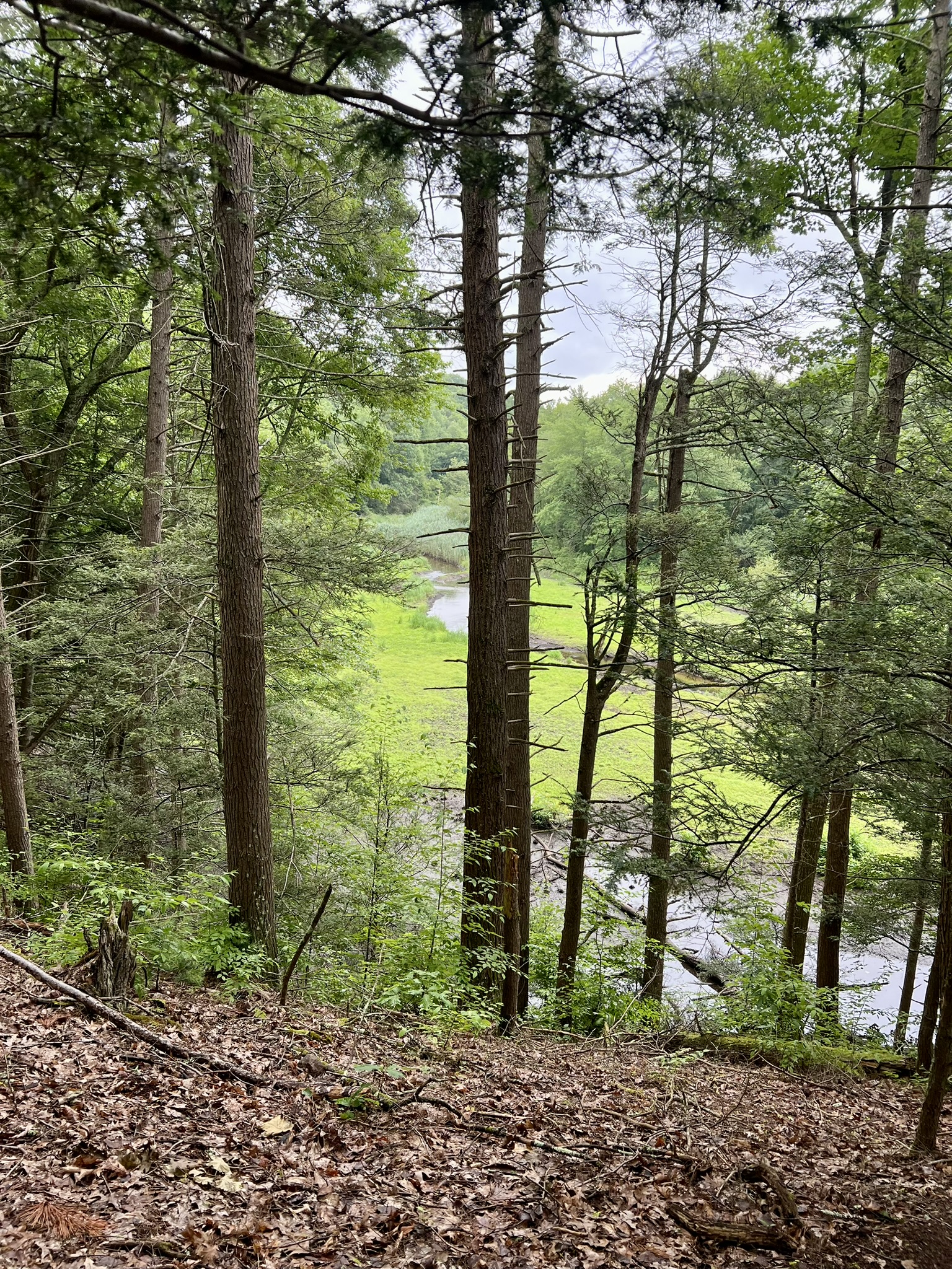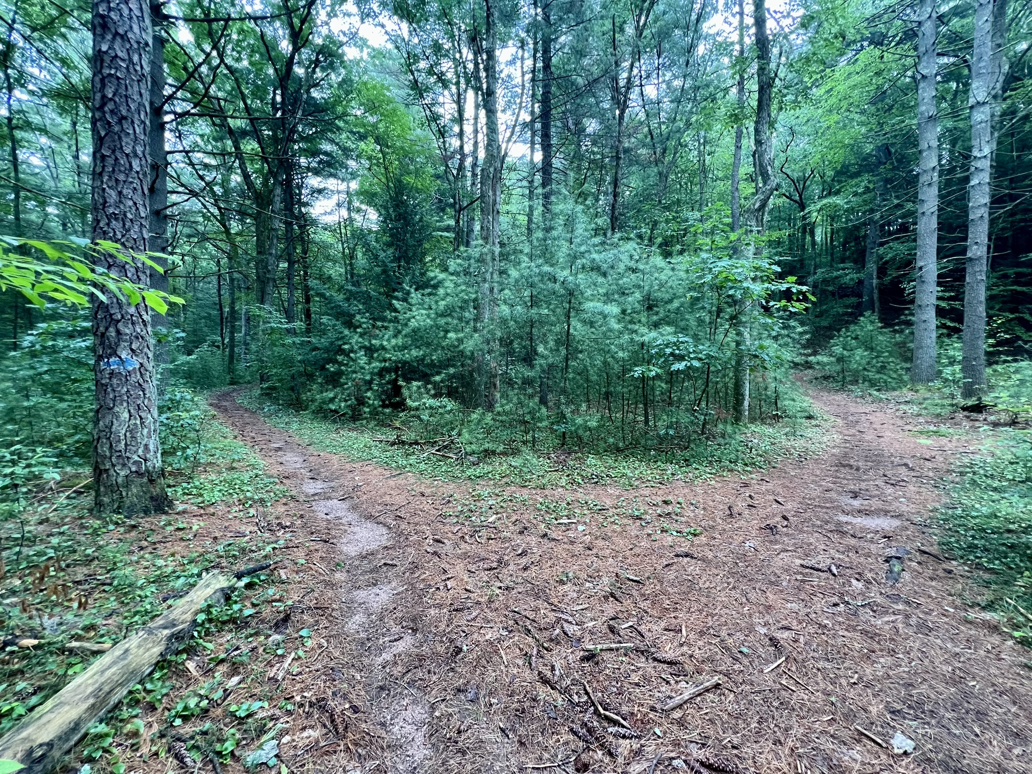 The West Trail starts at the parking pullout. The town description says the trail “turns left on the gas pipeline for about 70 paces before turning north into pine forest”, however, I don’t recommend this route in summer as the gas right-of-way is completely overgrown. Instead, continue straight and at the first fork, stay left. We made the mistake of following the path to the right, where it descends to the brook. This is a very sketchy section of trail due to its narrow and sloping nature. At the next trail fork you can go either way to complete the loop, but it may be easier to follow if you go clockwise (taking the path to the left). The blue and white blazes are faded and infrequent, so I found it helpful to also use AllTrails to double check the route. The trail goes through a lovely section of pine forest before climbing the ridge and heading back south. The AllTrails route does a slightly different loop at the northern end – we followed the path shown on the town trail map by turning right at the big blue arrow. There are some nice views of the old mill pond and brook from above as you get closer to the dam site.