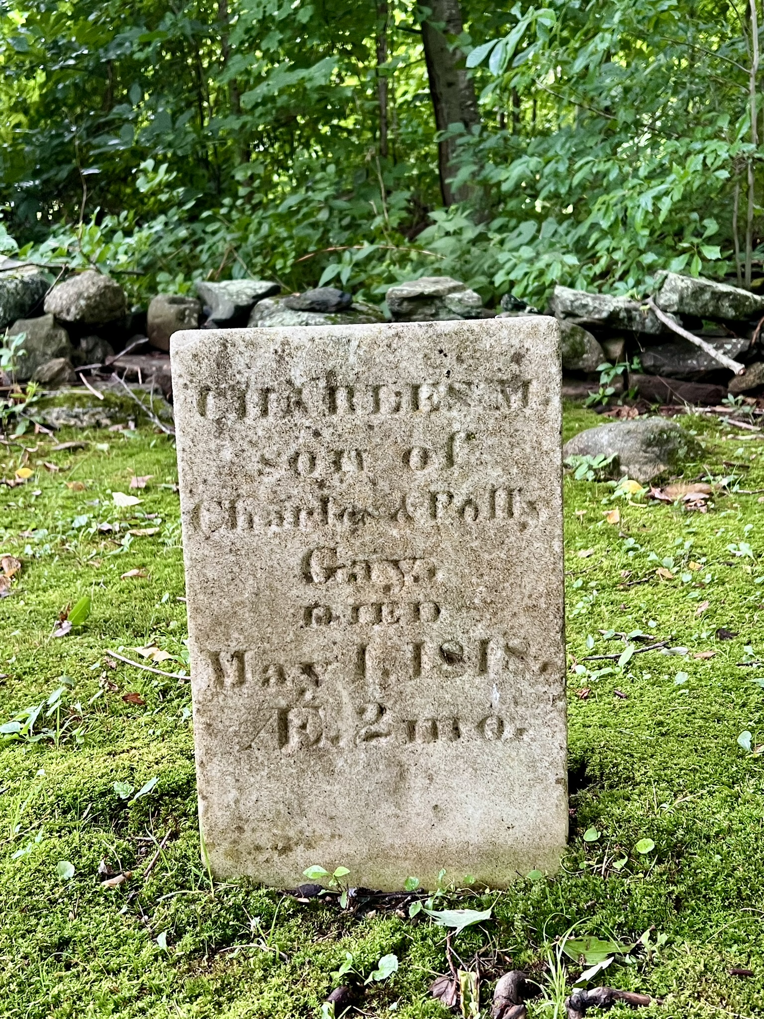 During our July visit, we did a two mile loop past the mill ruins and swimming pond, finishing with a short woods walk. We parked in the first dirt parking area on the right after passing the entrance guard shack. Before starting our hike we walked a short distance back toward the park entrance and visited the small cemetery at the edge of the woods near the shack. Several members of the Gay family are buried in this family cemetery. For our hike, we followed the park road and stayed straight on the blue-blazed trail where the road curves to the right. This wide cart path continues to a footbridge over the Blackledge River. Just before the bridge, take the white trail north past the mill ruins. When the white trail exits the woods by the pond we stayed right and walked up to the main parking area. From there, off the western (left) side there is a small outbuilding and an unmarked trail into the woods. This joins the white trail, where we turned right and followed it as it looped up and around to finish in the parking lot where we started. You can shorten your hike by turning off the white trail onto the red/yellow trail which comes out on the park road. You can plan a longer hike using the Trail Map. If you decide to do a longer hike, please check the kiosks for the status of the Red Trail footbridge over the Blackledge River, which was still washed out at the time of our visit.