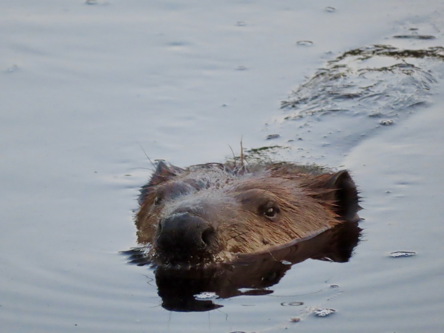 From left to right: signs of beaver activity; the beaver pond early in the morning; one of the beavers giving me a warning look.