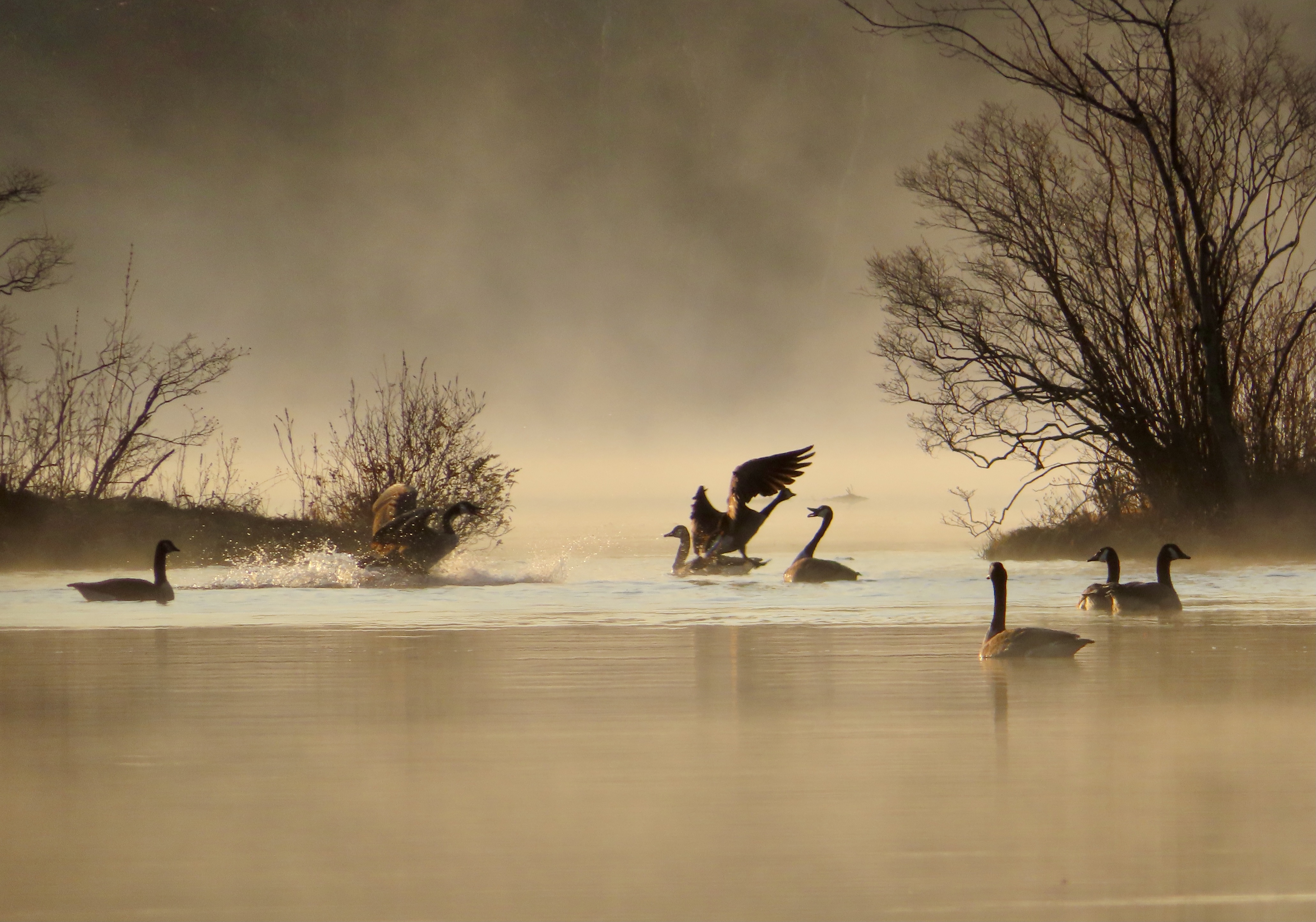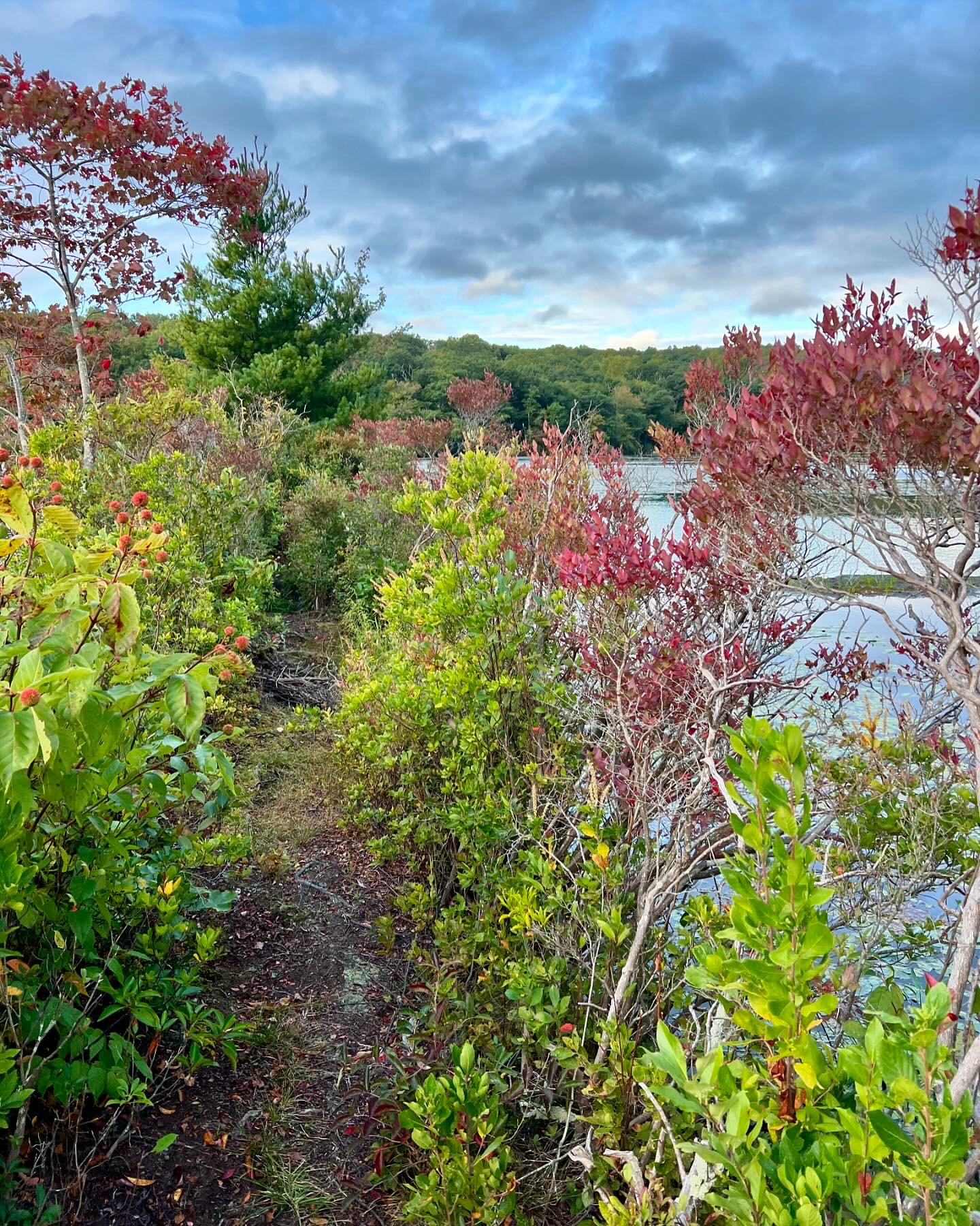 From left to right: one misty morning the geese were making a ruckus; the dam crossing can be tricky at high water; the pine forest; the berm along the eastern bank.