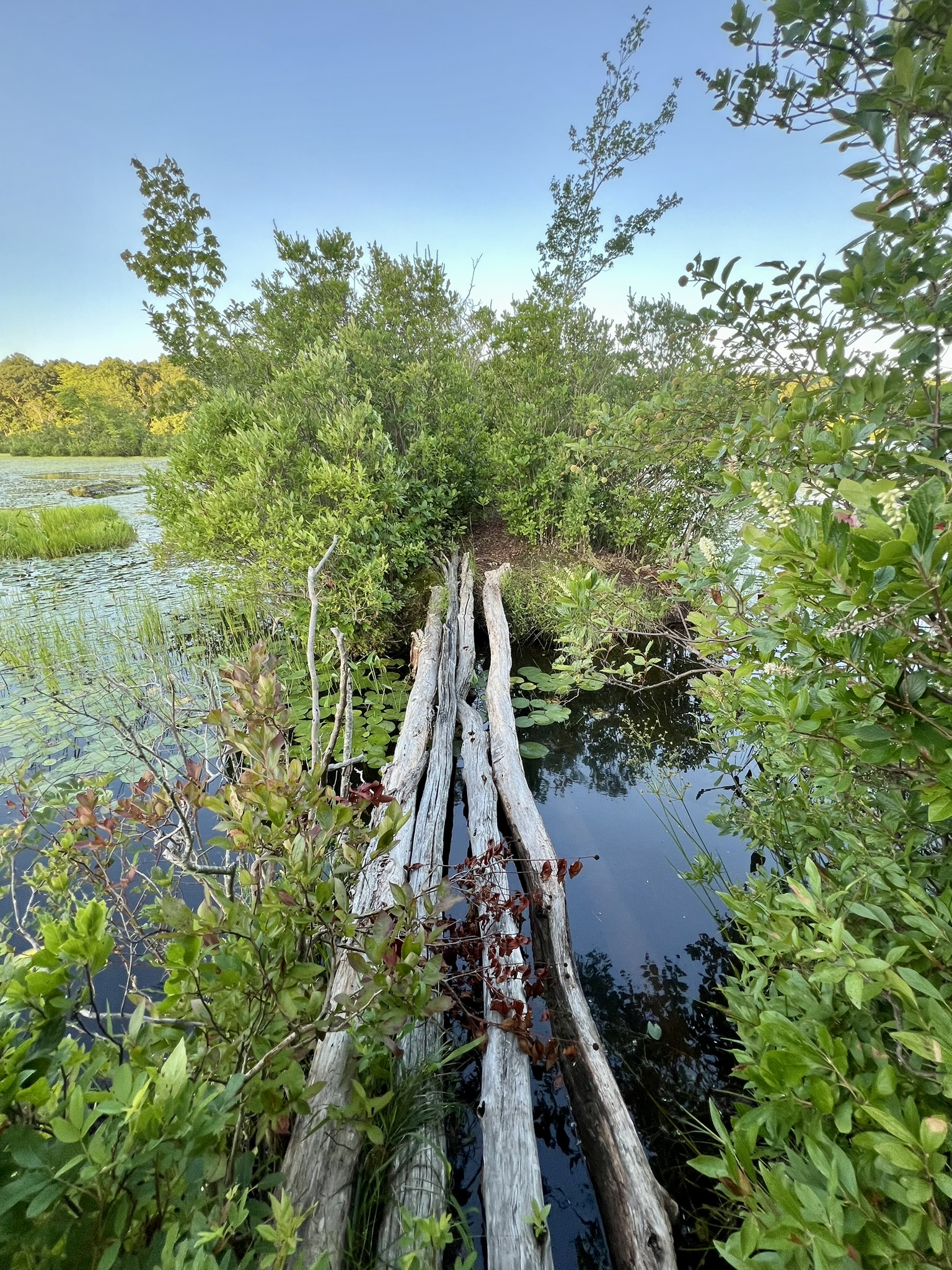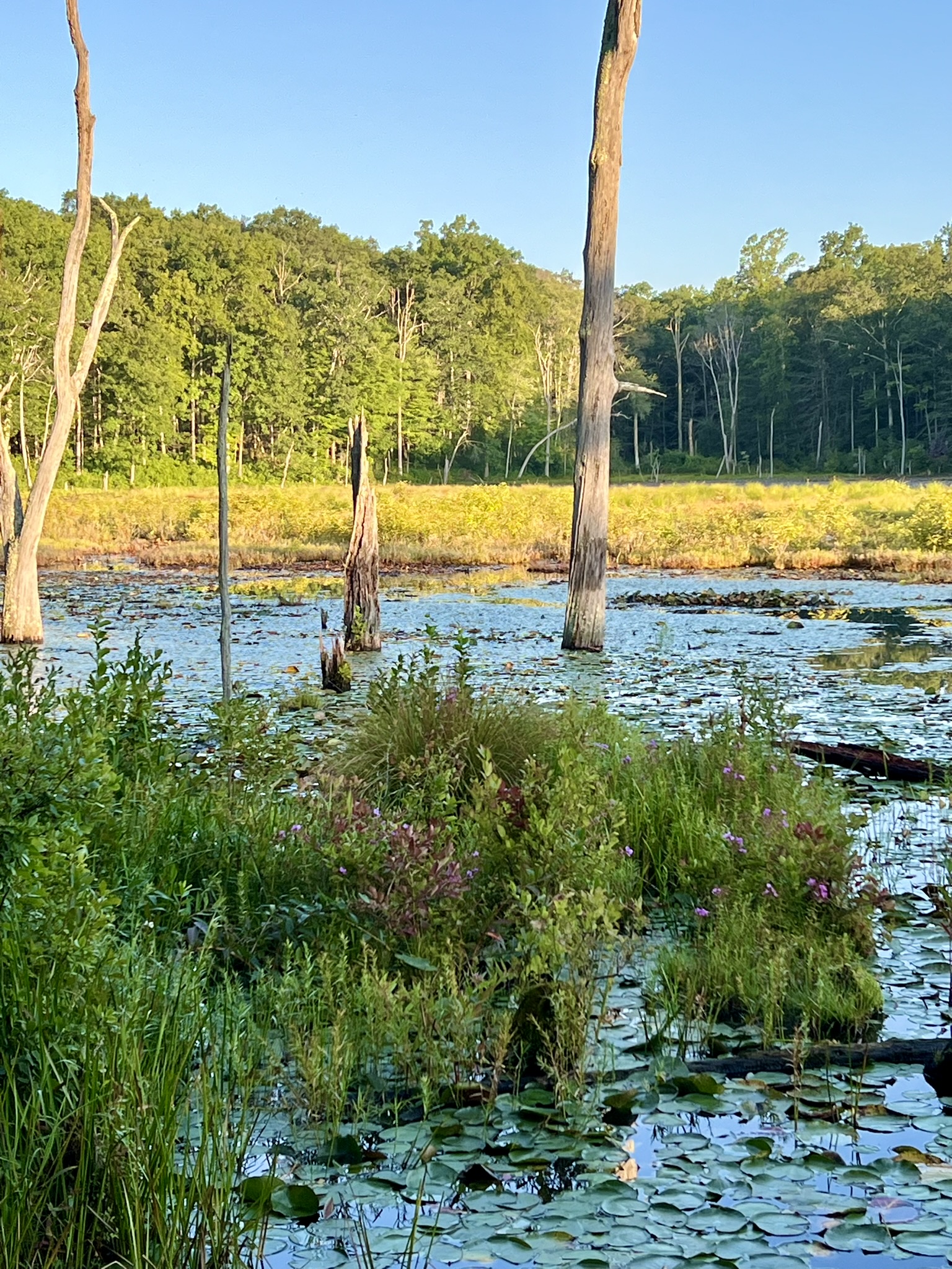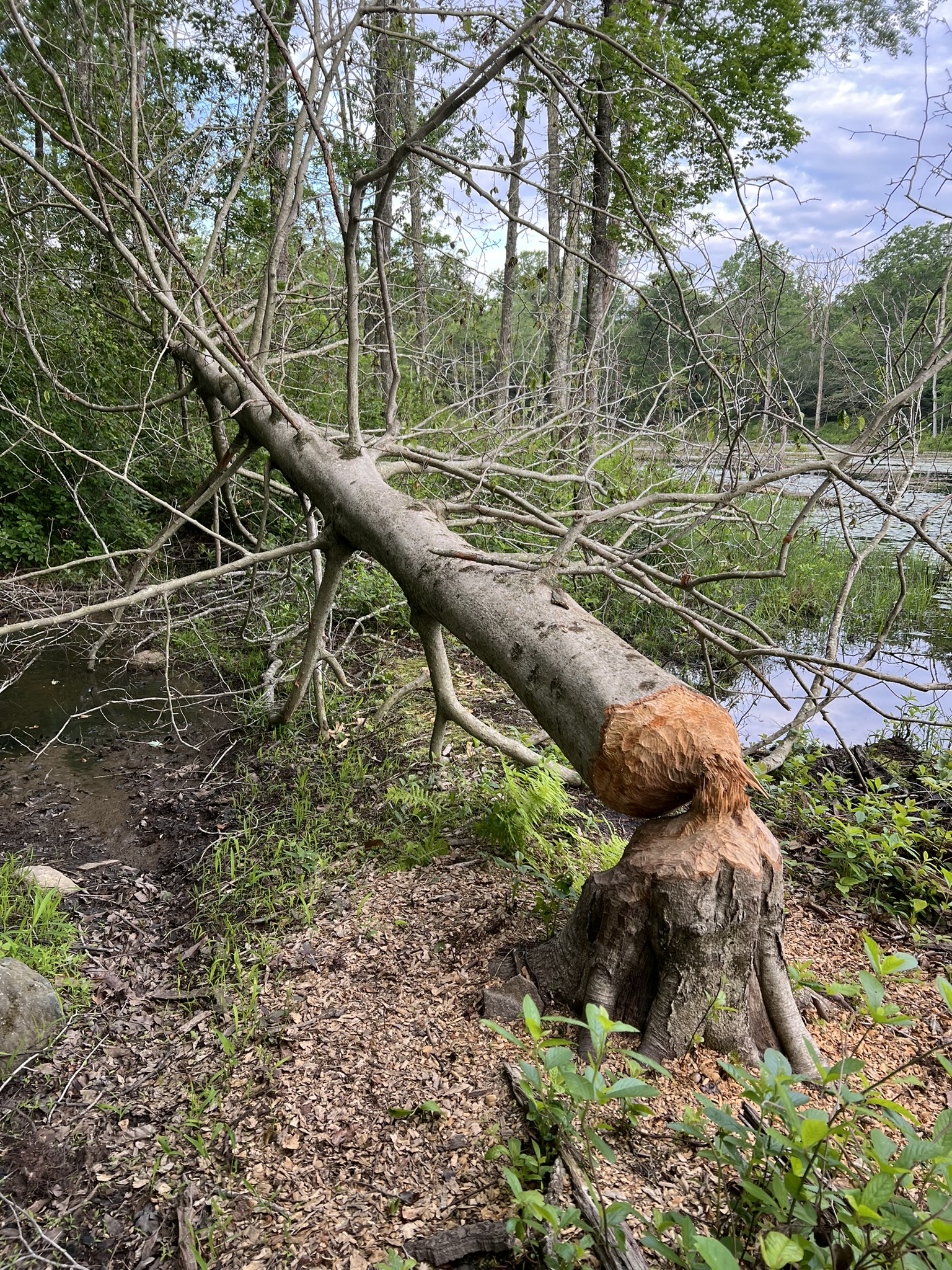 Turn left to walk out onto the peninsula, which is actually the old road bed. If you look at Google Maps the land mass appears to extend all the way across. I usually venture out only as far as the lone pine tree. At that point there are some intimidating logs to cross, and I do not recommend this. When I visited in May I was surprised and thrilled to encounter beavers here. On a recent visit, I did not follow my own advice and I crossed the logs. Continuing as far as I could, the trail gets very overgrown and crosses two large beaver-created piles of branches, one that looked recently attended to with wet mud and leafy twigs. Retrace your steps and continue along the woods road. At this point there are two options. Traditionally, as the road inclines and starts to curve right, I take a rocky trail that veers off to the left. This trail leads back to Filley Road. While the rocky terrain is a nuisance, it is one of my favorite trails for blooming mountain laurel in June, as the trees form a true arbor over the trail. Once at Filley Road, turn left to get back to the parking area. Recently I noticed a new option which appears on both AllTrails and Gaia but not on the DEEP map. After retracing your steps, continue past the intersection with the trail you came on. Watch for a trail almost immediately on your left. This well-trod trail goes along the northern edge of the reservoir and pops out on Filley Road below the parking area. Please note that the land around the reservoir is Water Company property. Obey all signs and do not go in the water. If you have the time, I recommend following the woods road from the parking lot to the Turkey Hill Marsh. It’s a great place to look for all kinds of wildlife, frogs, birds etc. There is an old beaver lodge although I have not seen any recent activity.
