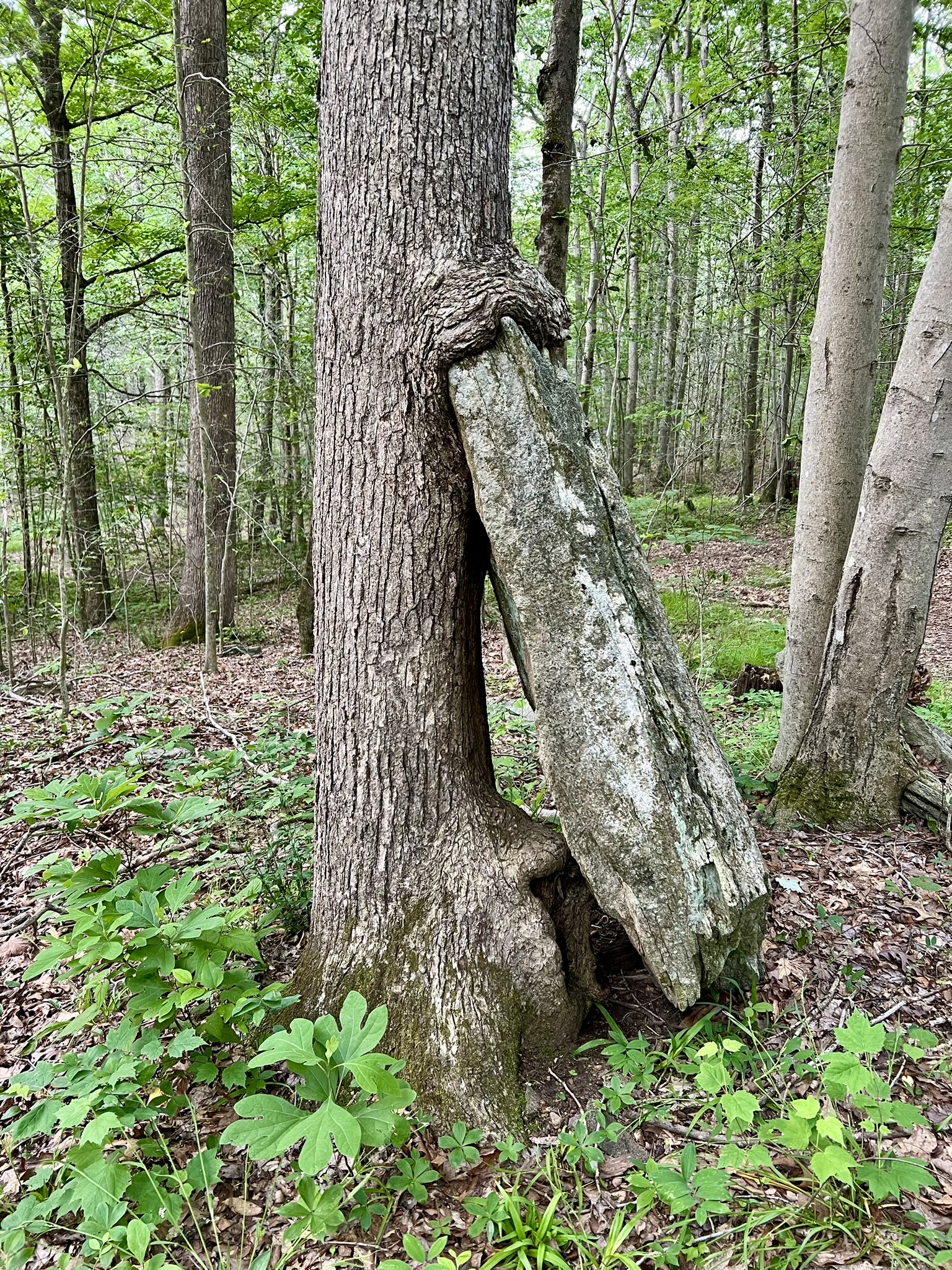 Shortly after passing the beaver lodge the trail leaves the pond and heads south. When you get to a T junction turn right and follow this woods road as it heads west and northwest around the farthest reaches of the marsh. There can be wet, muddy spots. In a few places there are secondary trails that avoid the worst of the mud. The section just before the old bridge is the wettest. The bridge is out so I channel my inner gymnast to cross it — although I’m not suggesting you should. The alternative is to pick your way across the stream. After the bridge the trail splits. I prefer to stay right, but the two paths meet again a short distance on, so either route works (the path to the left is a grassy road). At the next juncture, go left for the longer route – but take a moment to check out the very cool rock-eating tree near the junction. (For the shorter 2.7 mile option turn right here and follow the trail back. There are a few options, but all lead to N. Tower Hill Road). Following the trail to the left will take you to Spruce Ledge Road (there is one trail split on this section where I stayed to the right.) At the forest road, cross over and continue into the woods on another trail almost directly opposite. This next section of trail goes along some scenic ledges in a ravine with a babbling brook. At the brook, I encountered an injured fox on the opposite bank. It tried to scurry up the hill but was hampered by a leg injury. I tried calling the DEEP hotline for dead/injured animals but learned the office wouldn’t open for another 30 minutes so I kept going. When I called back later, I learned the following: there is no rehabilitation program for foxes as they do poorly in captivity, even for a short time. The two options were to let it be and hope it either recovered (foxes are very resilient), or to have DEEP “put it out of its misery” – a comforting euphemism for killing it. The latter they would only consider if I was still there and had “eyeballs” on it, as it would be too difficult to locate otherwise. So in the end, I am glad that I did not stay, as I prefer to imagine that it was able to recover on its own. At the next T junction by another marsh the trail meets the white blazed Quinimay trail. I turned right and followed this trail north, crossing North Tower Hill Road. The trail loops back east and comes out on Spruce Ledge Road. Follow Spruce Ledge Road south, watching for a crossover trail on the left which provides a woods trail shortcut to North Tower Hill Road. From there, turn left and follow the road back to the parking lot.