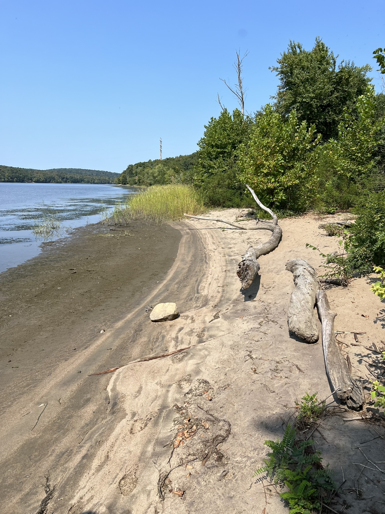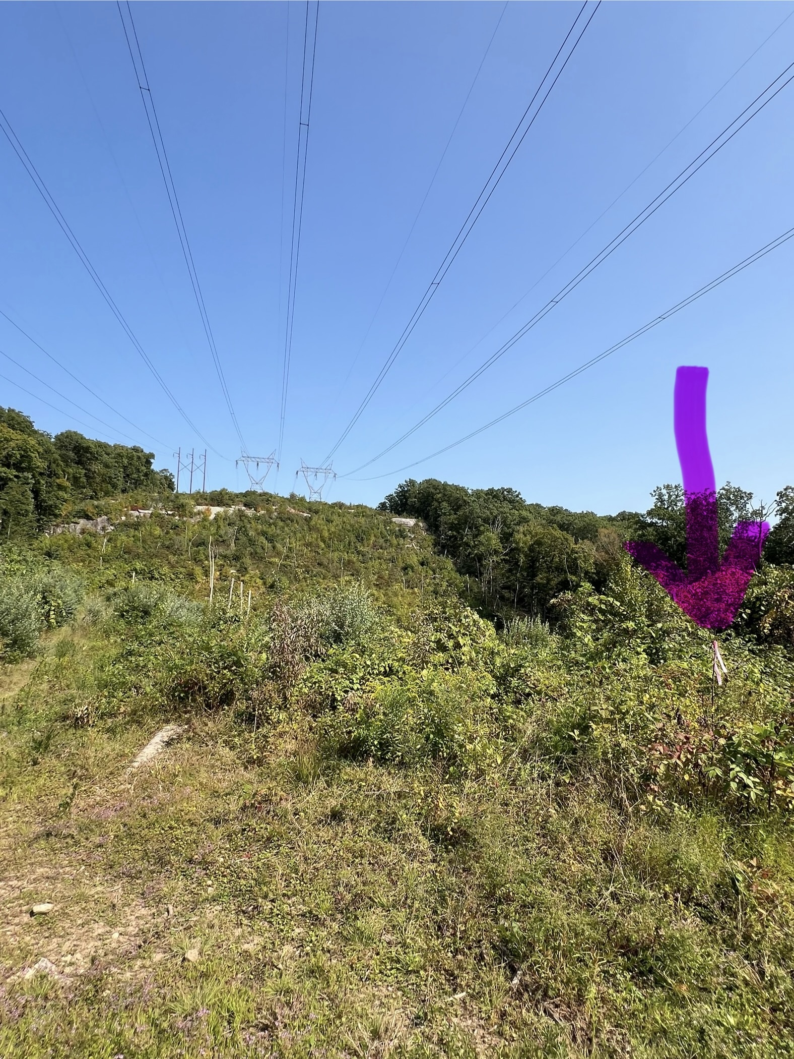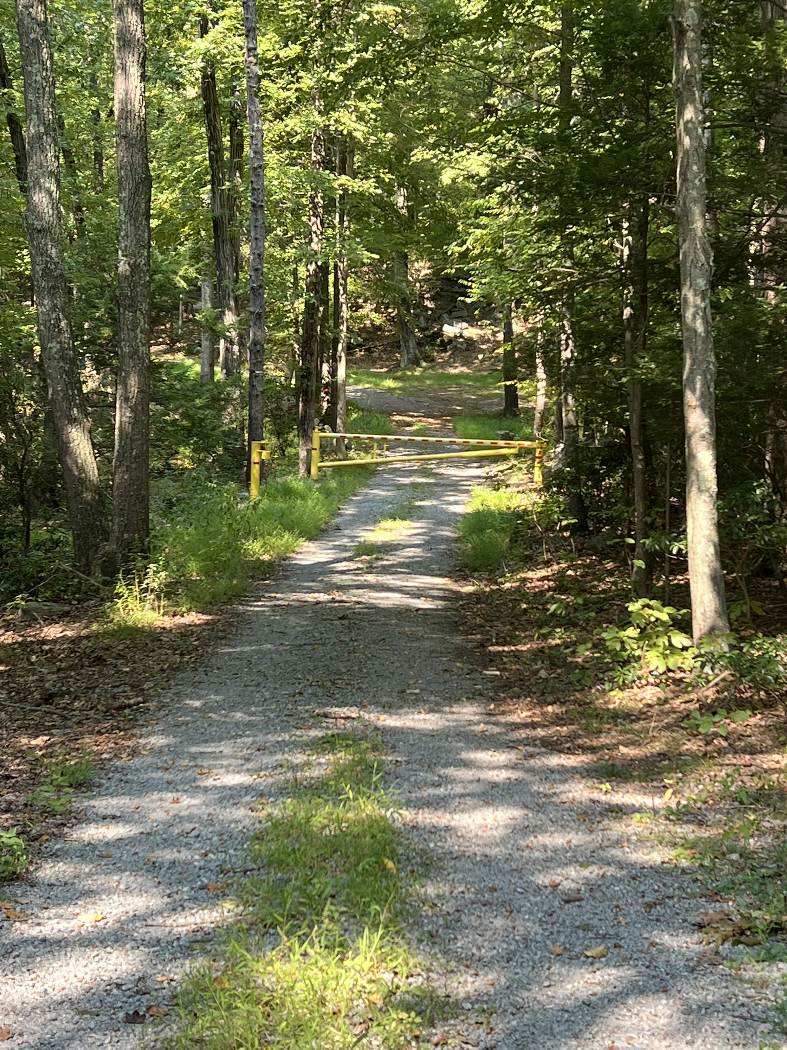 For an easier hike, make this your turnaround point and return the way you came. We continued to do a loop, which may be more enjoyable on a cooler day and after the vegetation has died back. Continuing north, the gravel road begins to parallel the power line corridor, heading steadily uphill in the open, which was unpleasant in the blazing heat. Climbing higher, the trail entered the woods on the left, where there is a yellow gate. We went past the gate and followed the road up and around a rocky outcrop. As the road levels out, we took an unblazed trail on the right. When we reached the power lines again, things got squirrely. This trail is not used much, so it is very faint and we picked our way down some steep, overgrown switchbacks. This is where AllTrails was very useful to ensure we were on the right path. Under the power lines, we noticed a faded pink ribbon that marked the way across. When we reentered the woods, the path became much more navigable, although there were several downed trees that we had to clamber over or around. The trail eventually came back out on the old asphalt drive, which we followed back to our car. Doing the hike as a loop is approximately 3.3 miles with 463’ of ascent. Doing as an out-and-back only as far as the rock by the river would be slightly less.