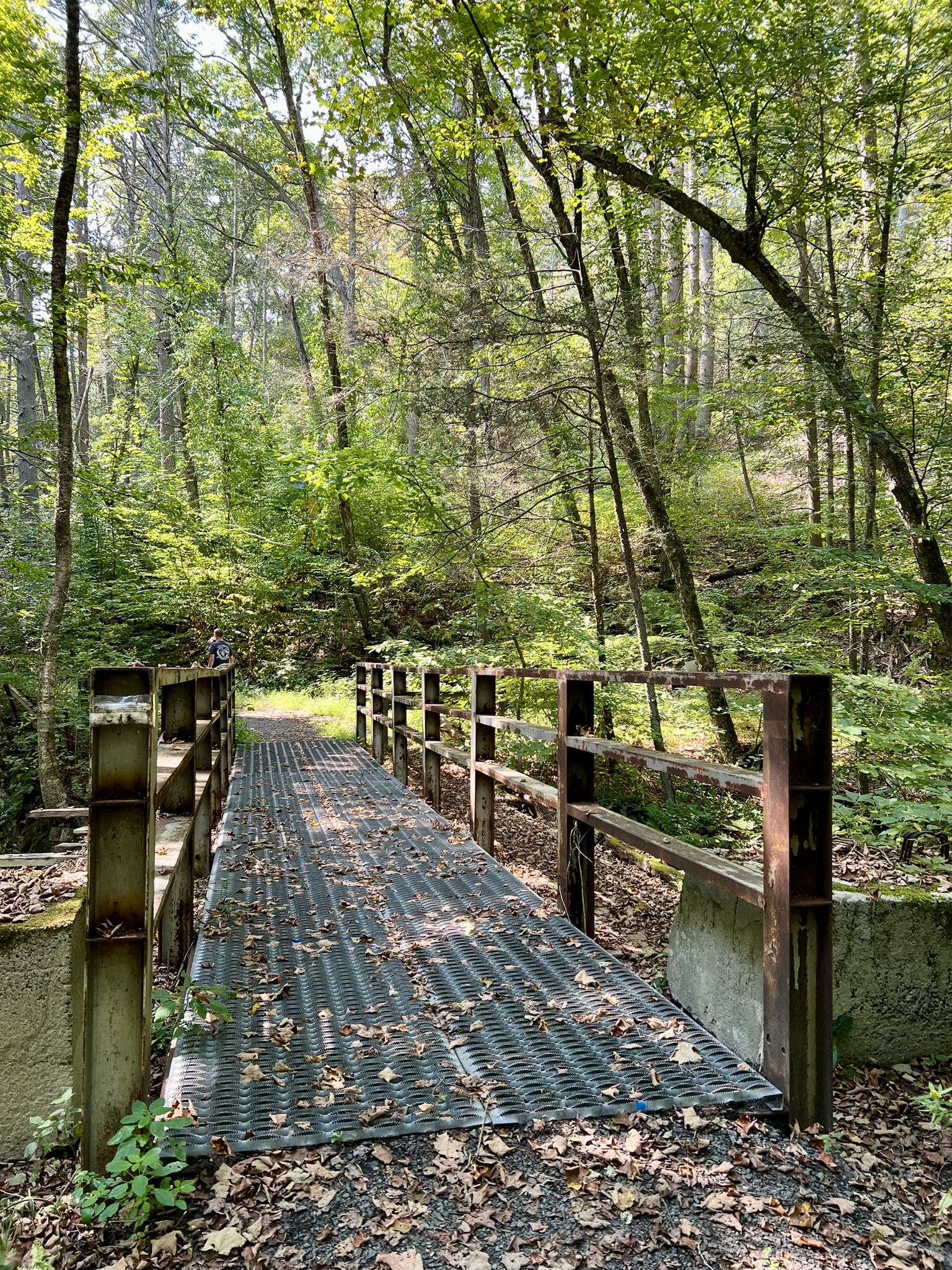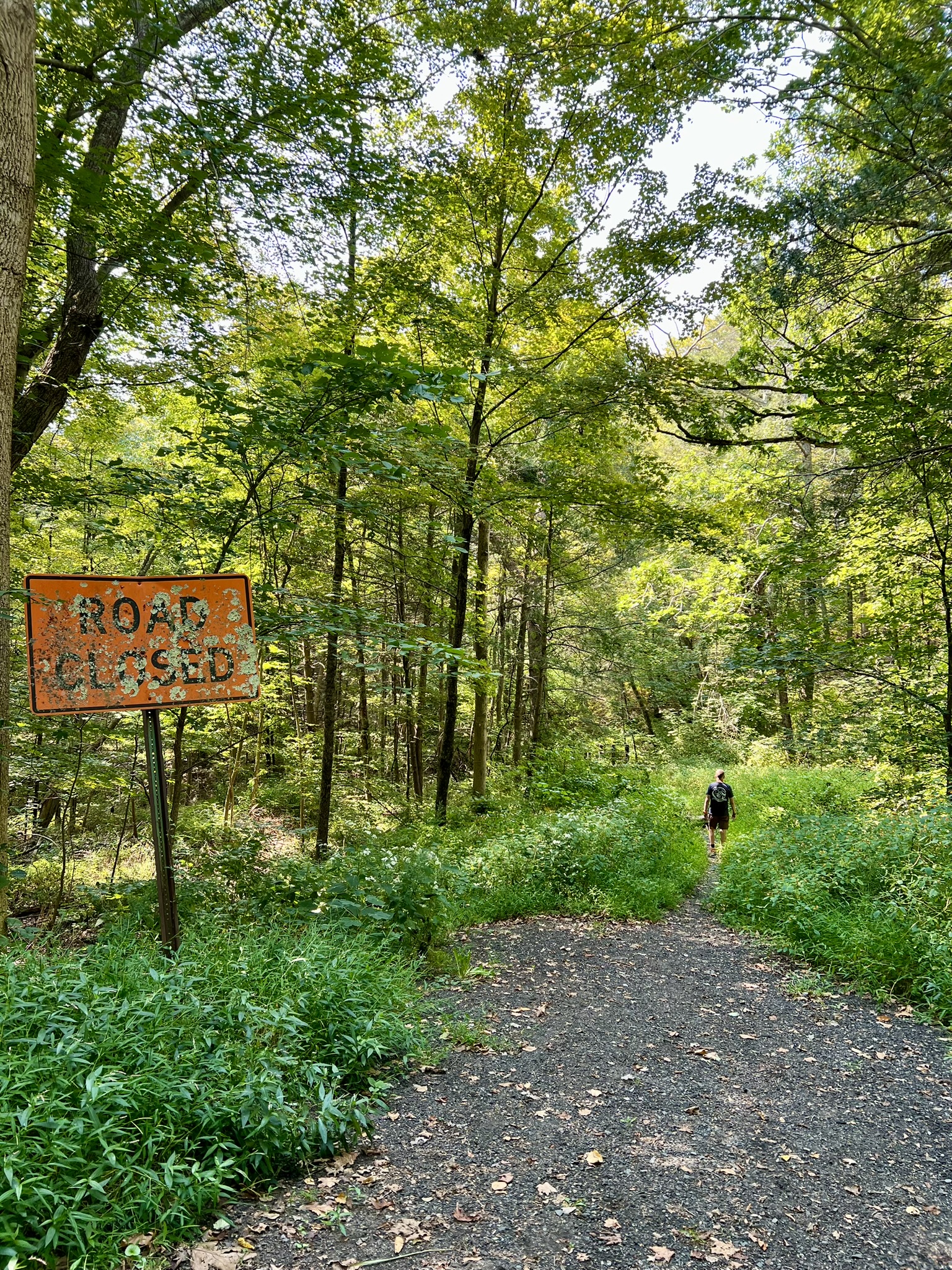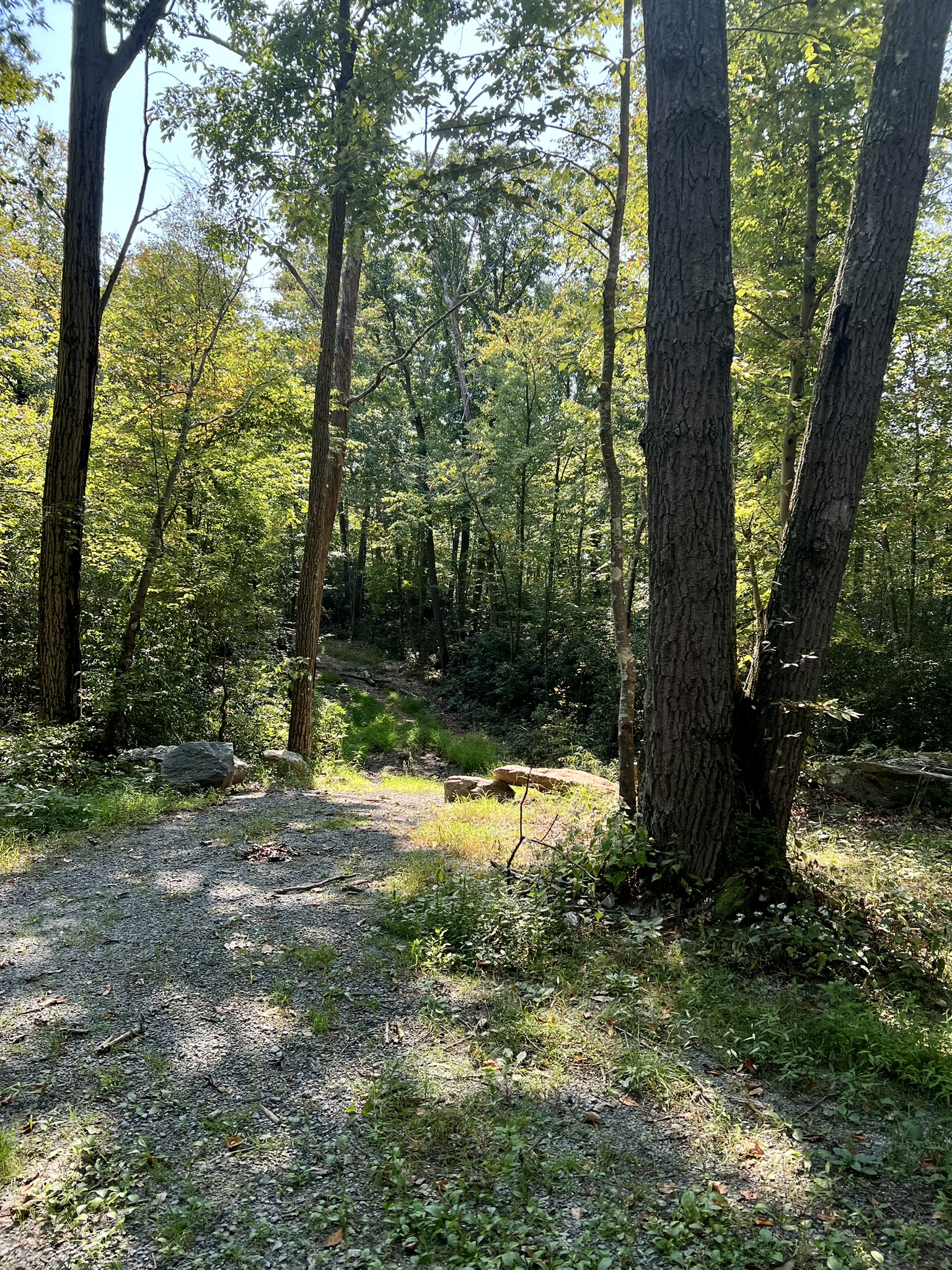 For an easier hike, make this your turnaround point and return the way you came. We continued to do a loop, which may be more enjoyable on a cooler day and after the vegetation has died back. Continuing north, the gravel road begins to parallel the power line corridor, heading steadily uphill in the open, which was unpleasant in the blazing heat. Climbing higher, the trail entered the woods on the left, where there is a yellow gate. We went past the gate and followed the road up and around a rocky outcrop. As the road levels out, we took an unblazed trail on the right. When we reached the power lines again, things got squirrely. This trail is not used much, so it is very faint and we picked our way down some steep, overgrown switchbacks. This is where AllTrails was very useful to ensure we were on the right path. Under the power lines, we noticed a faded pink ribbon that marked the way across. When we reentered the woods, the path became much more navigable, although there were several downed trees that we had to clamber over or around. The trail eventually came back out on the old asphalt drive, which we followed back to our car. Doing the hike as a loop is approximately 3.3 miles with 463’ of ascent. Doing as an out-and-back only as far as the rock by the river would be slightly less.