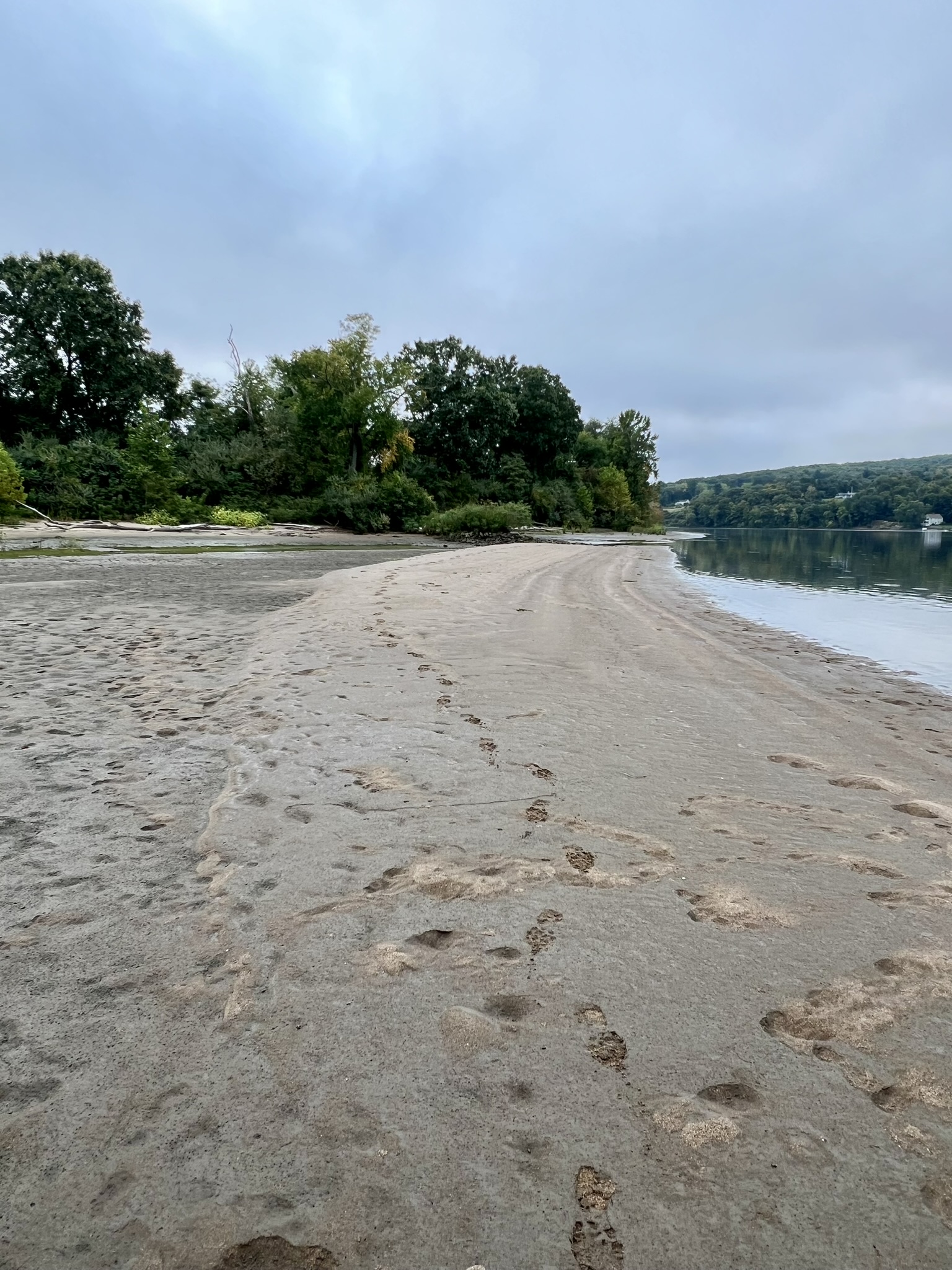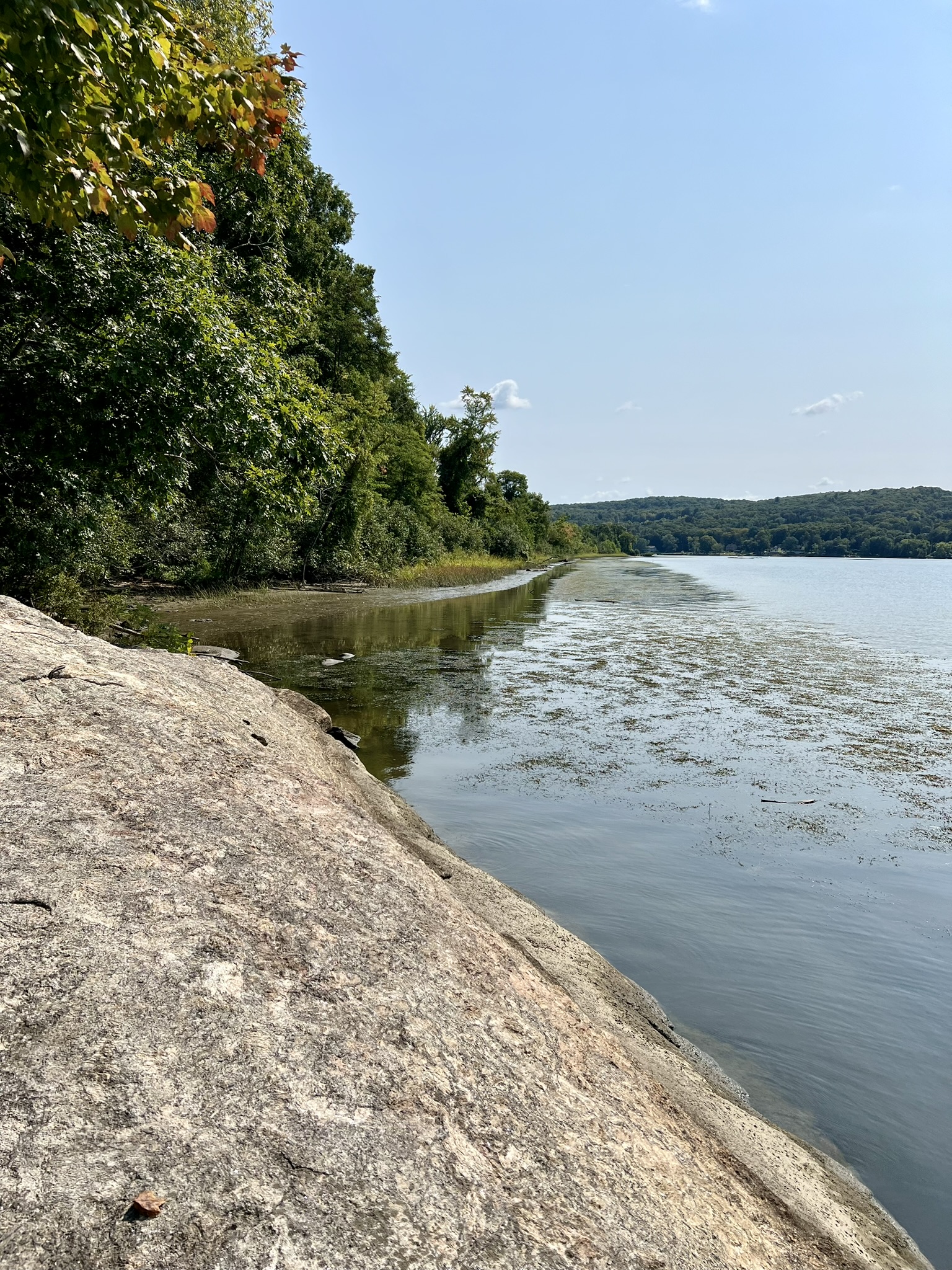 On the map, the path to the left goes south toward the Higganum Meadows Wildlife Management Area and an alleged viewing spot along the river. Because it was so hot we skipped that path. I came back on an overcast morning and discovered that the mowed section only goes about halfway to the supposed scenic spot, so I opted to turn around rather than bushwhack through the tall grass. The mowed path straight ahead goes to the Connecticut River. Matt does not recommend this, probably because it was not well mowed at the time of his visit. We followed the path just a short distance and came to a lovely section of beach. I checked it out again on my return visit and the tide was so low I could walk through to an adjacent beach and out onto a large sandbar. I highly recommend checking it out. Swan Hill Preserve and the entrance to Higganum Cove are directly across the river. As I was standing there two swans flew by low to the river heading downstream, honking at full volume. The path to the right heads north through the meadow into Hurd State Park. Just past the kiosk where the path turns to gravel, watch for a spur trail on the left that goes to a scenic boulder ledge along the river. Look for the Park USGS survey marker embedded in the rock.