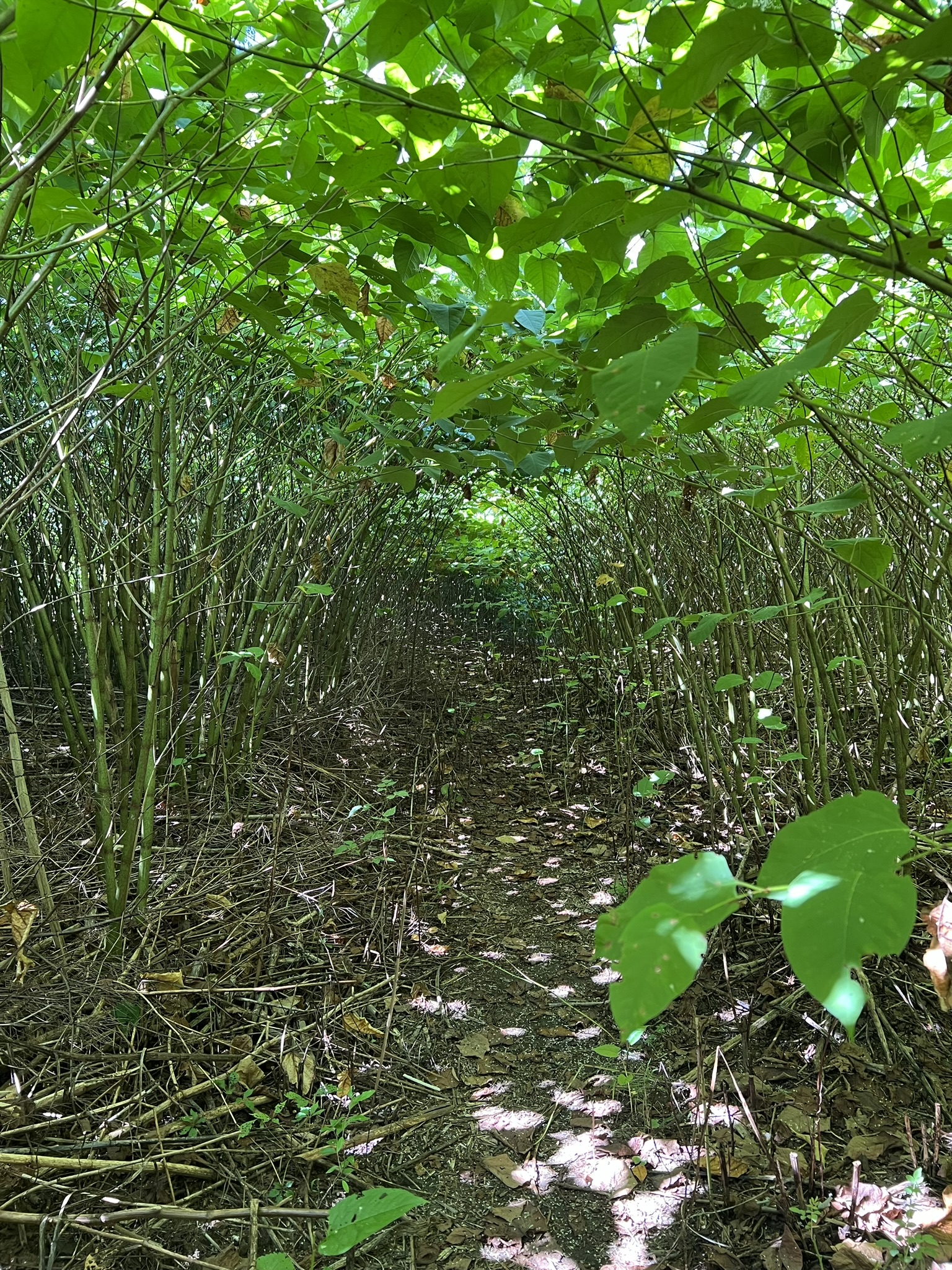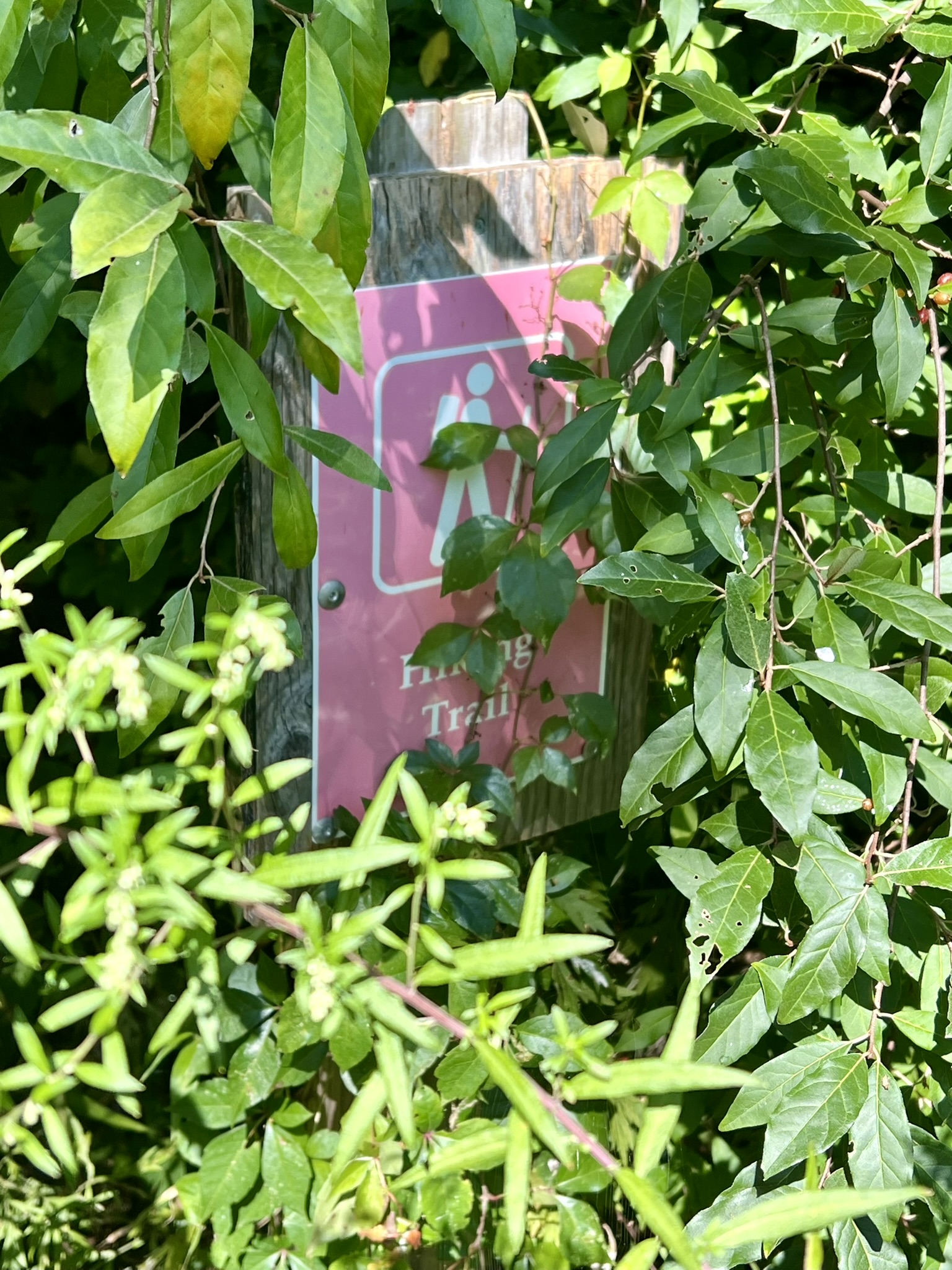 We located the large, well-kept parking area on Maple Street, but the trail was another story. The overgrown “Hiking Trail” sign that we eventually discovered in the underbrush should have been a dead giveaway. We plowed ahead nonetheless. At first things seemed promising, with some pretty views of the river. But after a short distance we encountered thick growth crowding the trail. Passing under a closed arbor of Japanese knotweed we reached a point where the brambles were so thick I decided I couldn’t subject my intrepid team nor myself to any more of it. I aborted the hike, much to my team’s relief, and we returned to our vehicle. Plan B was to head to the southern entrance of Scantic River State Park’s eastern parcel and attempt the trails from the other direction.