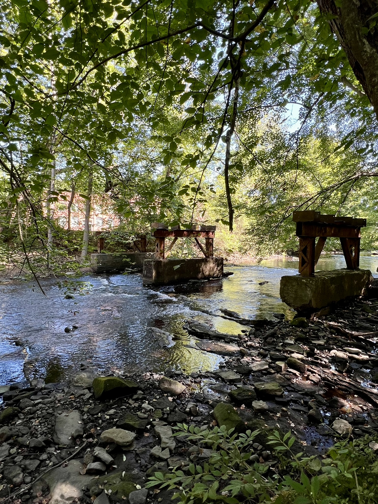 (from left to right: remains of the Upper Falls Dam; a serene spot along the river; the bridge abutment to the New Works; a remnant on the far bank, possibly from the Glazing Mill
