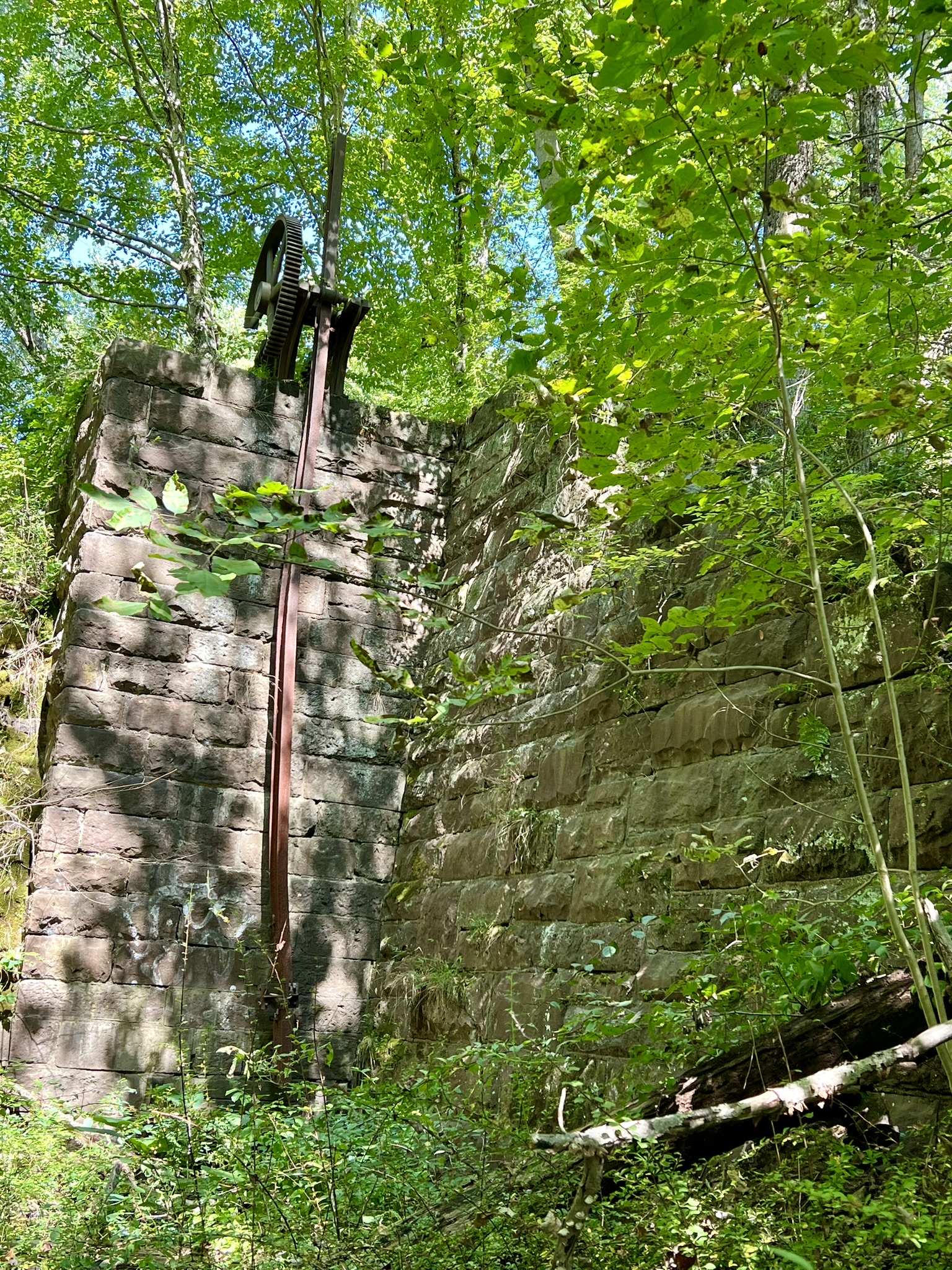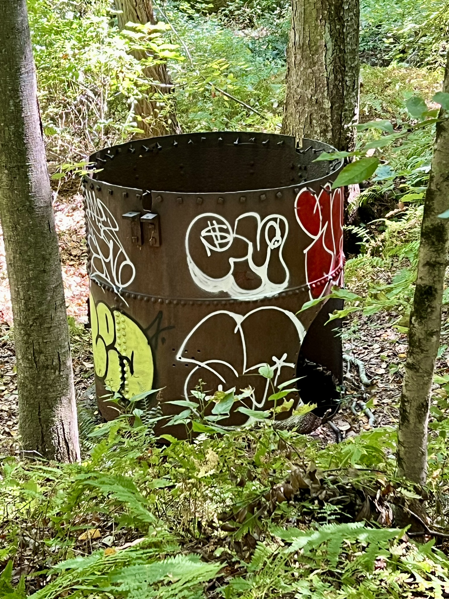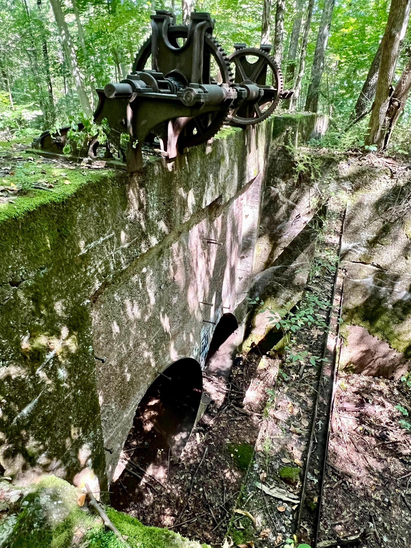 Back to the trail! Picking our way down a short, steep section from the top of the sluice gate we momentarily lost the trail, but with the help of AllTrails were able to figure it out. Although the main loop is supposedly blazed yellow, in reality the blazes are few and far between and the trail itself was overgrown with ferns. At least there were fewer brambles to contend with. We found ourselves walking along a raised section of ground that appeared manmade and followed what we guessed was an old raceway. We spotted several graffiti covered ruins that we later learned were the remains of the turbine housings for various mills (a glazing mill and a graining mill). At the far western turn in the trail we came upon the raceway controls and sluice gates. From there we relied on AllTrails to help us locate the trail back to the parking lot. It is possible that this trail is more manageable once the leaves have fallen, but I would still only recommend it if you feel comfortable navigating using a map and AllTrails, and you don’t mind some amount of bushwhacking.