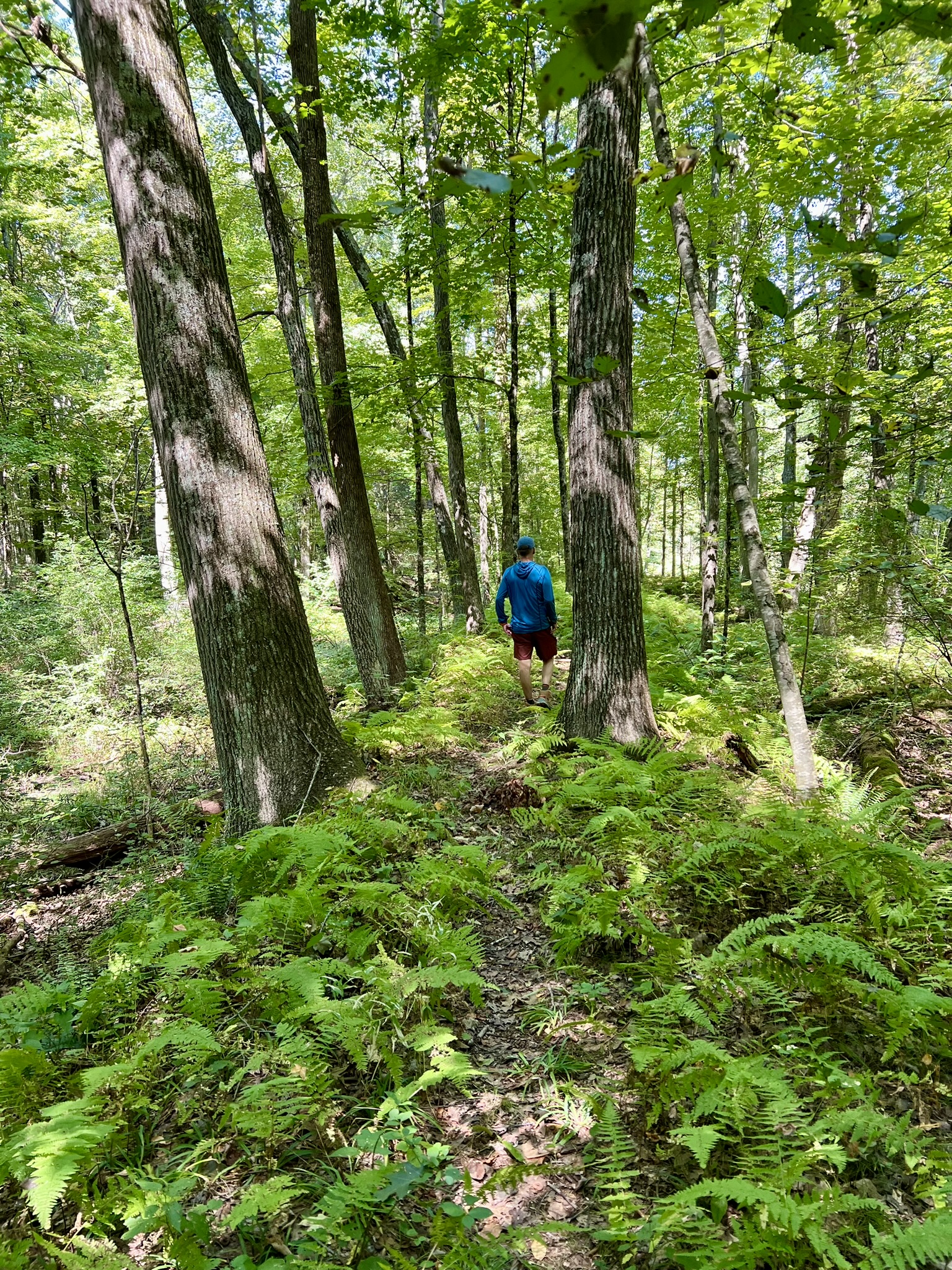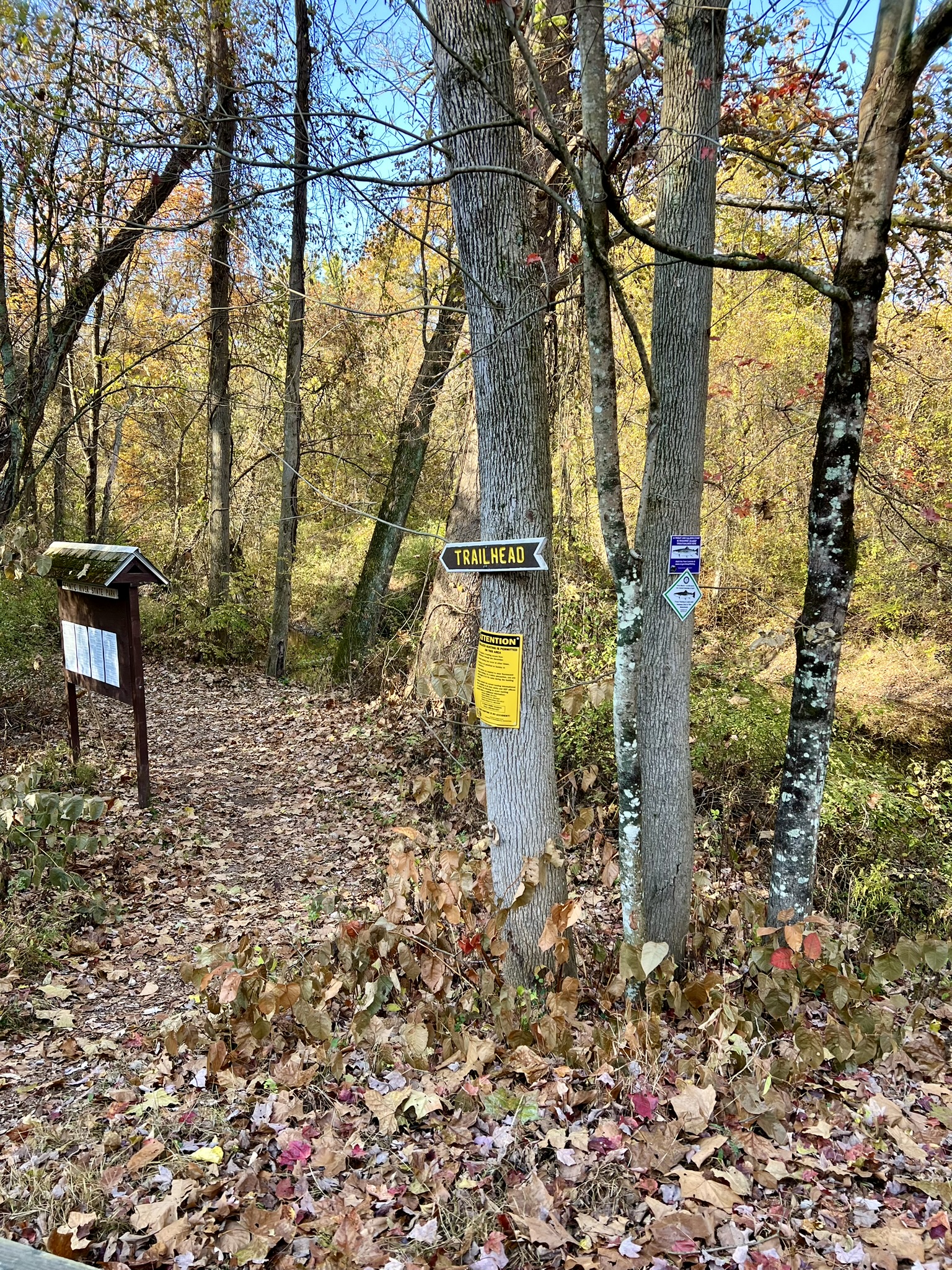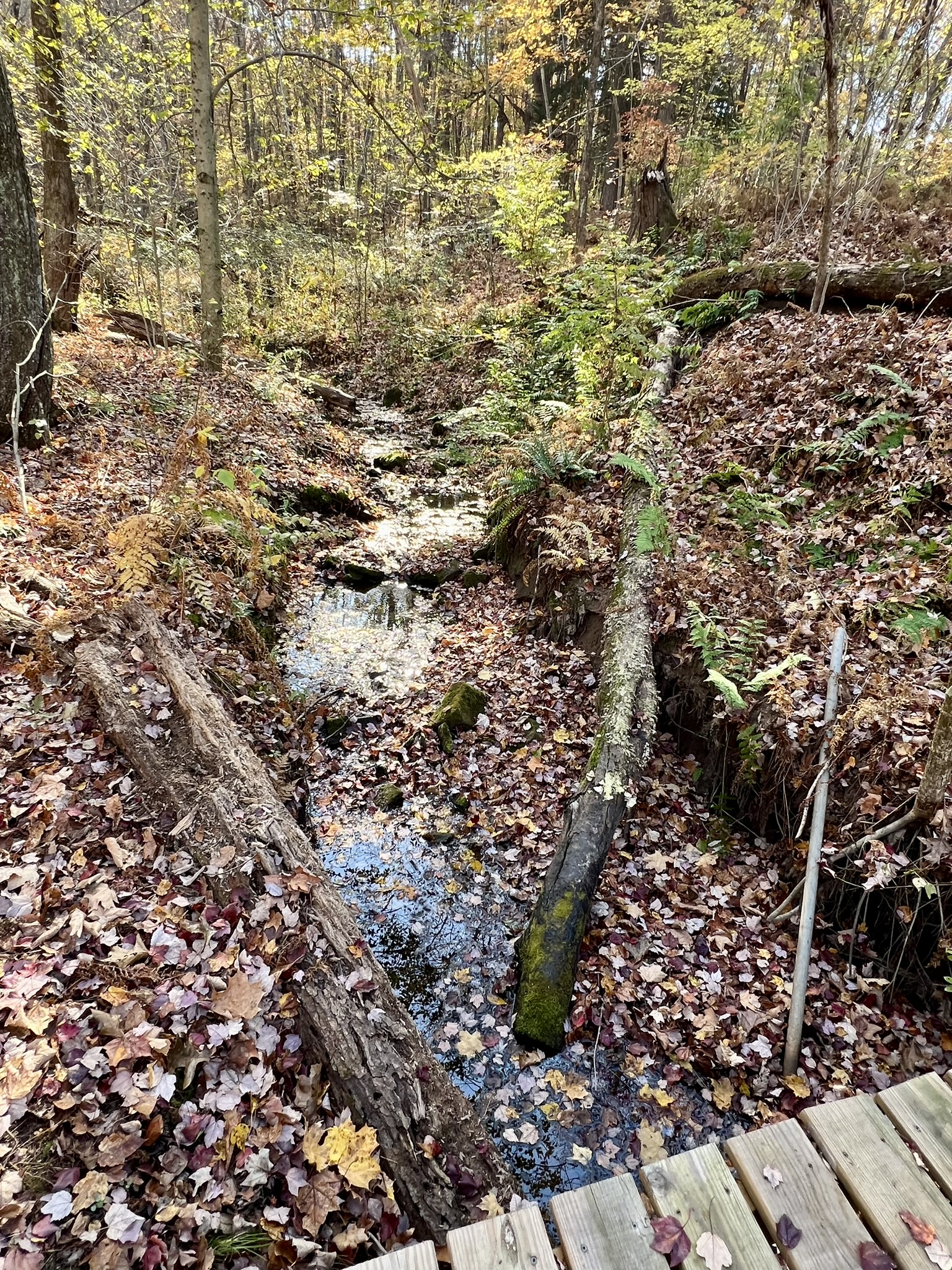 We returned the following week to hike the yellow blazed trail, this time wearing our fluorescent orange as a precaution. We chose to hike in a counter-clockwise direction, starting along the river. The trail was easy to follow, meandering through a landscape of brush and young trees. There are a dozen wooden bridges that span small creeks and muddy sections. In several places we noted the erosion along both the river and creeks and imagined the landscape must look very different at higher water. There are a few places where spur trails cut out from the main trail so it was helpful to follow the route using both the map and AllTrails. As the trail rose it became more wooded and less brambly. Nearing the last section we opted for the far right path of the Ridge Loop which went along the highest part of the ridge. The trail then descended back down through brush and back to the road.