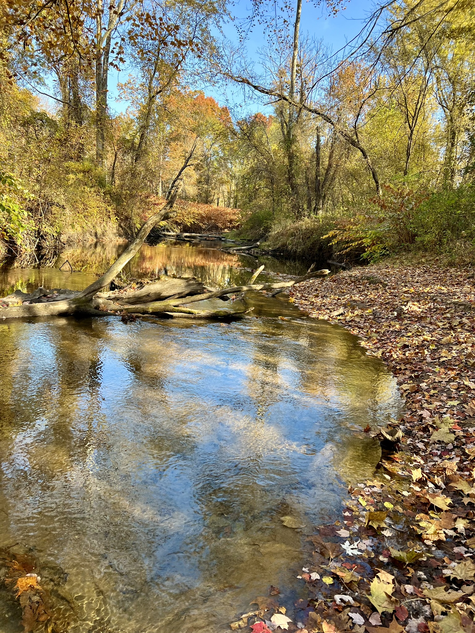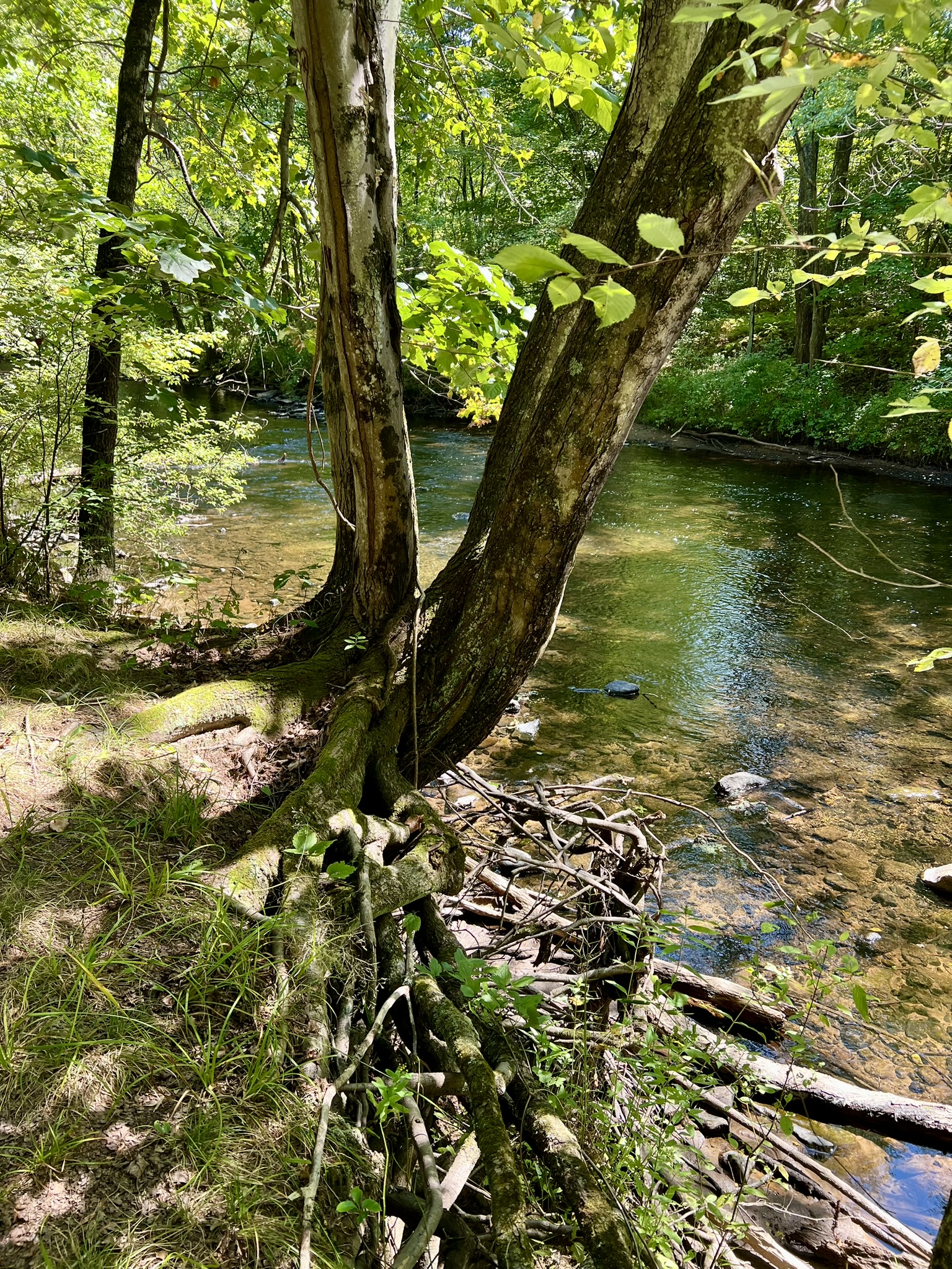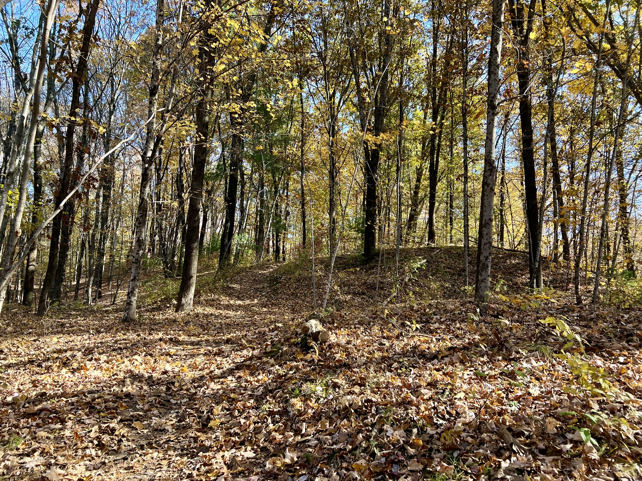 We returned the following week to hike the yellow blazed trail, this time wearing our fluorescent orange as a precaution. We chose to hike in a counter-clockwise direction, starting along the river. The trail was easy to follow, meandering through a landscape of brush and young trees. There are a dozen wooden bridges that span small creeks and muddy sections. In several places we noted the erosion along both the river and creeks and imagined the landscape must look very different at higher water. There are a few places where spur trails cut out from the main trail so it was helpful to follow the route using both the map and AllTrails. As the trail rose it became more wooded and less brambly. Nearing the last section we opted for the far right path of the Ridge Loop which went along the highest part of the ridge. The trail then descended back down through brush and back to the road.