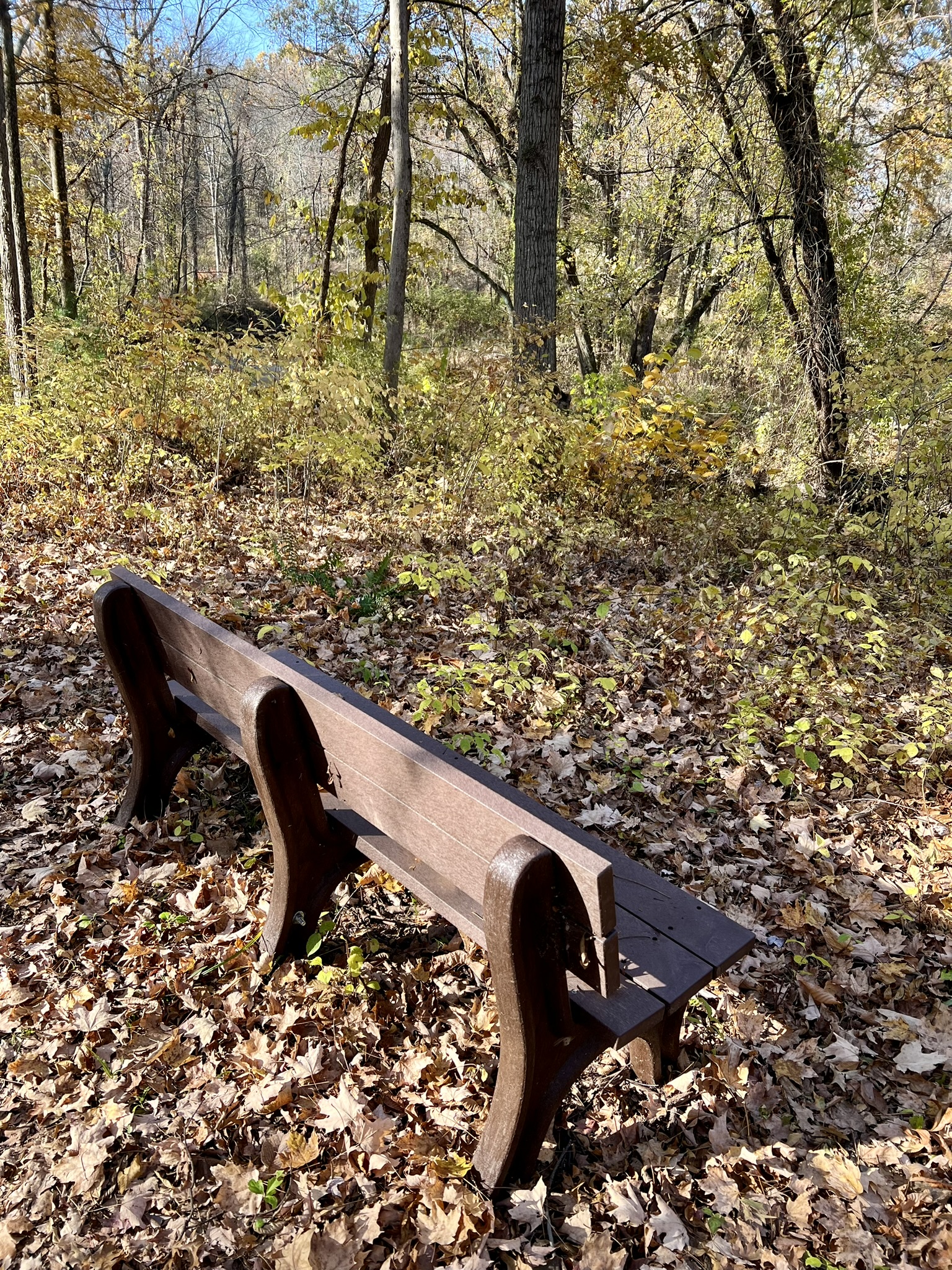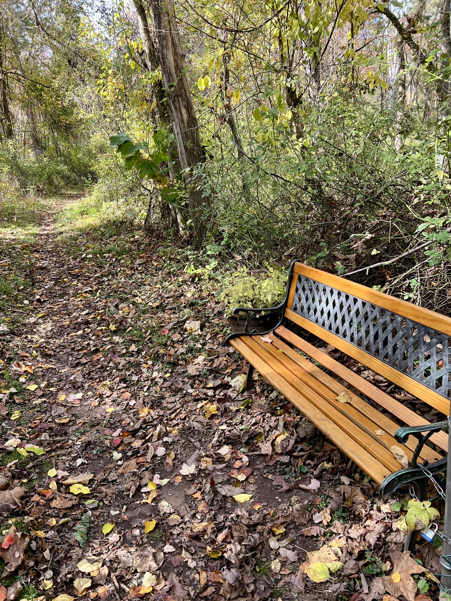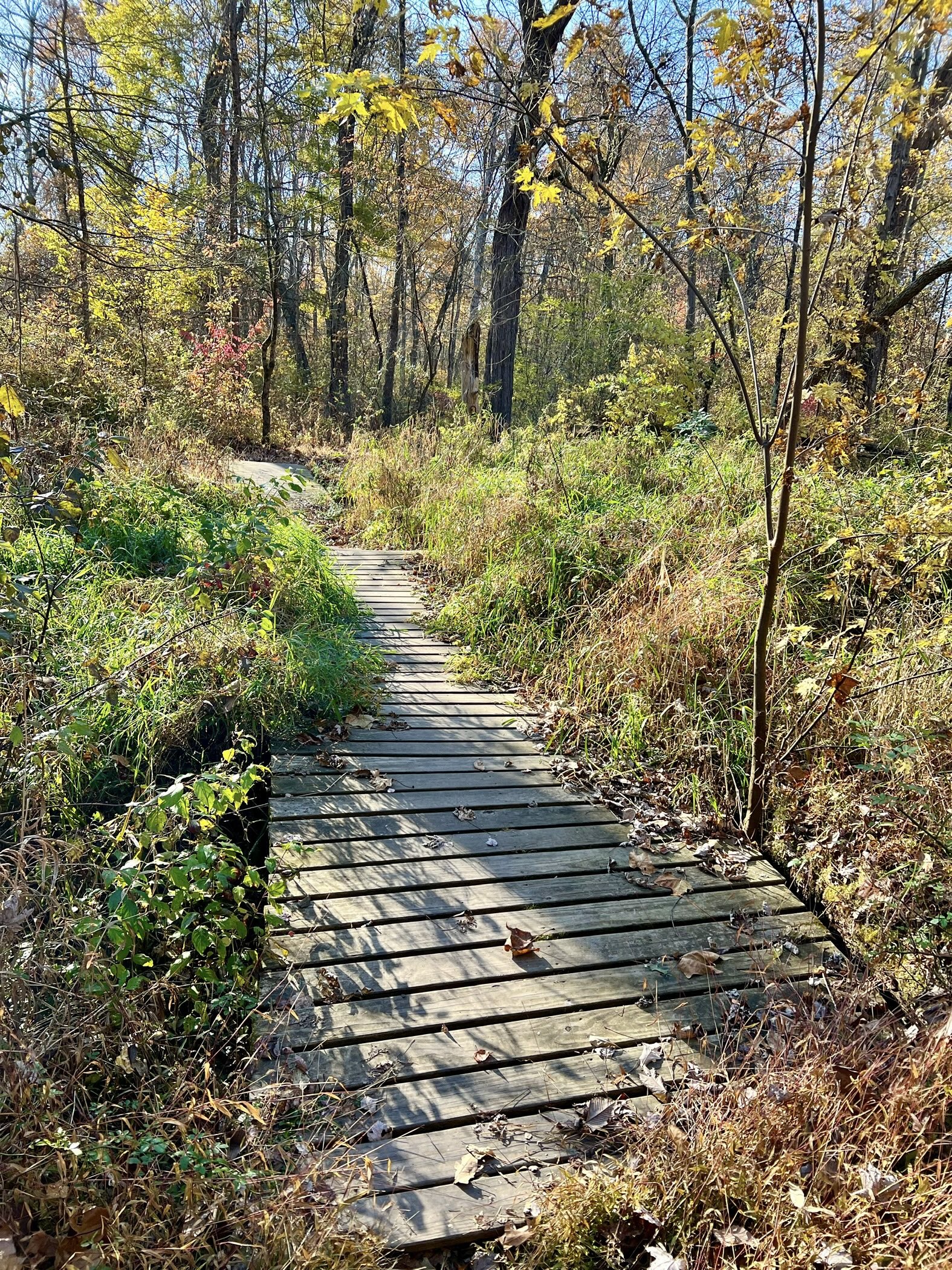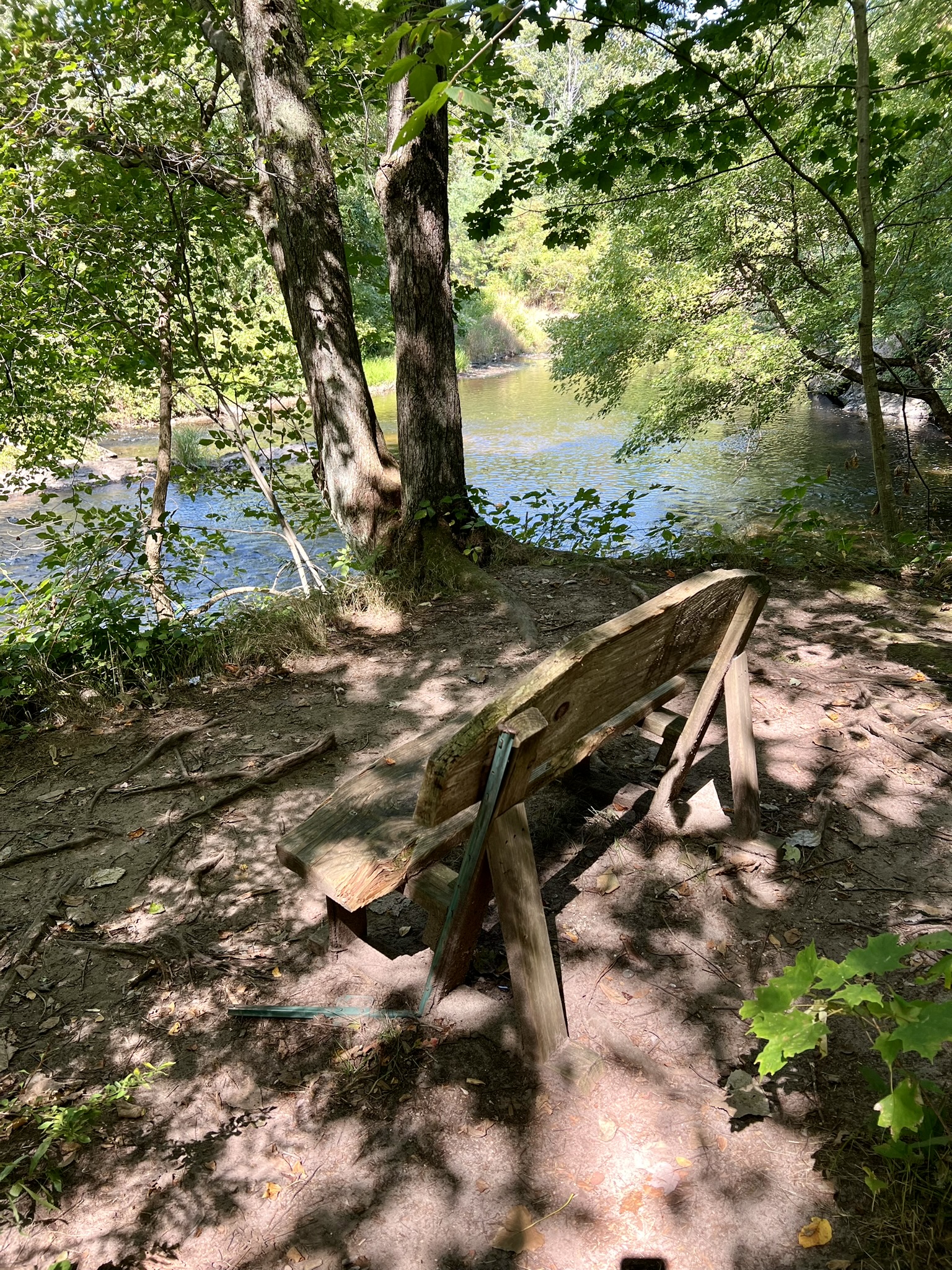 From left to right: The trail above the river; a contemplation bench along the trail; the overgrown boardwalk
