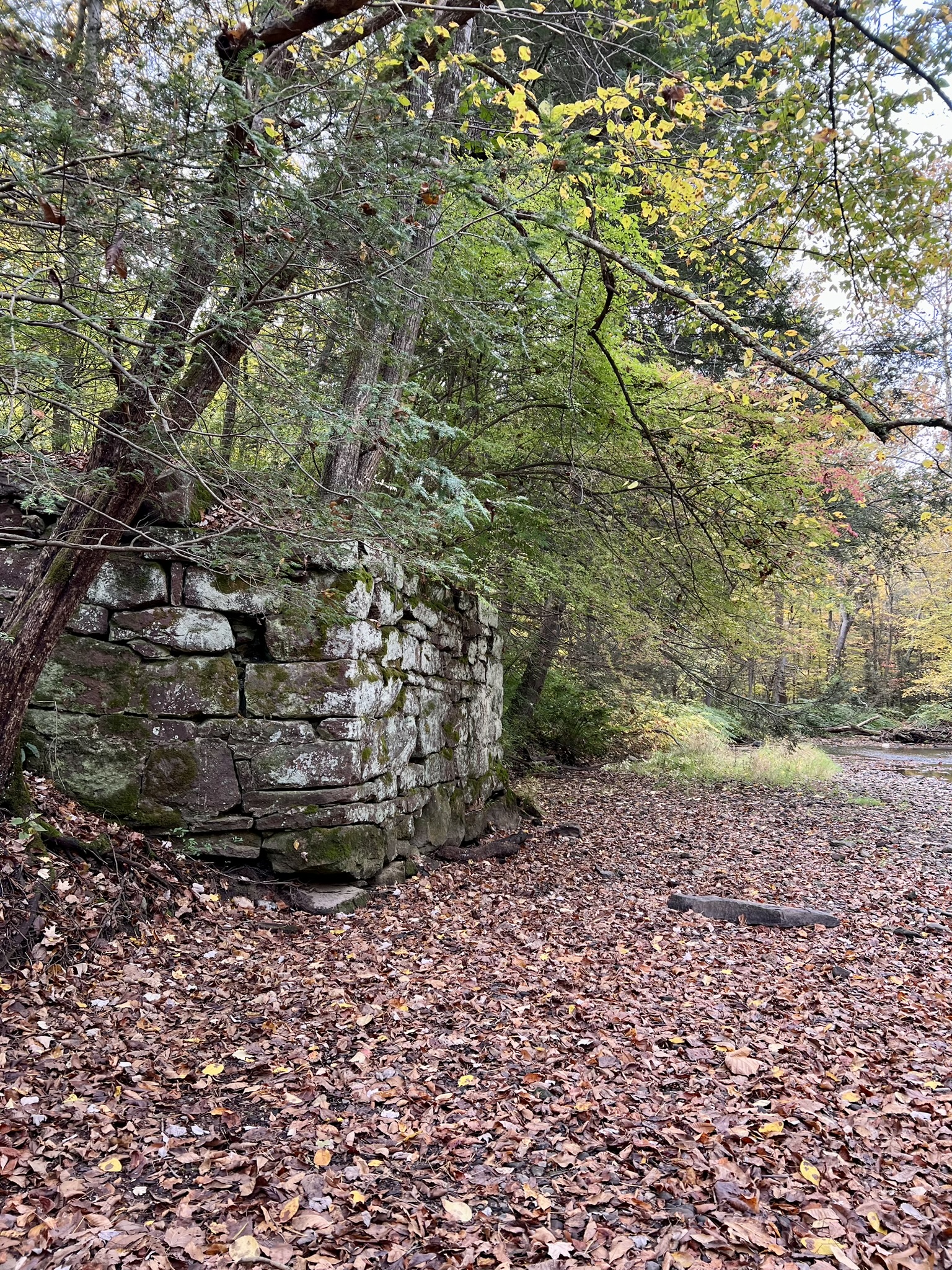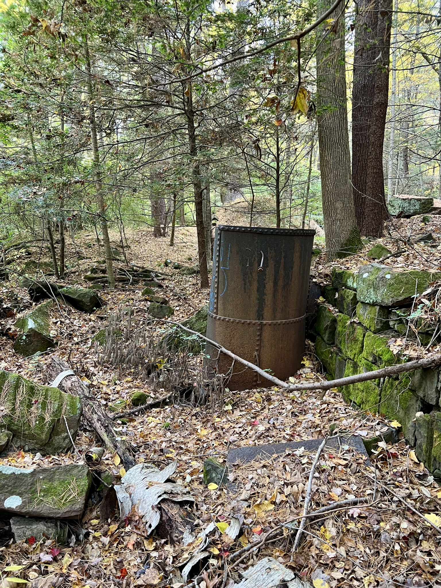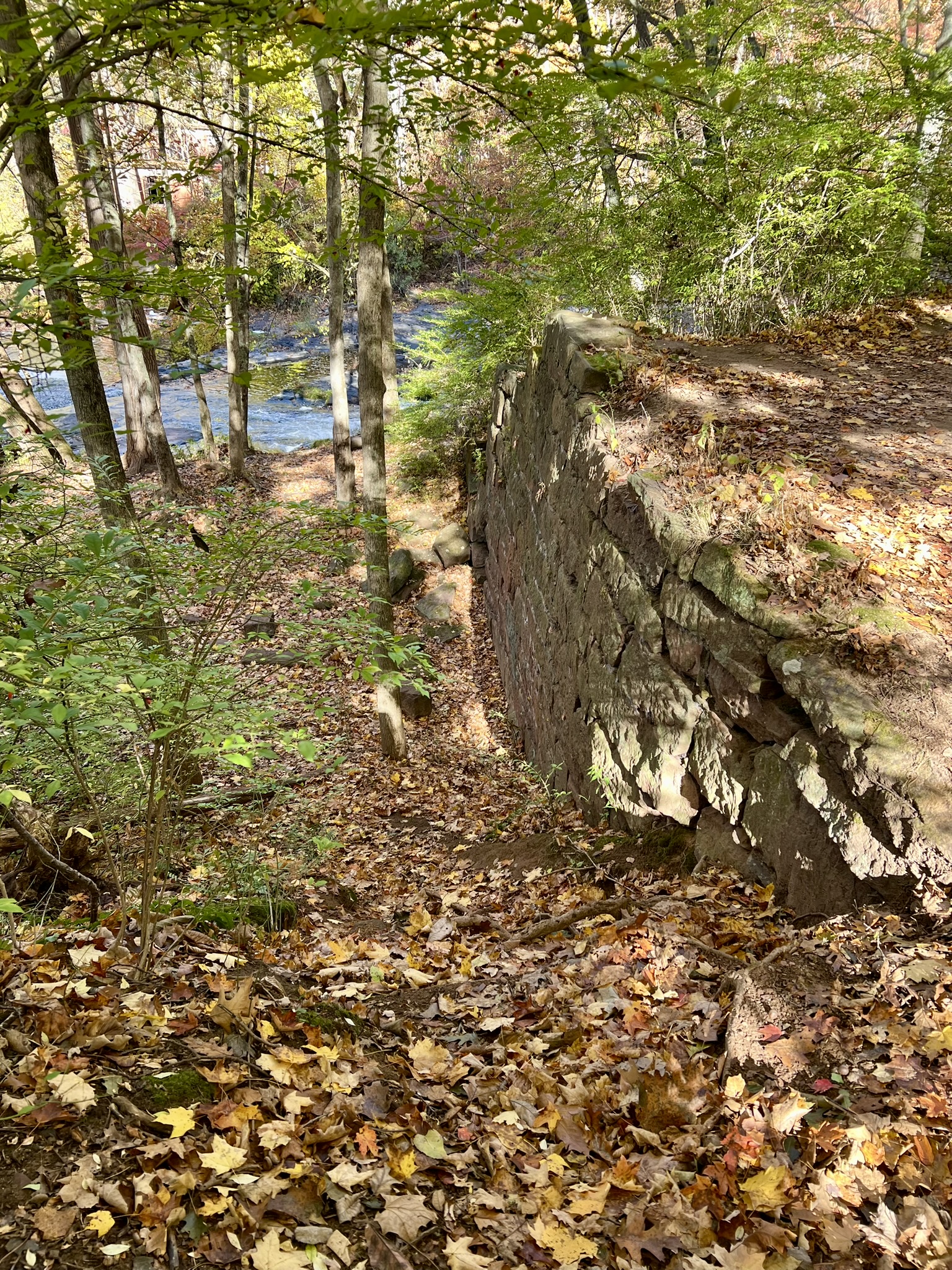 Sue and I returned the following week on a gorgeous, balmy late October day to hike the outer loop which includes the upper ridgeline. After our first visit we met a local hiker on the East Windsor parcel who was knowledgeable about the history. He asked if we had done the upper ridge trail, mentioning that while the mills were in operation the lower banks were flooded and much of the material had to be brought in by teams of horses from up above. He said the numerous paths visible along the way going steeply from the upper ridge down to the river were for that purpose. Intrigued, we planned a final trip to Enfield to explore this trail and the East Windsor parcel. On our second visit, just past the kiosk we took the very steep trail on the right to access the ridge. NOTE: All of our visits occurred during the fall drought weather. I imagine many of the trails can be challenging in wet/muddy times, especially this steep section. Once on the ridge, the trail follows an easy and scenic path through woods dotted with seemingly healthy hemlocks. The embankment down to the river is very steep, and once all the leaves come down I imagine there will be periodic views of the river. We did indeed notice several side paths that veer straight downhill as had been described to us. The trails are not blazed so this AllTrails link helped us stay on course. The one tricky section was at the point where the trail heads back down to the river. The first junction was denoted with some well-placed logs on either side of the trail entrance. The next junction, near the start of the steep downhill, we took the trail to the right which was conveniently marked with neon yellow/green paint. Upon reaching the river the trail loops back to the west (left). The trail map shows a bench, which turned out to be two folding chairs set up on the riverbank! This was the perfect snack spot and we dawdled here for some time enjoying the warm weather, the sound of running water and the beautiful fall colors. (Before we left we moved the chairs further up onto the bank). From there, we continued along the trail, taking a second look at many of the ruins of the Hazard Powder Company. Walking in this stunning setting, reclaimed by nature over the past 111 years, it was mind-boggling to think that at one time this entire length of river valley was once studded with over 120 structures running an enterprise that employed as many as 200 men in its heyday.