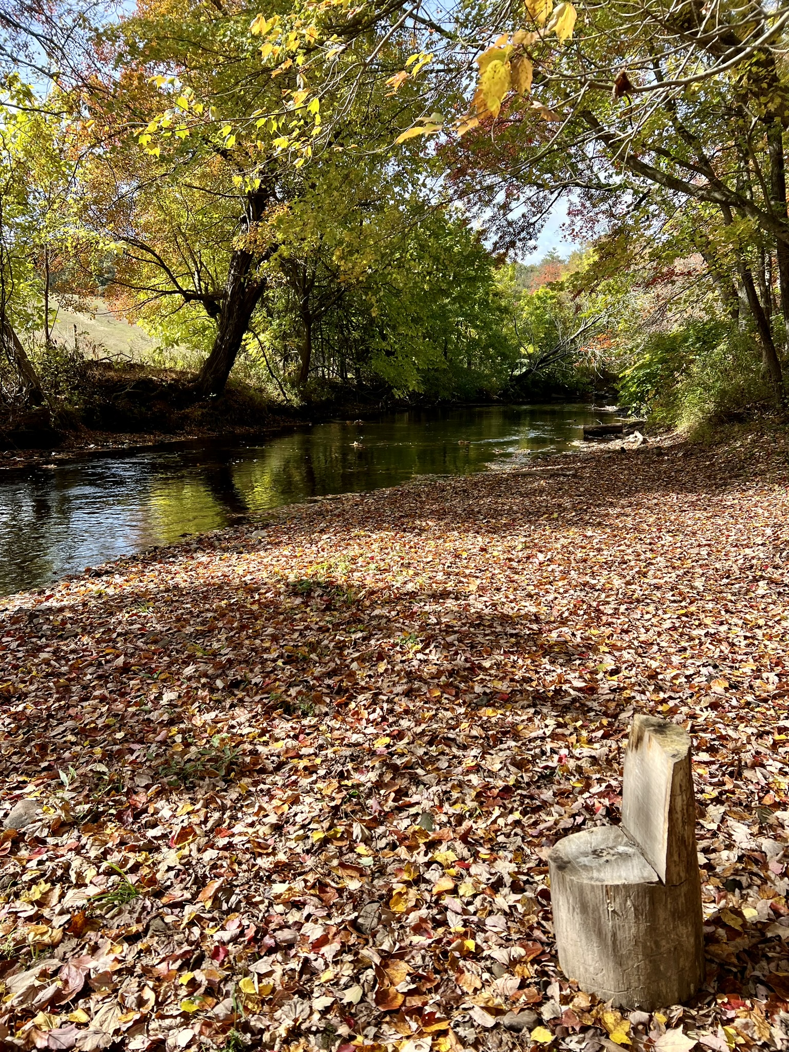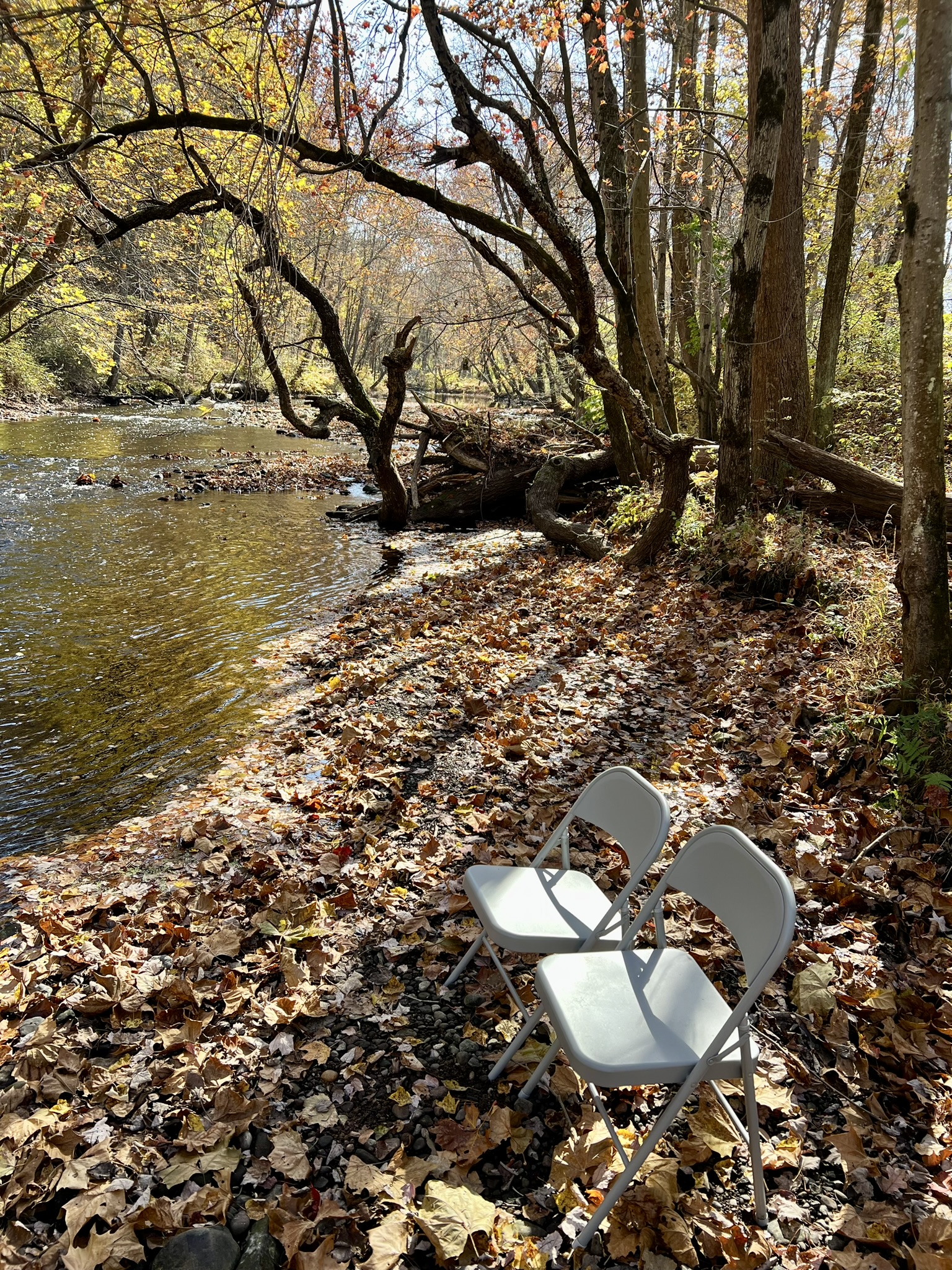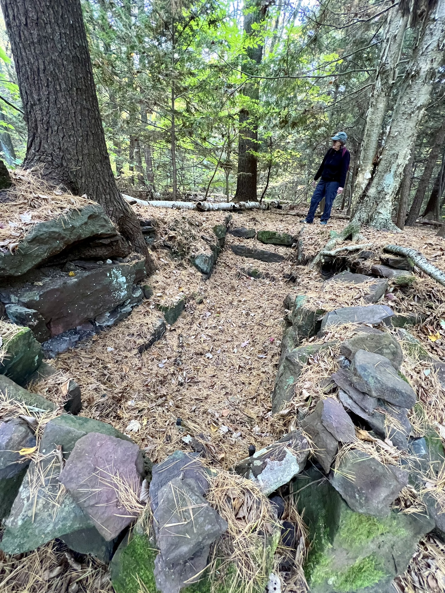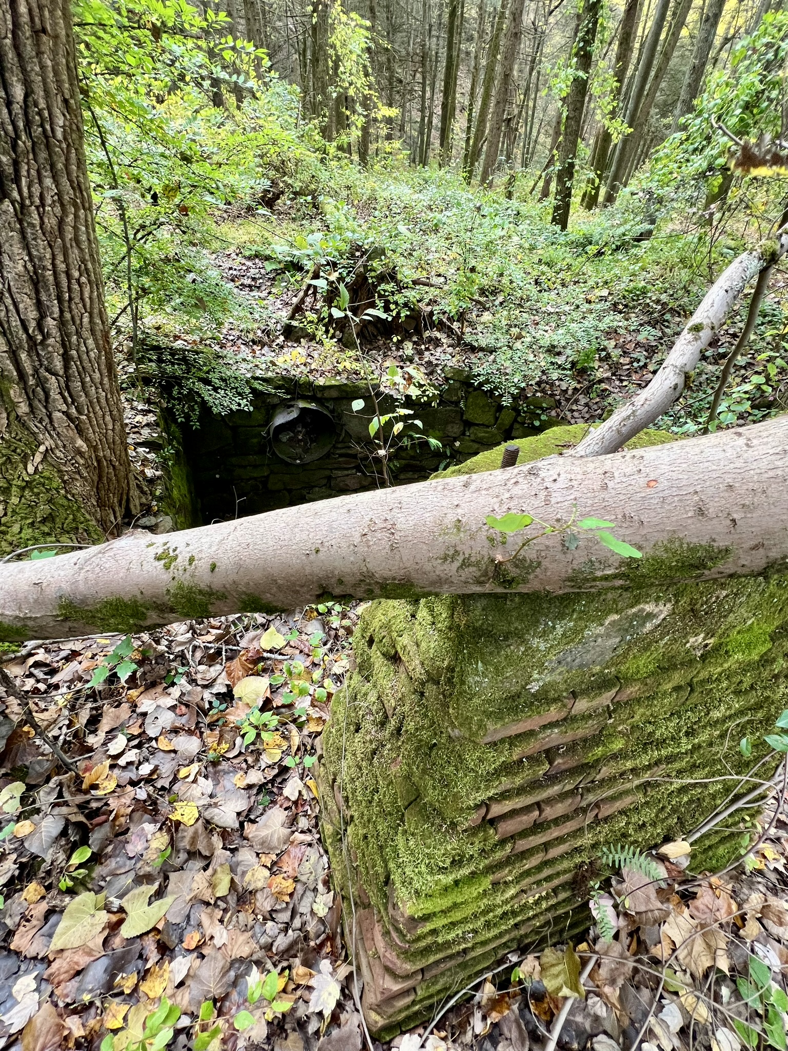 Sue and I returned the following week on a gorgeous, balmy late October day to hike the outer loop which includes the upper ridgeline. After our first visit we met a local hiker on the East Windsor parcel who was knowledgeable about the history. He asked if we had done the upper ridge trail, mentioning that while the mills were in operation the lower banks were flooded and much of the material had to be brought in by teams of horses from up above. He said the numerous paths visible along the way going steeply from the upper ridge down to the river were for that purpose. Intrigued, we planned a final trip to Enfield to explore this trail and the East Windsor parcel. On our second visit, just past the kiosk we took the very steep trail on the right to access the ridge. NOTE: All of our visits occurred during the fall drought weather. I imagine many of the trails can be challenging in wet/muddy times, especially this steep section. Once on the ridge, the trail follows an easy and scenic path through woods dotted with seemingly healthy hemlocks. The embankment down to the river is very steep, and once all the leaves come down I imagine there will be periodic views of the river. We did indeed notice several side paths that veer straight downhill as had been described to us. The trails are not blazed so this AllTrails link helped us stay on course. The one tricky section was at the point where the trail heads back down to the river. The first junction was denoted with some well-placed logs on either side of the trail entrance. The next junction, near the start of the steep downhill, we took the trail to the right which was conveniently marked with neon yellow/green paint. Upon reaching the river the trail loops back to the west (left). The trail map shows a bench, which turned out to be two folding chairs set up on the riverbank! This was the perfect snack spot and we dawdled here for some time enjoying the warm weather, the sound of running water and the beautiful fall colors. (Before we left we moved the chairs further up onto the bank). From there, we continued along the trail, taking a second look at many of the ruins of the Hazard Powder Company. Walking in this stunning setting, reclaimed by nature over the past 111 years, it was mind-boggling to think that at one time this entire length of river valley was once studded with over 120 structures running an enterprise that employed as many as 200 men in its heyday.