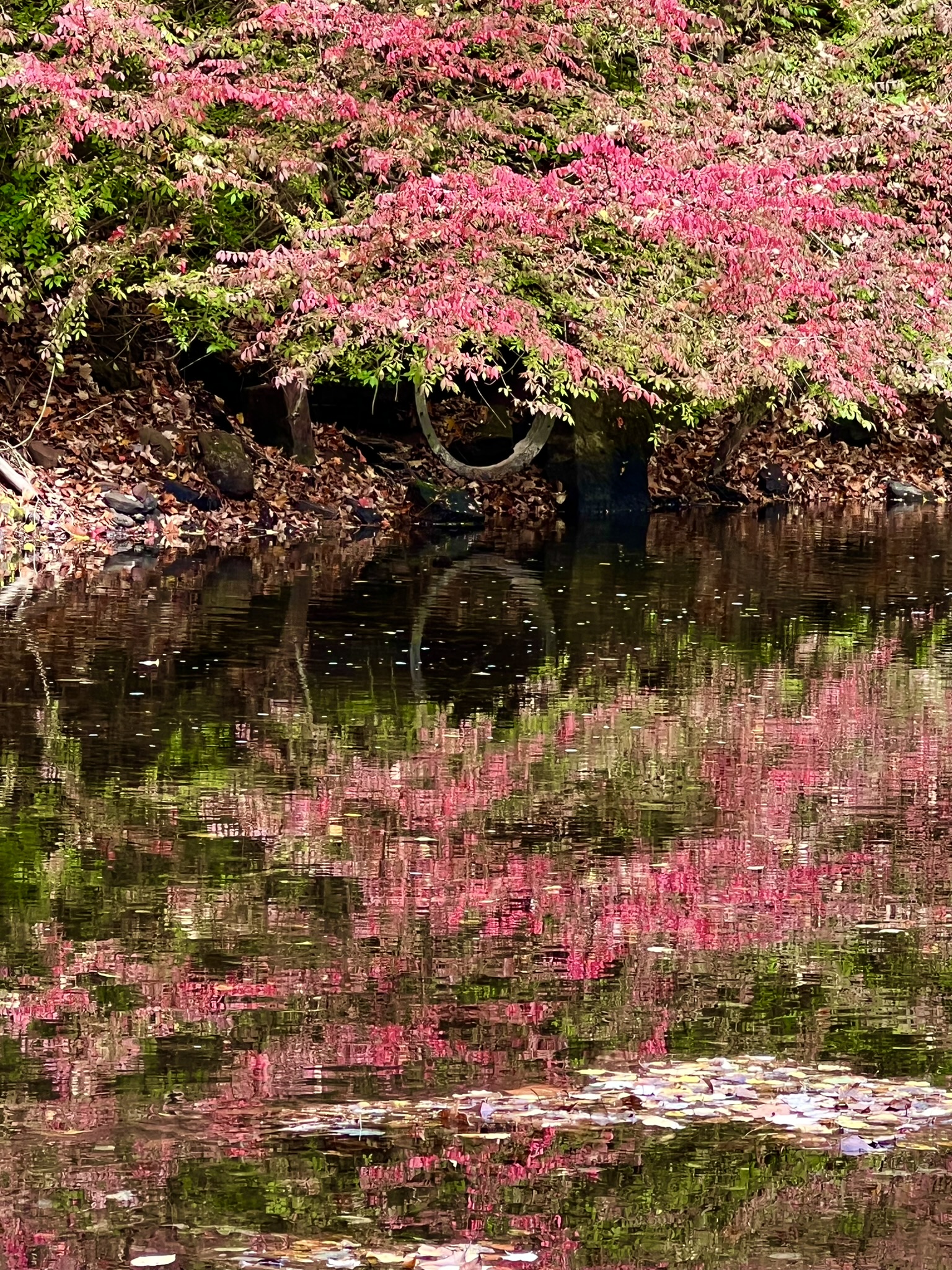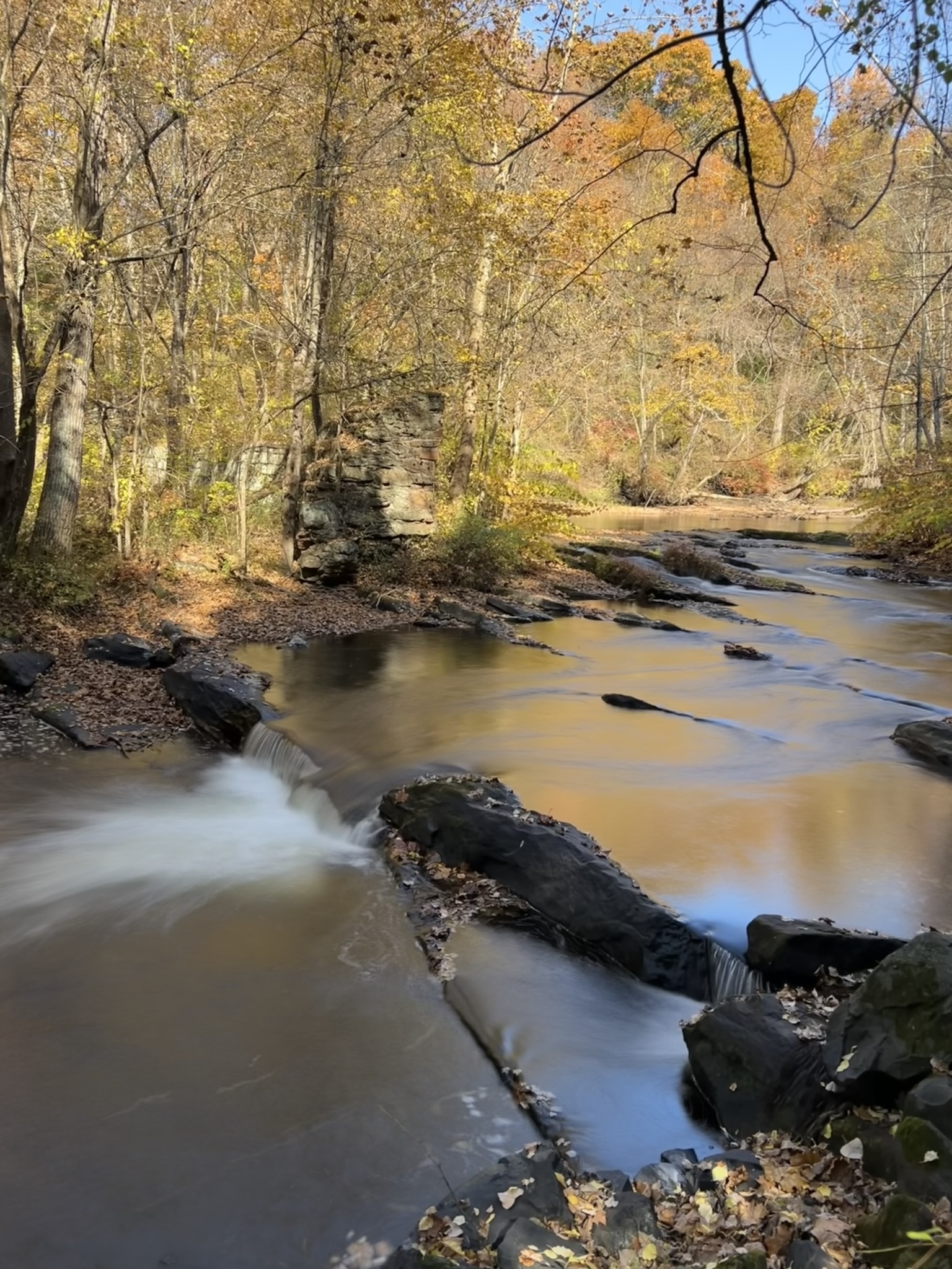 In Google Maps use: Scantic River State Park, Powder Hollow Block. Sue and I returned to Enfield on a chilly mid-October day to explore the “Hazardville” section. This time we arrived armed with the “historic tour” map from Matt’s blog post and the DEEP map. I had a printed copy of the history map so I could see the layout more clearly, and a digital copy for zooming in on the small writing. Driving down South Maple Street from Hazard Ave, the parking lot is on the left immediately after crossing the bridge. This is apparently a popular place, especially on summer weekends, with only 8 or 9 parking spots, so I recommend planning your visit accordingly. Take note of the red barn on the right just before the bridge. This was the original Hazard Powder Company horse barn. All the trails in this section are unmarked, but much easier to discern than the Scitico section. From the kiosk we took the trail to the far left which heads to the river. Almost immediately, we came upon the first listed ruin, the Upper Falls Dam. We continued along the river admiring the fall colors and scenic views at every turn. Several of the ruins are on the opposite bank and trickier to spot. Initially I was using the map in conjunction with AllTrails to locate the designated ruins. Then I came upon a better solution. The historic tour map includes GPS coordinates for each feature so I began to copy and paste the coordinates into Google Maps. While Google Maps doesn’t show the trails, it helped us more accurately locate our position in the field. (If you haven’t done this before, please know that you have to delete the “degree” symbol “o” to get it to work).