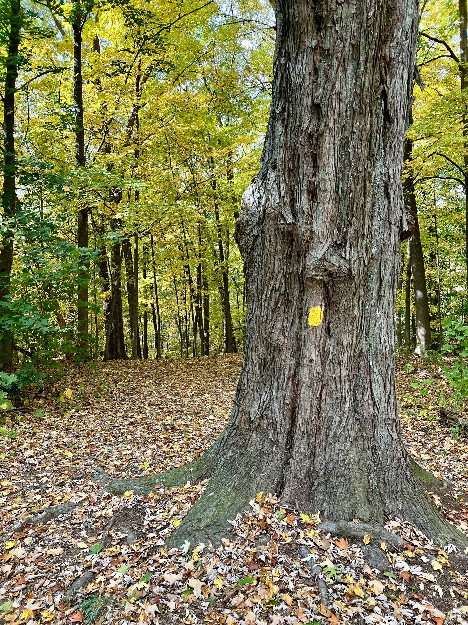 from left to right: the steep, eroded trail to the ridge; hemlock woods along the ridgetop; yellow marks helped guide us down; the “bench” offered the perfect rest stop