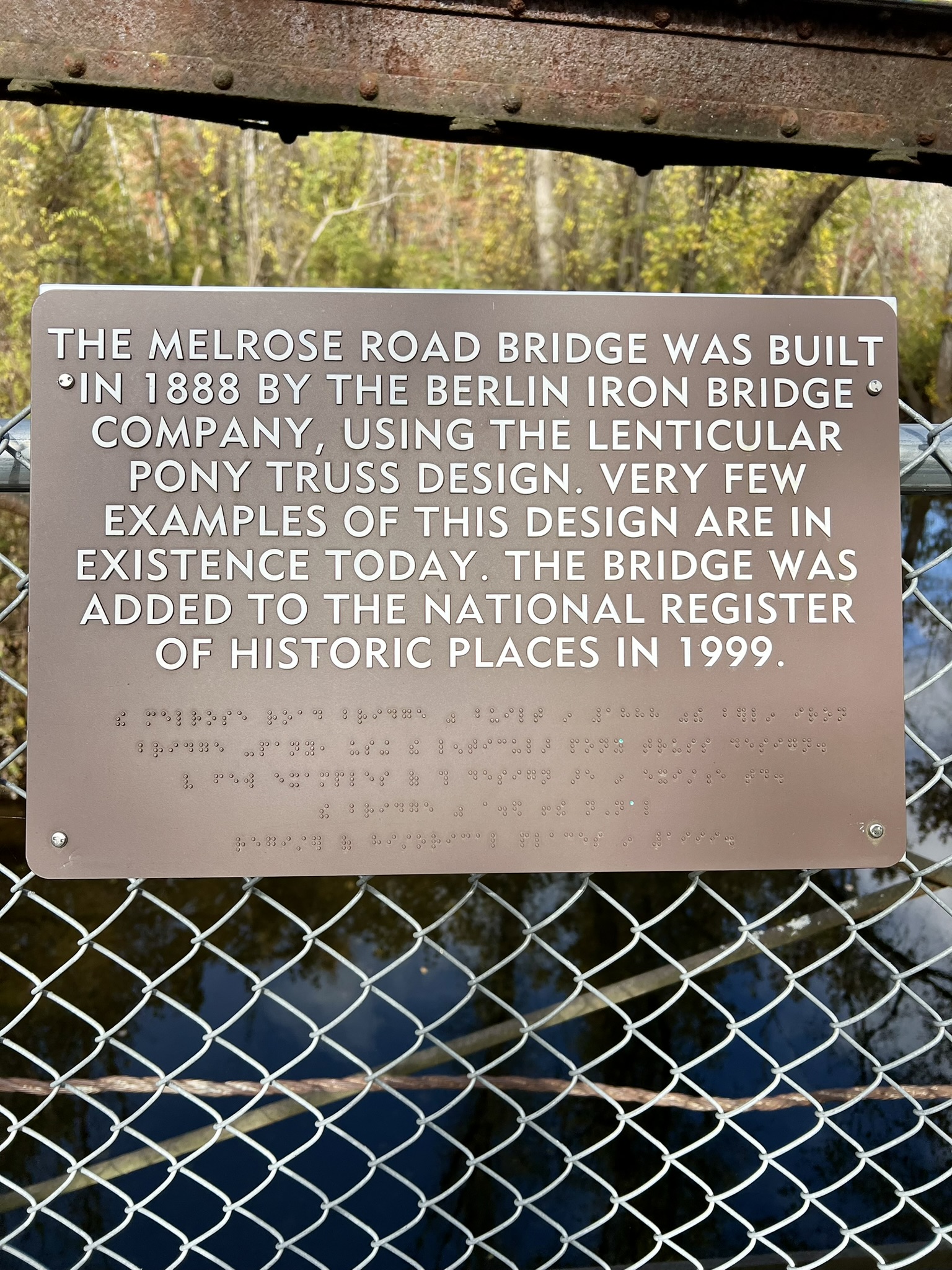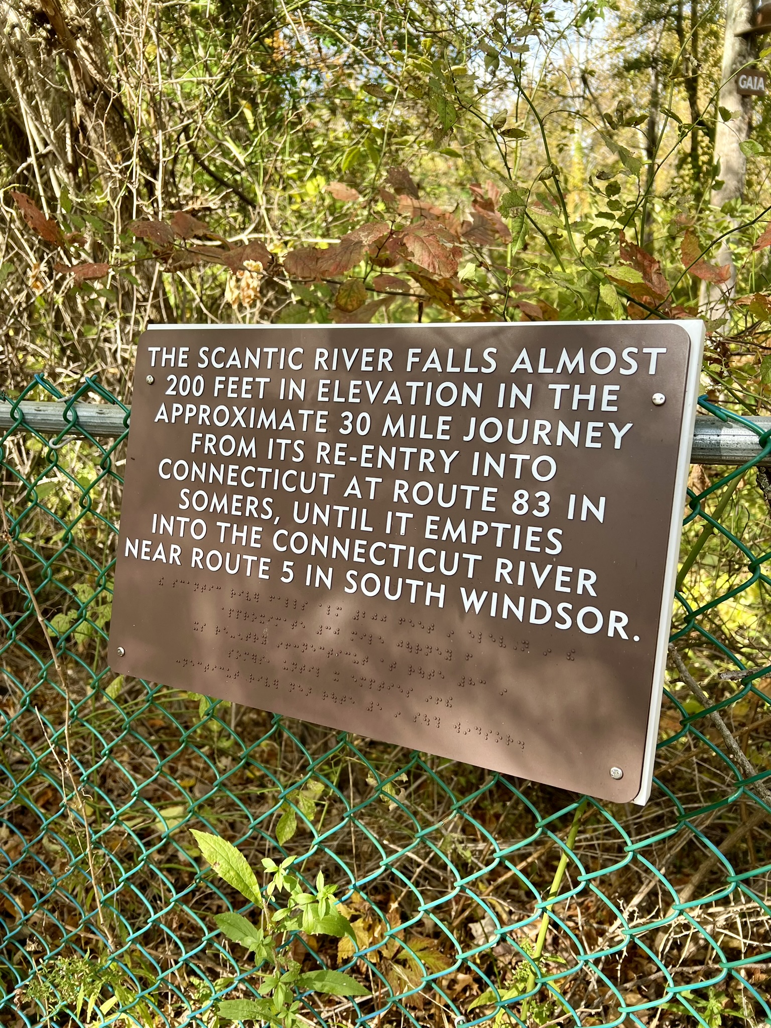 Access to this parcel is at the end of Melrose Road in East Windsor. In Google Maps, use Scantic River State Park East Windsor. Our first visit to the East Windsor parcel was a scouting trip. We had already done two hikes that day, and since this parcel is open for hunting and we had not brought our orange vests, we opted to just take a cursory look. Our first discovery was of the Braille Trail, developed after the publication of the DEEP map. It is a short trail that starts at the Old Melrose Bridge. The kiosk had a scan code that linked to this 2024 trail map which show the Braille trail, as well as two other trails that are still being developed. The map describes the Braille Trail as running “about 880 feet, displaying 11 signs in Braille and English describing the original bridge” as well as other points of interest.