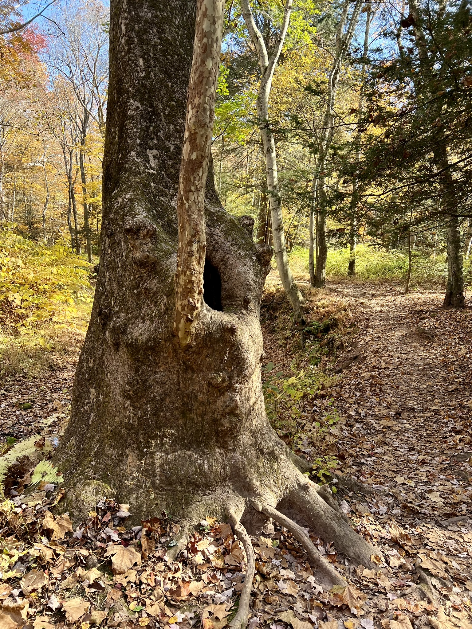 Two workers, Charles Blunden and Jacob Stocker, lost their lives in the chain reaction explosion that ripped through 4 mill buildings on January 14, 1913. The mills had been operating for just one month under their new legal name, Hercules Powder Company. The change occurred after then-owner DuPont lost an anti-trust suit brought by the Department of Justice in 1907. (After Hazard’s death from smallpox and pneumonia in 1868 the Hazard Powder Company struggled financially and was acquired by DuPont in 1876). This final explosion marked the end of powder manufacturing in Enfield. It was a tough and dangerous business, but according to the Enfield Historical Society, “[e]ven though explosions did occur over the years, the Hazardville operation was unusually safe with only 67 deaths during nearly eight decades of operation.” At this point, the trail became a little less obvious as we made our way toward the last ruin on the map, the Corning Mill. However, this was also the point at which we started to see pink ribbons marking the way. These ribbons led all the way to the Corning Mill ruins and back out to the main trail. I noted that the junction with the main trail is near a very large, recognizable tree (see photo below).
