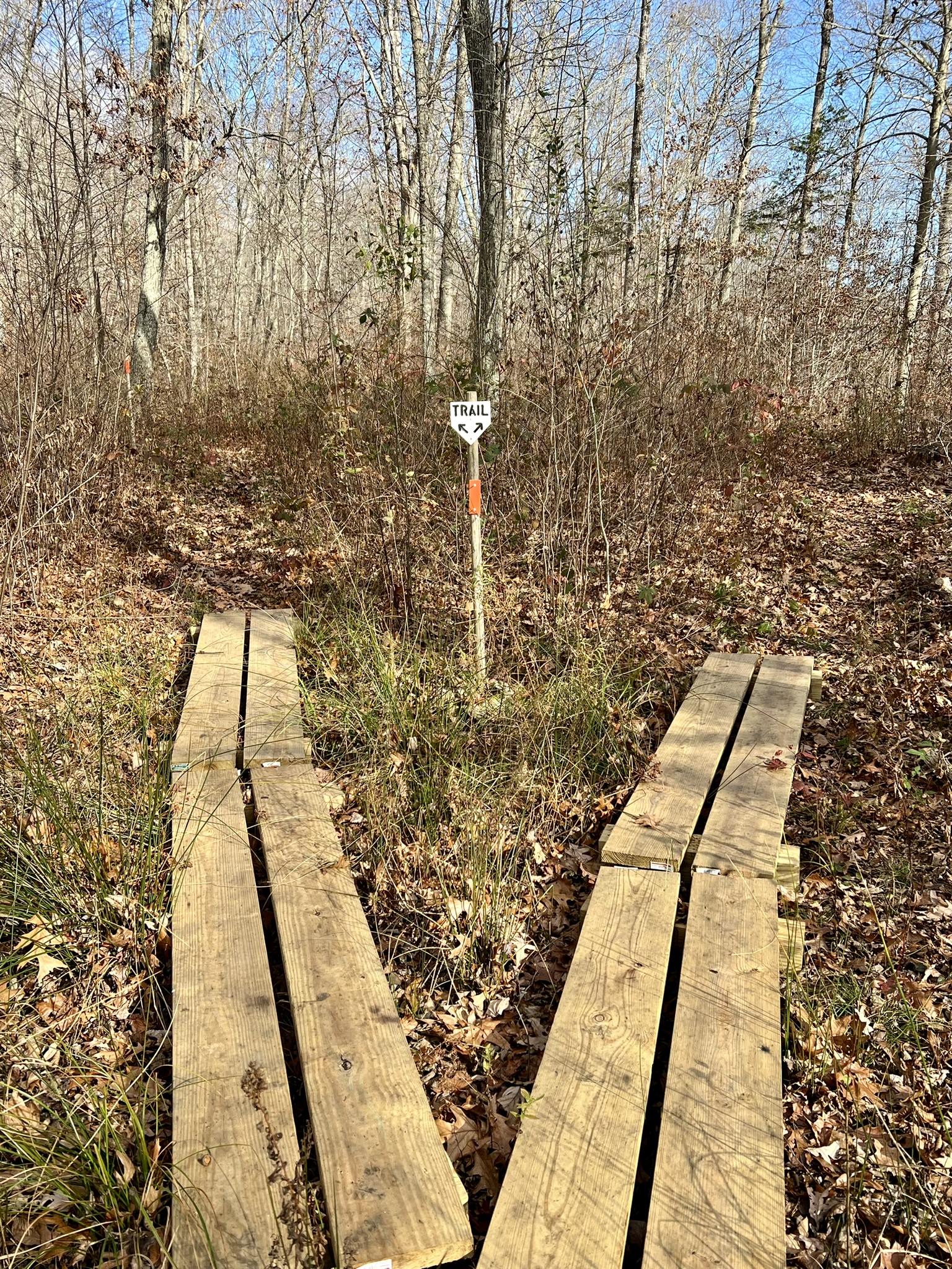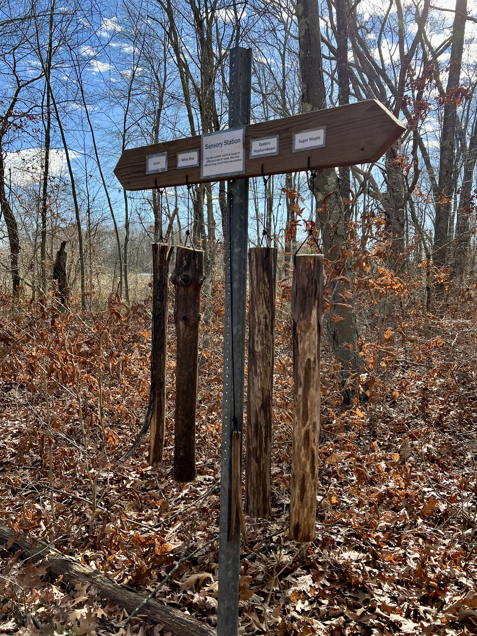 From left to right: the trail junction; the sensory wood exhibit; the viewing platform; the blue-blazed connector to the Wolf Hollow Trail