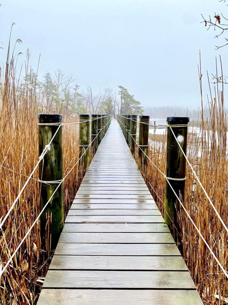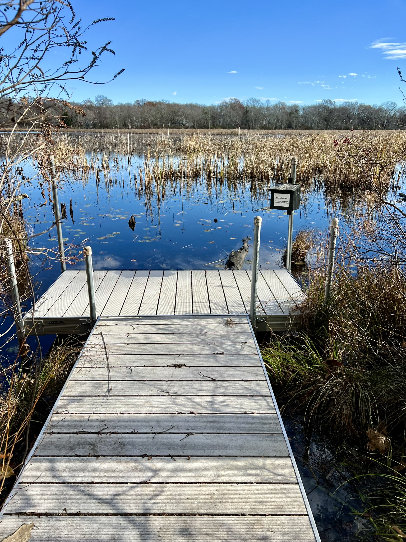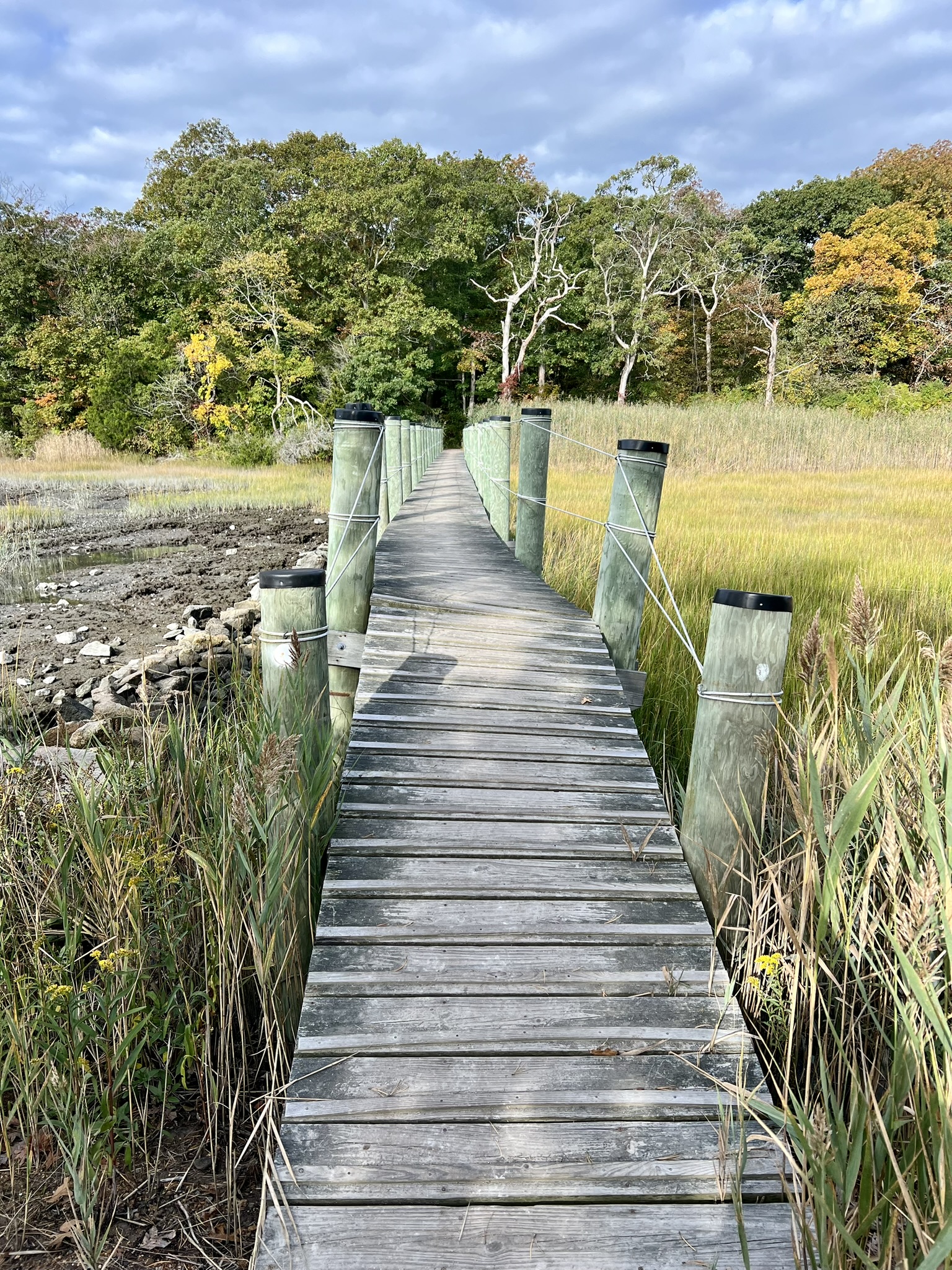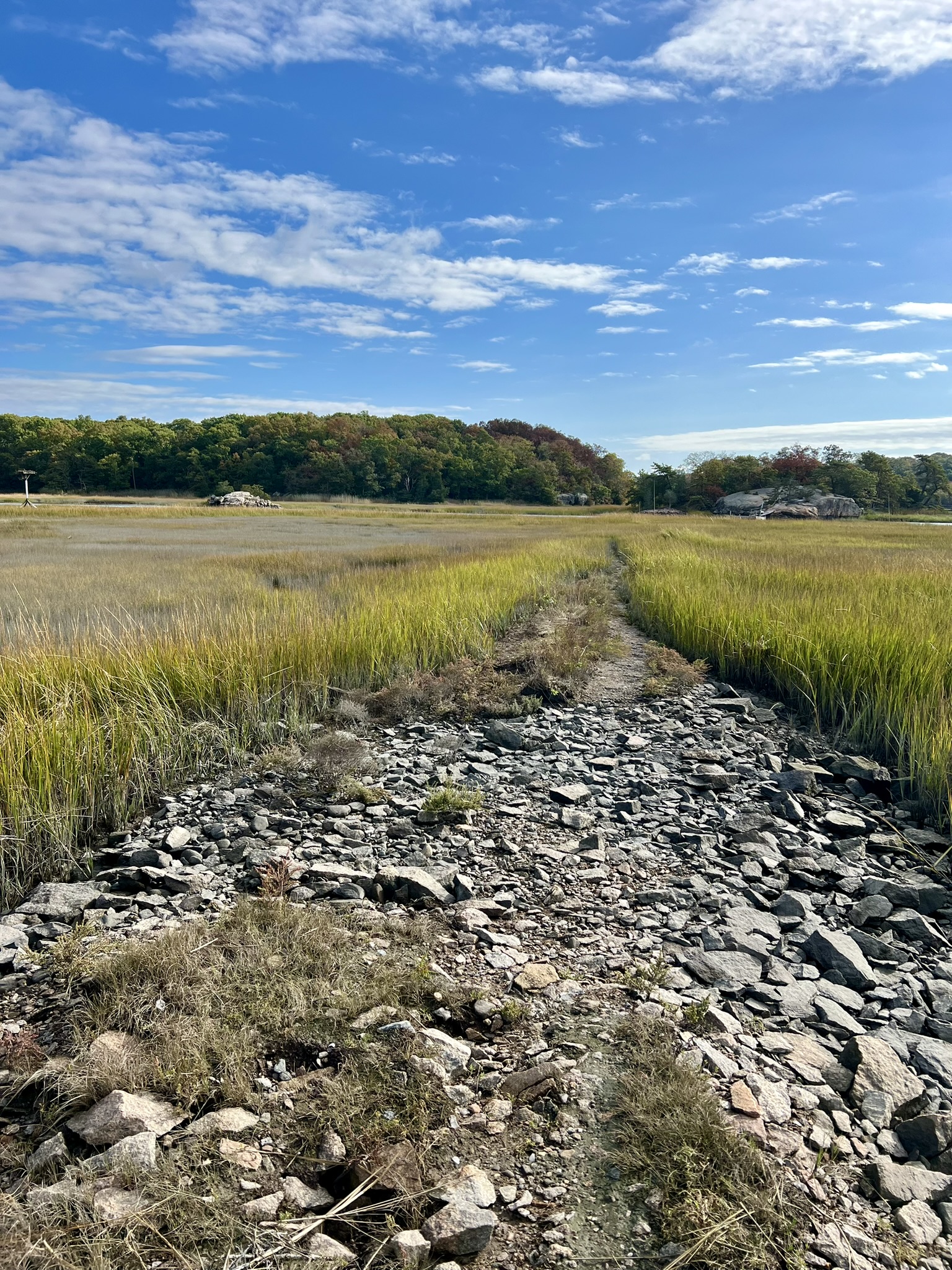 On that September day we parked at another lot at the end of Buena Vista Road and did a 1.6 mile loop hike going as far as the dam and sluice gate. We were there at a king tide (one of the highest tides of the year) and were impressed at the volume of water flowing into the salt marsh. Click here for a link to my Instagram reel from that day. It was still early enough in the fall to get a glimpse of the ospreys living there, before their long journey back to South America. I decided to return one morning a few weeks later to do a longer 3.6 mile hike starting from the new parcel. There is a large parking area on Route 146 that appears on Google Maps as the Jarvis Creek Farm Trail. From the parking lot, take the connecting trail on the east side to connect to the white Branford Trail. Turn right on this trail and follow it as it skirts the edge of a farm field and continues under the railroad tracks. Shortly after passing under the railroad tracks watch for an unmarked trail on your left side. Although unmarked, it is hard to get lost on this loop trail because it is bordered on three sides by the marsh. At its southernmost tip there is viewpoint marked on the map. This is a seasonal viewpoint once the leaves have fallen.