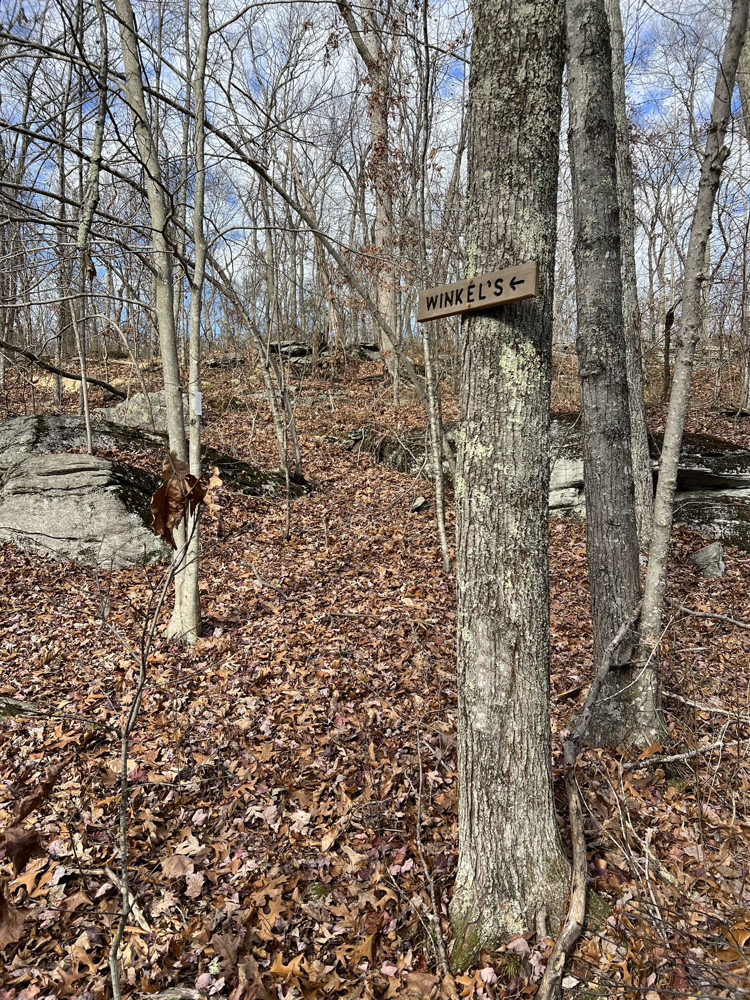 As I followed this trail north, I came to a section where the leaves had been blown off and I noticed several unmarked cross trails. In conversation with KLCT I learned these were previously created ATV trails from before the land was clearly marked as land trust property. The blue trail ends at a T junction at a sign for the Wolf Hollow Trail pointing in both directions. My understanding is that the trail to the left continues to Wolf Hollow Road near the Killingworth Elementary School (KES) and that the trail to the right is not actively maintained. I also learned that the old Wolf Hollow trail apparently was used by revolutionary soldiers traveling between Route 81 and Roast Meat Hill Road! Rather than continue on the Wolf Hollow Trail, I made this my turnaround point, which added .5 miles to the overall hike. Back at the red loop junction I turned right to continue the Keystone loop. When you start seeing a stone wall on your left, keep your eye out on the right for a white blazed spur trail. There is a sign that says “Winkel’s Pond”, but the sign faces hikers coming from a southerly direction.