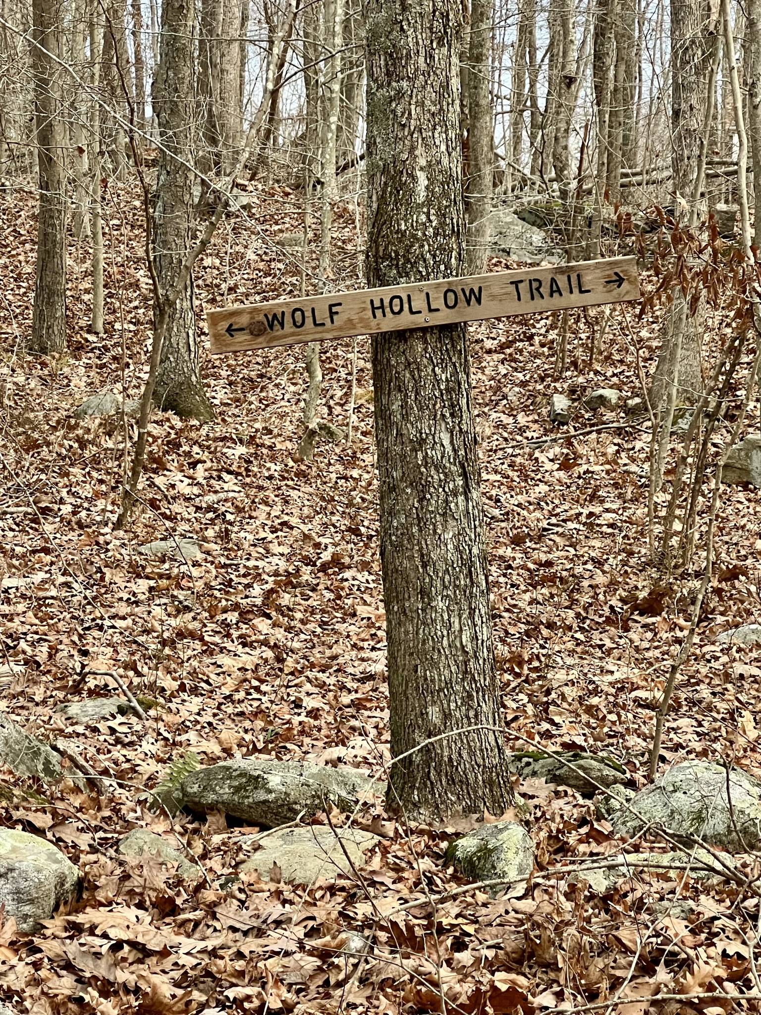 From the parking lot, follow the red trail north. Along the bog bridging there is a trail junction. I went to the right, making my way to the pond viewing platform. There is even a binoculars box for hikers to borrow a set to look for birds and other wildlife and two contemplation benches. From there, the trail continues north. At the northernmost point of the red loop trail there is a sign for the Wolf Hollow Trail with a connector trail blazed blue to get to it.