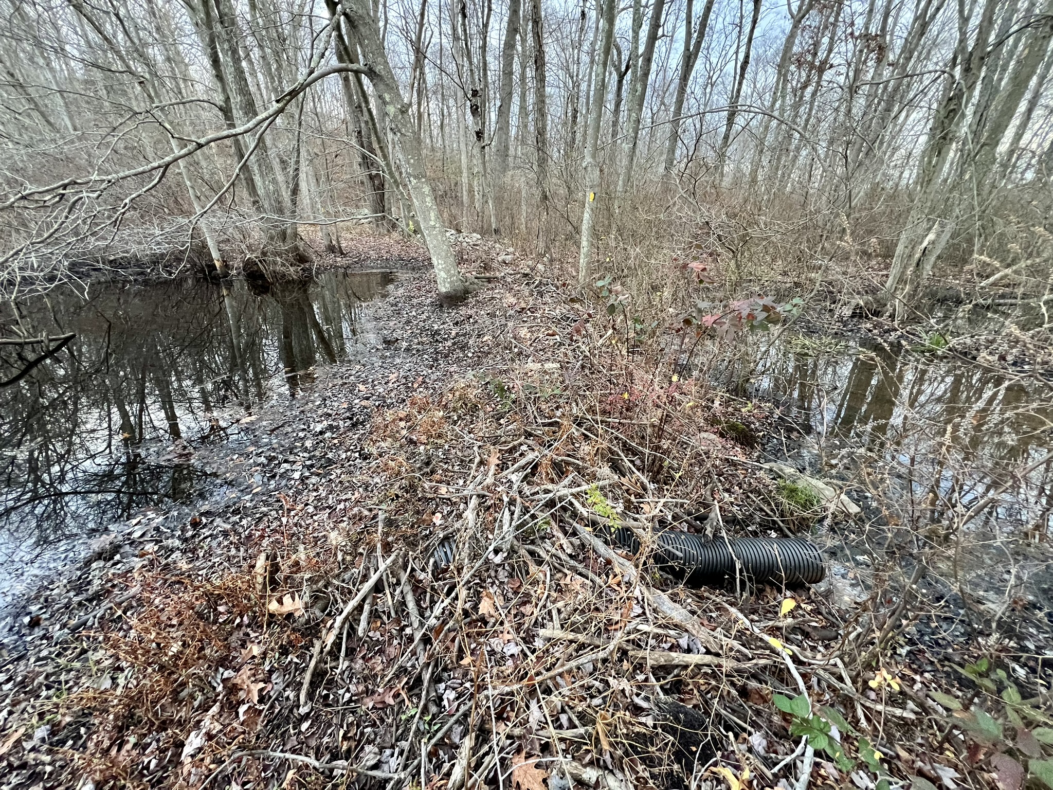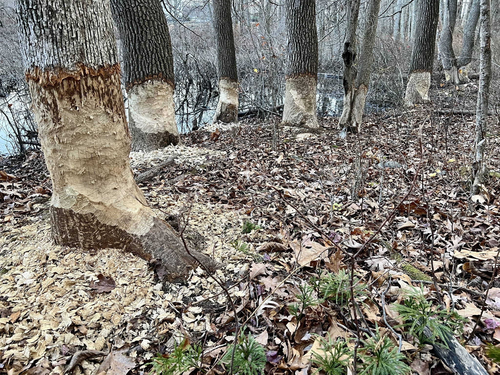 I visited during the drought days of November, and at that time this connector trail was passable. However, KLCT has faced even greater beaver challenges on the Winkel’s Pond parcel. I love the proliferation of beavers in our state, so I was more in awe of their work than disturbed by it. However – be prepared for a slightly apocalyptic experience if you attempt the Winkel’s Pond Loop. I was amazed by the number and size of the trees these beavers are tackling. Along the northern edge of the pond there is a sign for a .25 mile Church Trail, but this trail is no longer identifiable or maintained. Continuing along the western border there is a big construction project underway on the far side of the stone wall. Because of the beaver activity, the ground was quite muddy all the way up to the stone wall – even during the November drought. I opted to test my balance on top of the stone wall to cross this section. Looping the pond to the south and starting up the eastern side there is some bog bridging through the muddier sections, and then the trail actually goes across the top of the beaver dam, through which a culvert is installed to try to direct the flooding. The Winkel’s Pond adventure adds another .6 miles.