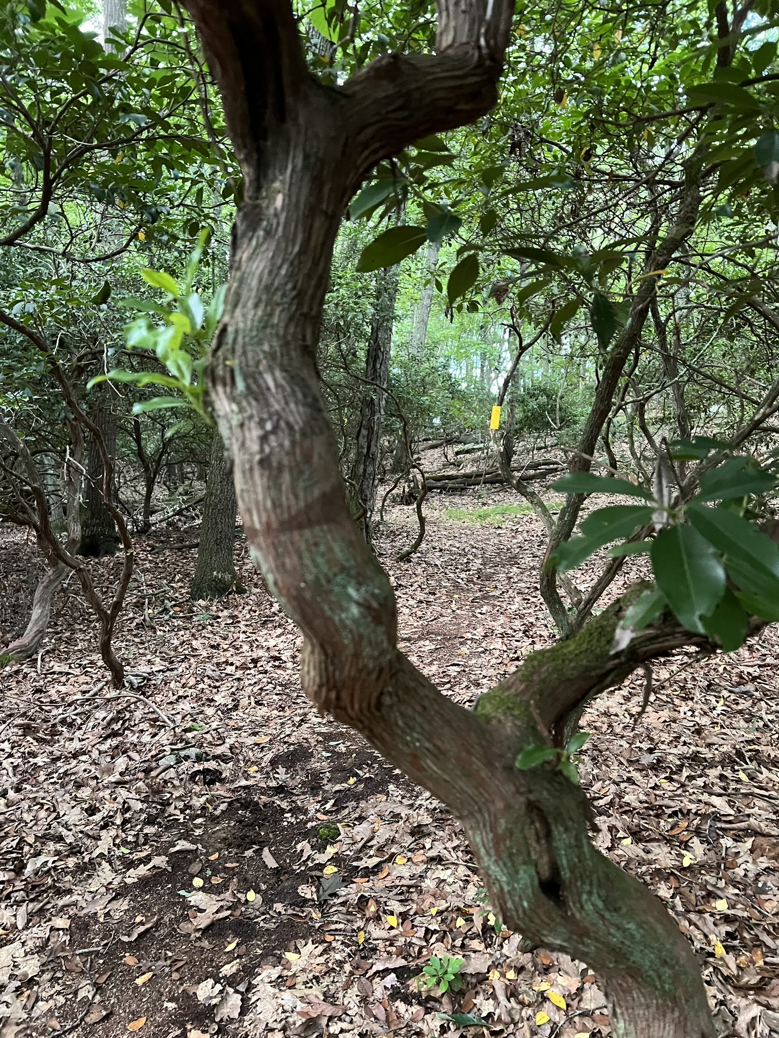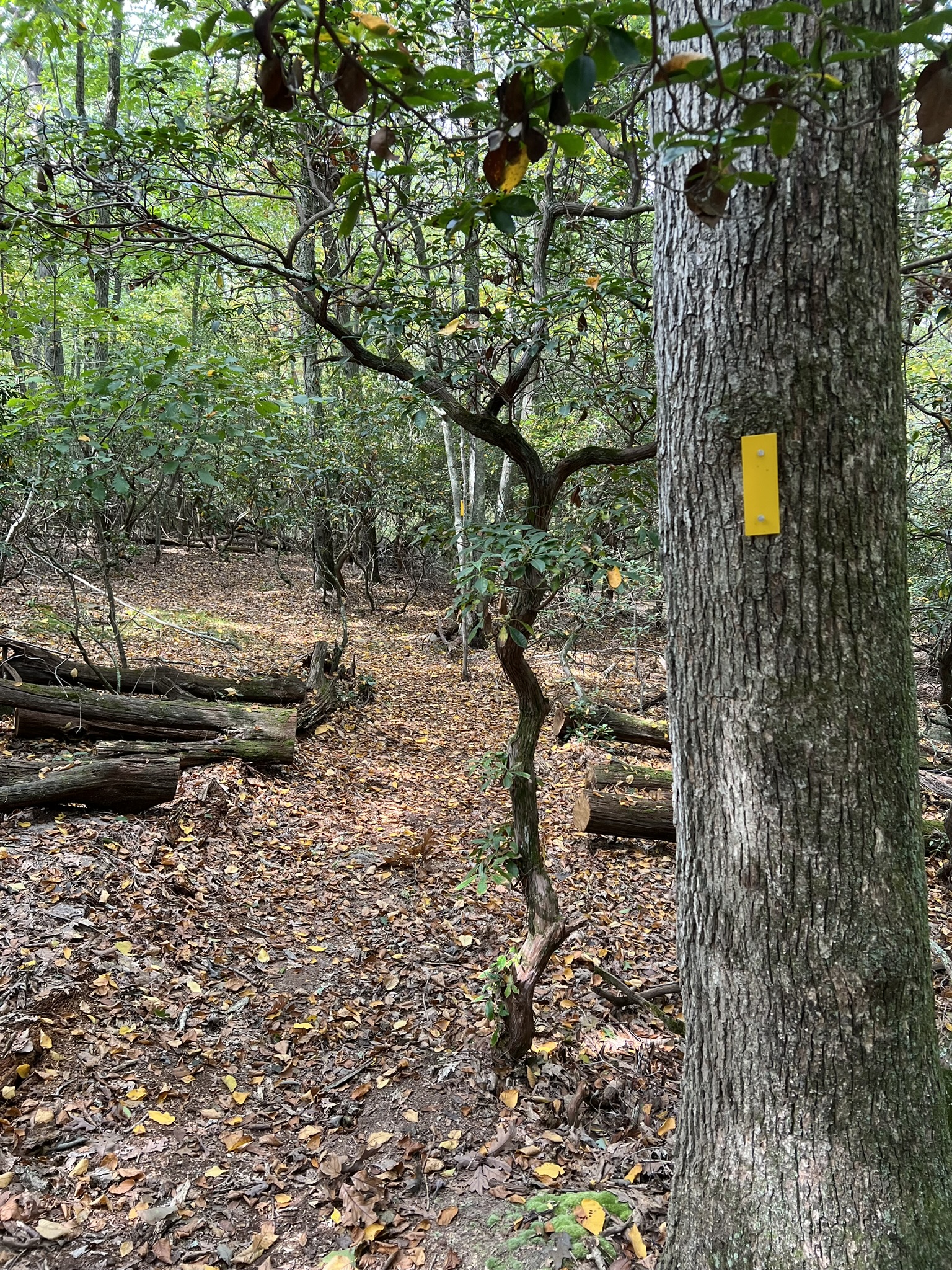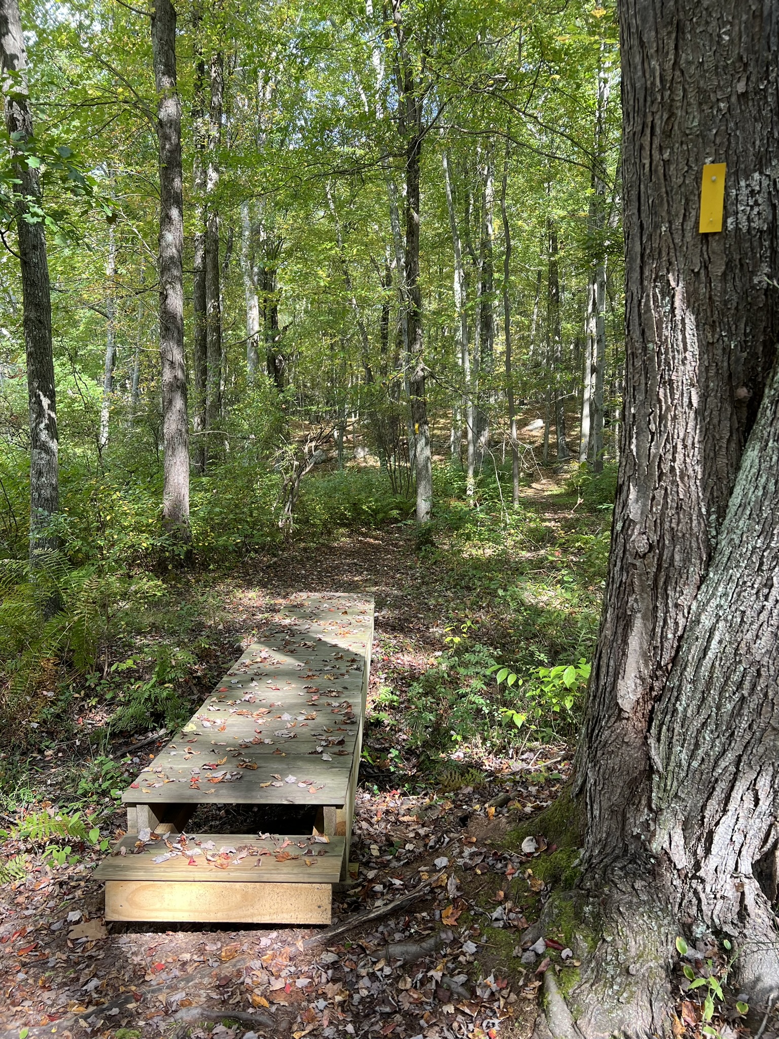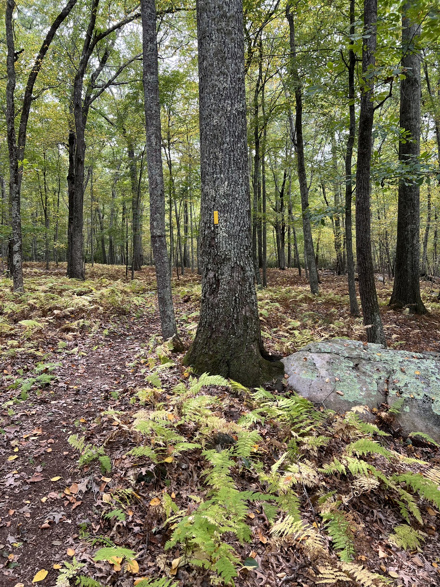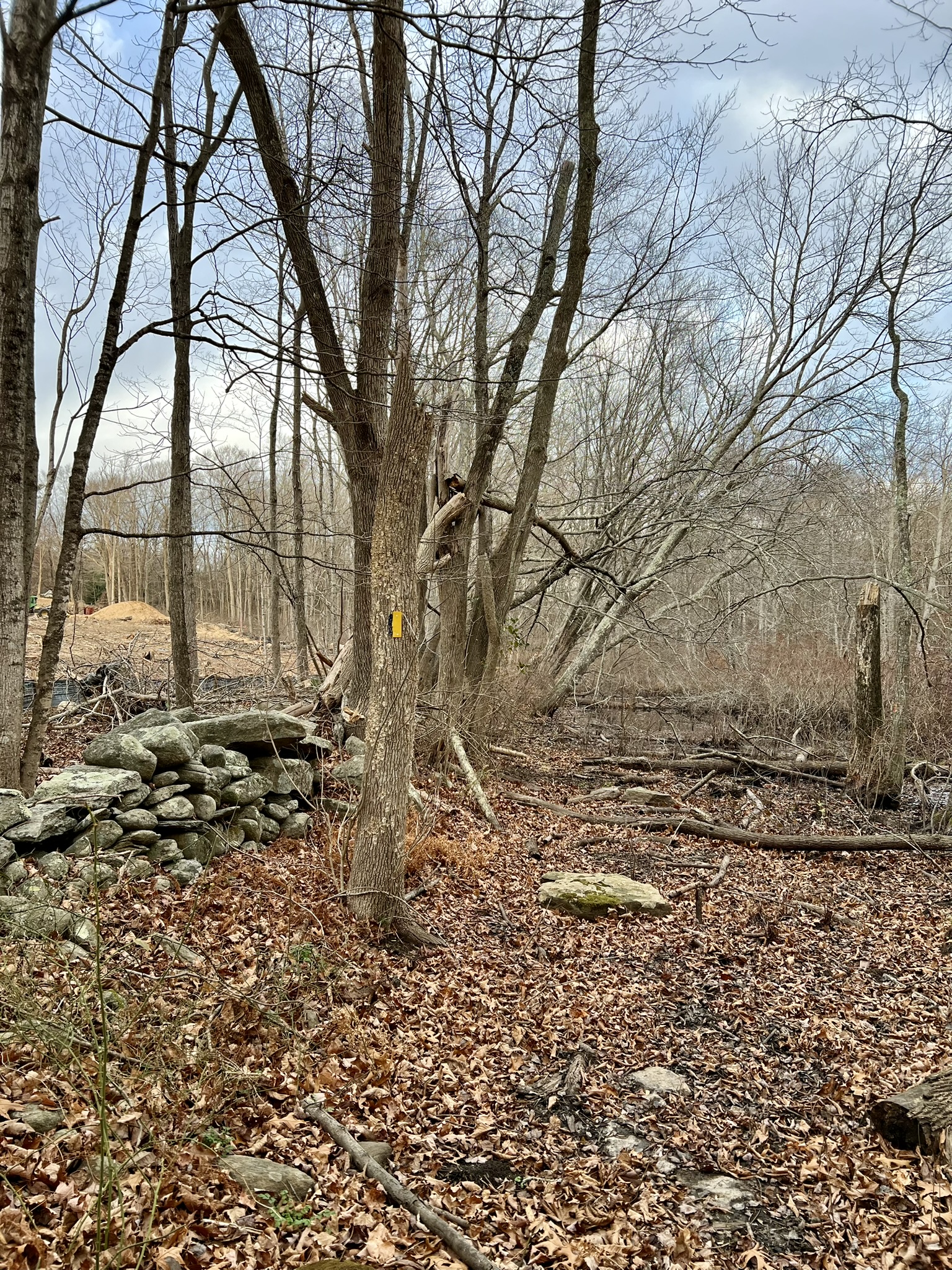 In 2024, the trail crew worked on the recently donated 38.5 acre Williams Woodland Preserve. The Williams Woodland Preserve is adjacent to the existing George C. Lyon Nature Preserve, which in turn is connected to three conjoined Essex Land Trust Properties – the Woodja Hill/Doanes’ Woods/James Glen Preserves (Click HERE for the Essex properties trail map). Whether you choose to hike just the Deep River properties or do an extended hike to include the Essex trails, I recommend that you park at the small lot for Woodja Hill Preserve at the end of Oxbow Lane. At the cul-de-sac, continue down the driveway straight ahead and look for the land trust parking sign on the left. The parking lot shares a driveway with a home. At publication time for this post, a trail map for the new parcel was not available. I suggest using this map of the George C. Lyon Trail in conjunction with AllTrails, which shows the newly labeled Williams Woodland Preserve boundaries albeit without trails. Keep your eye on the Deep River Land Trust website. In addition to updating their maps, they are working on a trail for their 3.5 acre Millstone Hill Sanctuary which is adjacent to Williams Woodland Preserve and supposedly offers seasonal views of the Connecticut River. From the parking lot take the green circle trail at the lower end of the field. This trail skirts the edge of the field and enters the woods, heading in the direction of the George C. Lyon Preserve. As you cross the town line into Deep River the trail blazes become yellow rectangles. The trail goes through a cedar grove, alongside a wetlands and over a bridge. As you come to a stone wall near the top of Lyon’s Meadow Pond, watch for the trail to split. At this point it becomes a loop trail and you can go in either direction. The new trail is a loop off this trail. I took a counterclockwise loop, staying to the right at the stone wall. The trail climbs up the hill in a backwards “S” curve passing features noted on the map such as a block foundation and “whaleback rock”. As you approach the “big boulder”, watch for a sign welcoming you to the Williams Woodland Preserve. At this junction, the yellow trail continues onto the Williams Parcel and the continuation of the old trail is now blazed yellow/red.