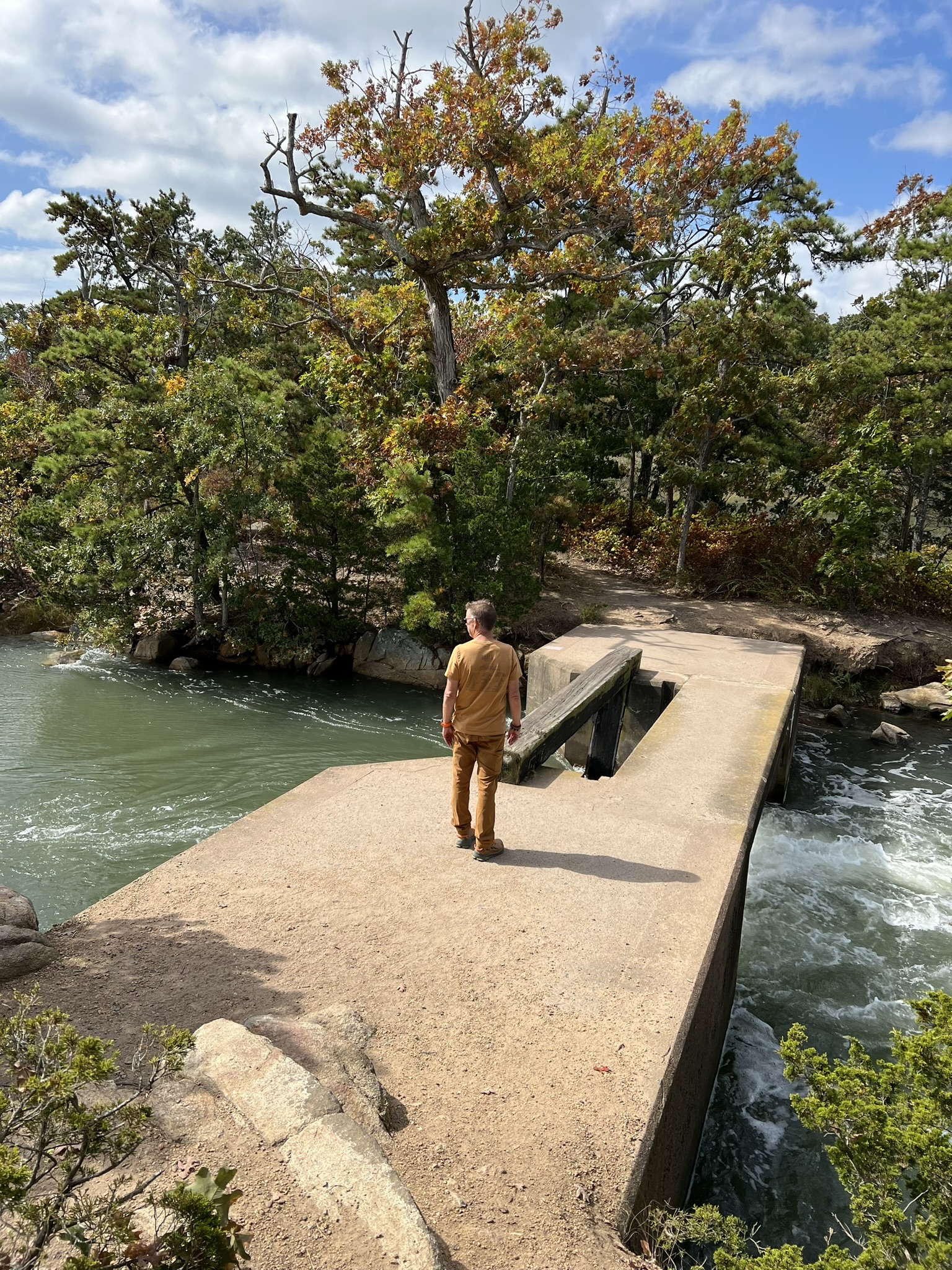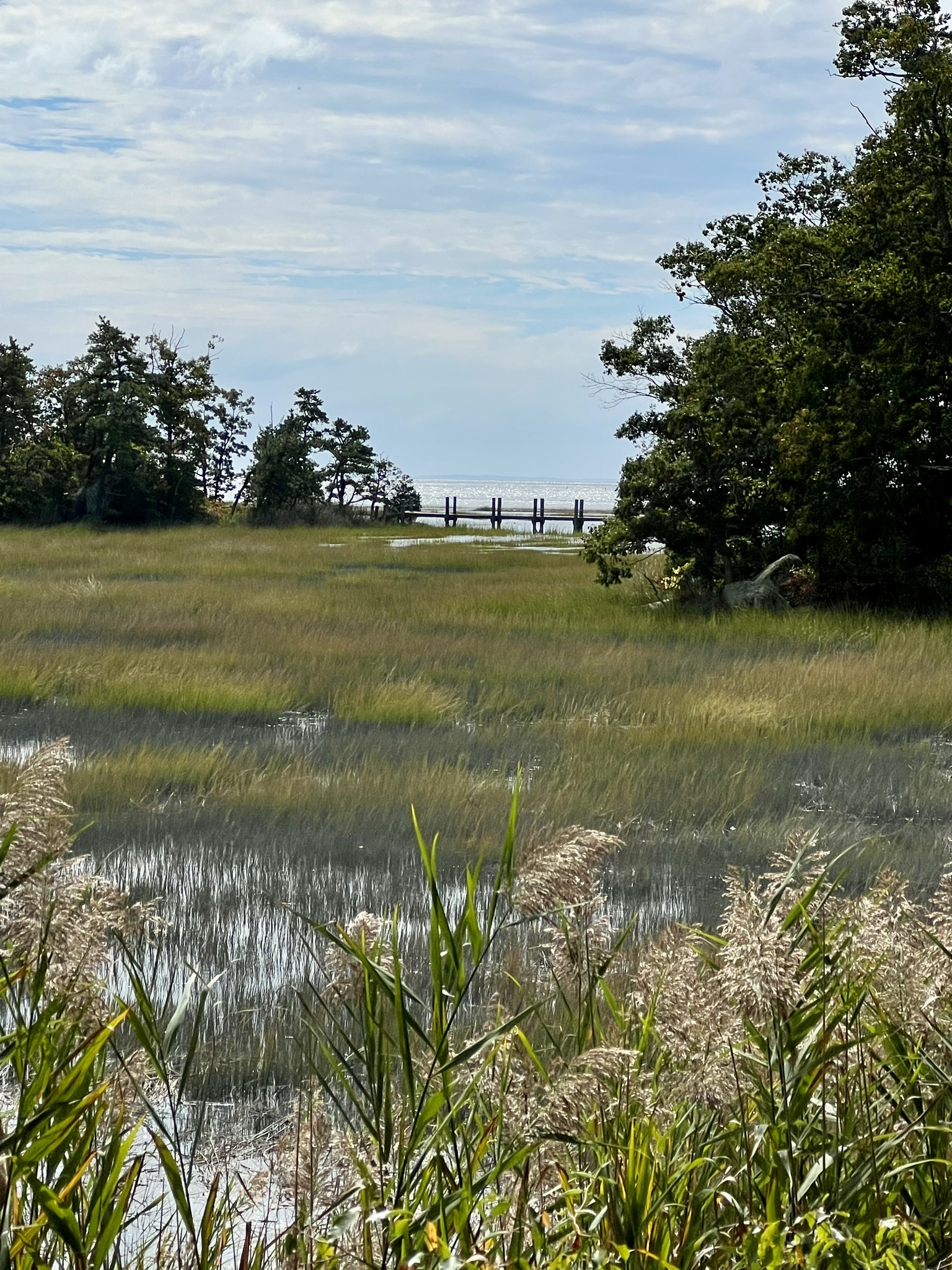 From left to right: the view from the rock outcropping; crossing the dam; the view into the salt marsh; the bridge