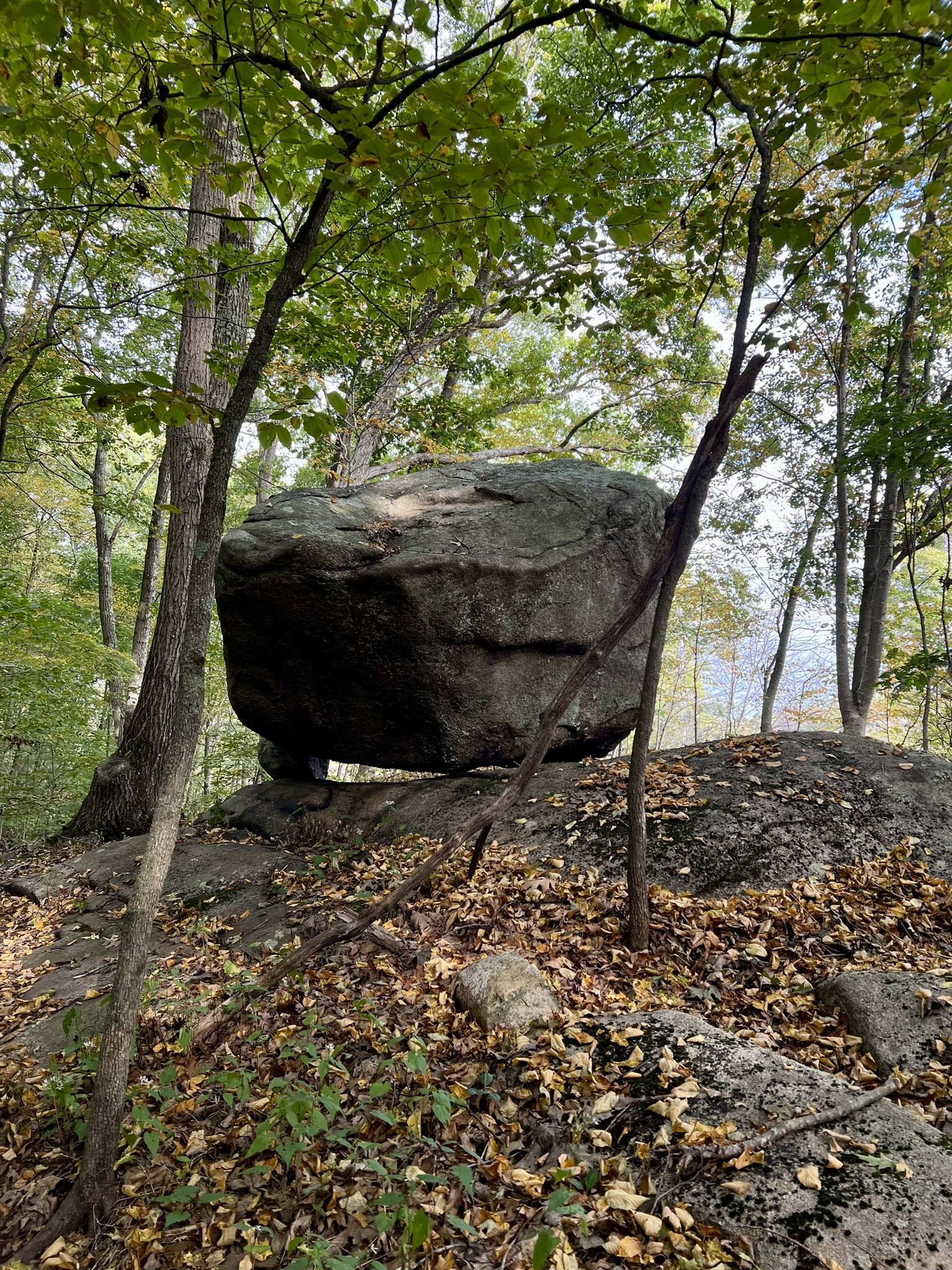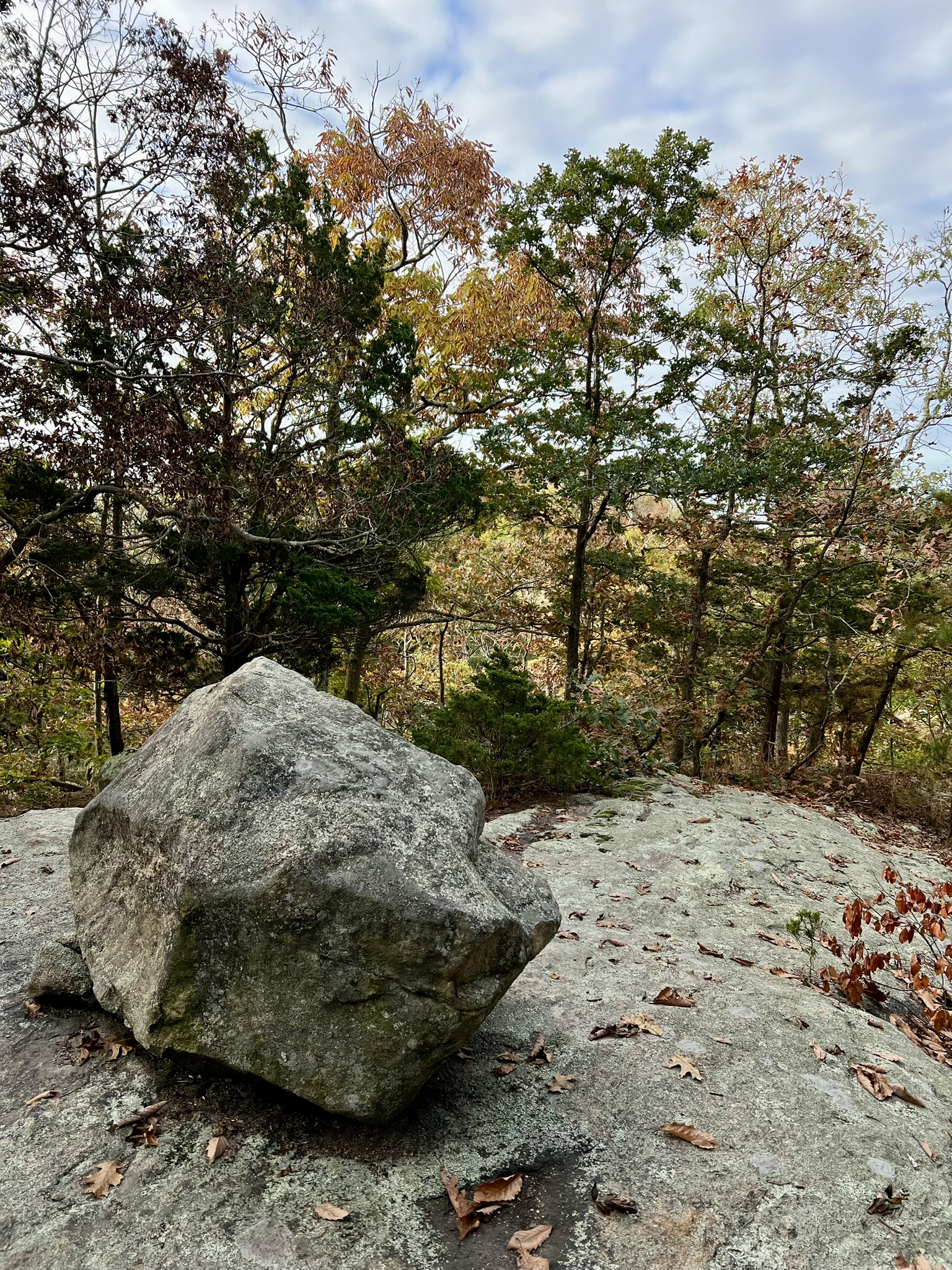 From left to right: skirting the farm field; the two unmarked trails off the white trail that form a loop; the “viewpoint” on the map; one of many interesting boulders along the unmarked loop trail