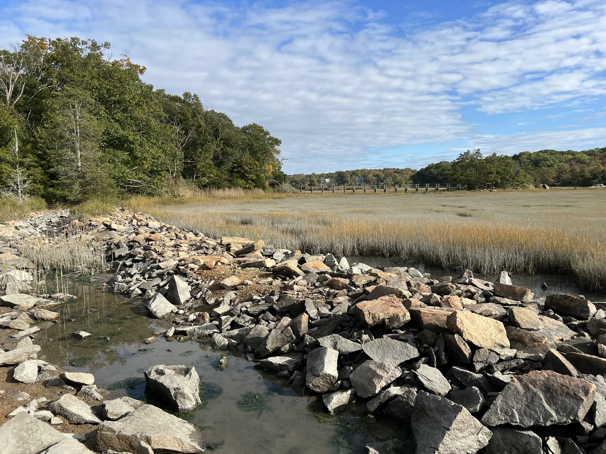 When I first visited this Branford Land Trust property I used their map entitled “Stony Creek Partnership, Washburn Preserve & Weil Property.” I started at the Washburn Preserve trailhead which involved parking on the main road (Thimble Island Road), walking up Wallace Road, and then a private driveway. I was doing this in the dim light of pre-dawn and it felt awkward and a bit like trespassing. I was relieved when I found the trailhead. When I wrote about this visit in my May 2022 Trail Talk I said “I visited early on a foggy morning and it was a magical experience.” I remember it well. Out of the fog in front of me a well-made bridge spanned a section of creek, leading to a tiny island. There is a cement dam and sluice gate that can cause a small degree of vertigo to cross, even though it is wide and easy to traverse. The views of the salt marsh and the sound are blissful. The online brochure describes the topography as “indelibly defined by 19th century quarry operations” where some of the trails “cross over helter-skelter piles of jagged rock rubble.”