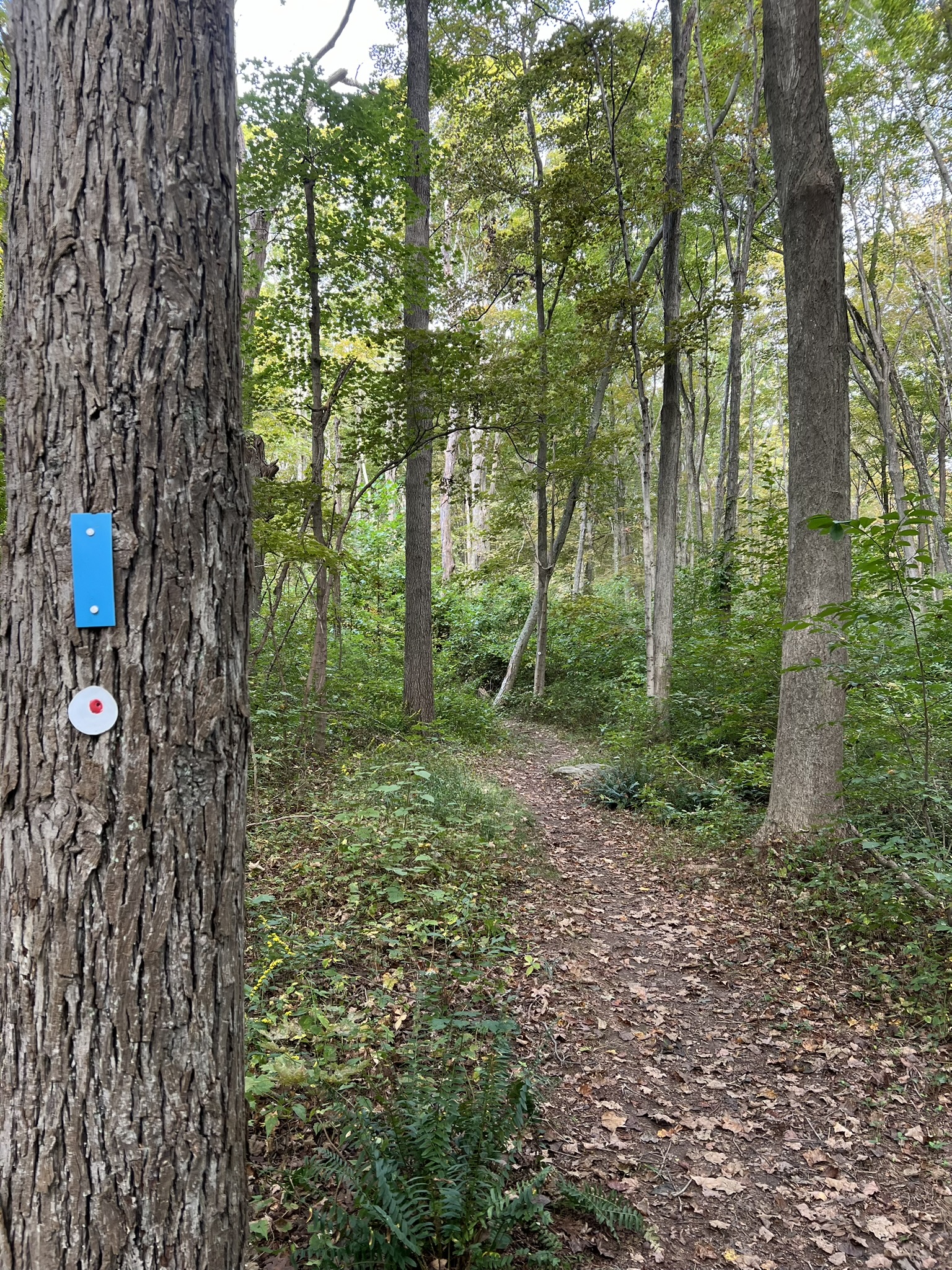 Finish the red loop (while I did not follow the red trail to its start, you can add some mileage by checking out that portion of trail) and continue left on the white trail. Watch for the intersection with the blue trail on your left. I did a clockwise loop of the blue trail and then followed white back to the parking lot. Part of the blue trail is along a driveway that is shared with the white blazed Branford Trail. Be sure to watch for where the blue trail veers off to the right shortly before reaching Buena Vista Road.