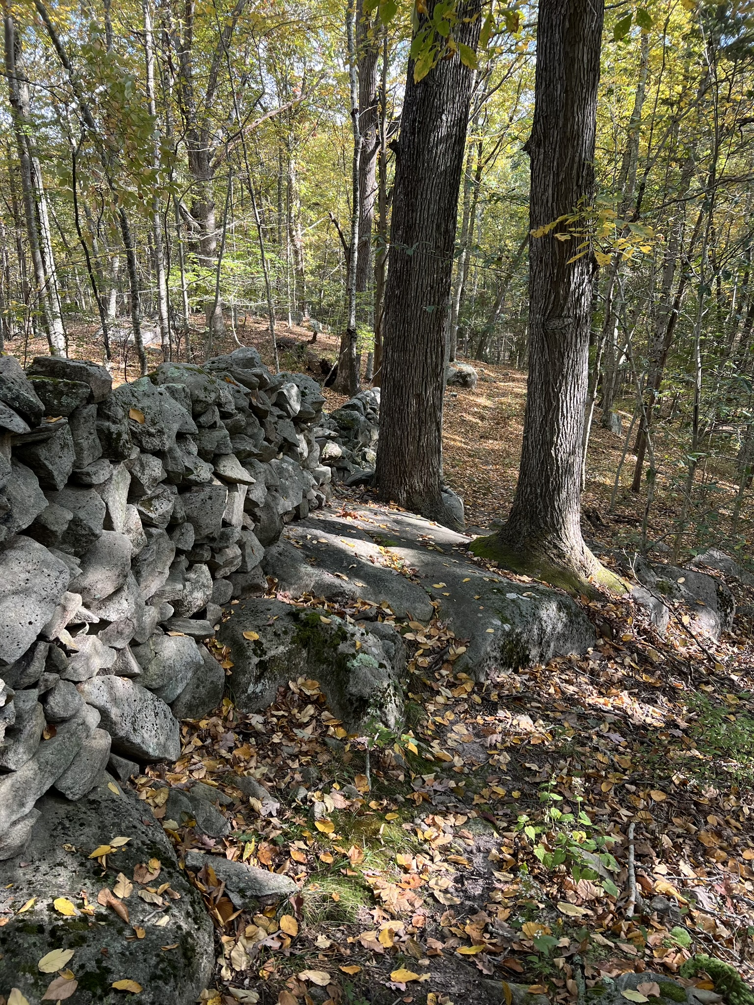 Continuing on, I followed a clockwise loop starting with the yellow trail. This trail goes alongside an impressive stone wall. I chose to take the red side trail to the right which goes past an overlook (more of a rock outcropping, but with the leaves down you can look out on the surrounding terrain) before rejoining the yellow trail. As the trail enters the James Glen parcel I like to take the red trail that goes steeply up and along the ridge before coming down to loop back on yellow, which allows you to see the rock cliffs from both above and below. Circling back on yellow, when I get to the Doanes’ Woods section I stay mostly to the outer loop, taking red to green to orange to blue and back to red. These trails are very popular with trail runners. When I visited in mid-October the trails were mossy and wide, blown clear of leaves. Keep an eye out for the green trail that will bring you back to the parking area.
