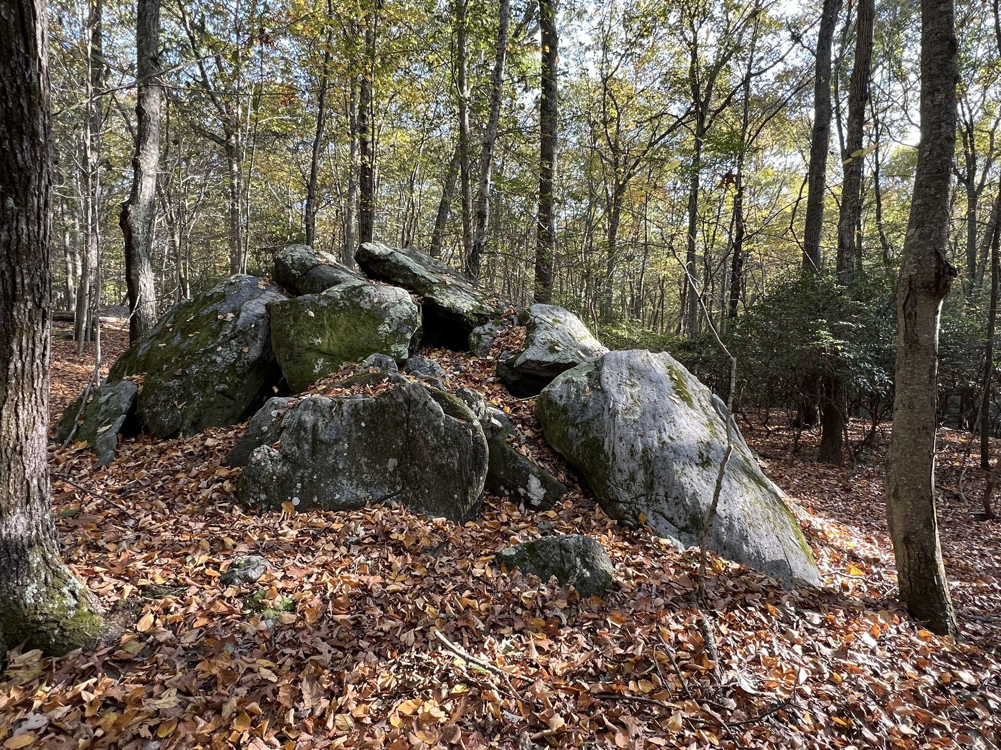 As you continue on yellow, the trail winds up through a tranquil mountain laurel maze, opening up into a grassy woodland at the upper section. Looping back down, the summer woods are filled with fragrant ferns and mature trees (I visited before the leaves fell). The trail eventually meets back up with the George C. Lyon trail and connects back at the pond. After you cross the border into Essex watch for a yellow circle trail to appear on your left. This rises up and goes along the base of an interesting jumble of rocks. At the point, when you see the parking lot, you can end your hike or continue on the Essex hiking trails.