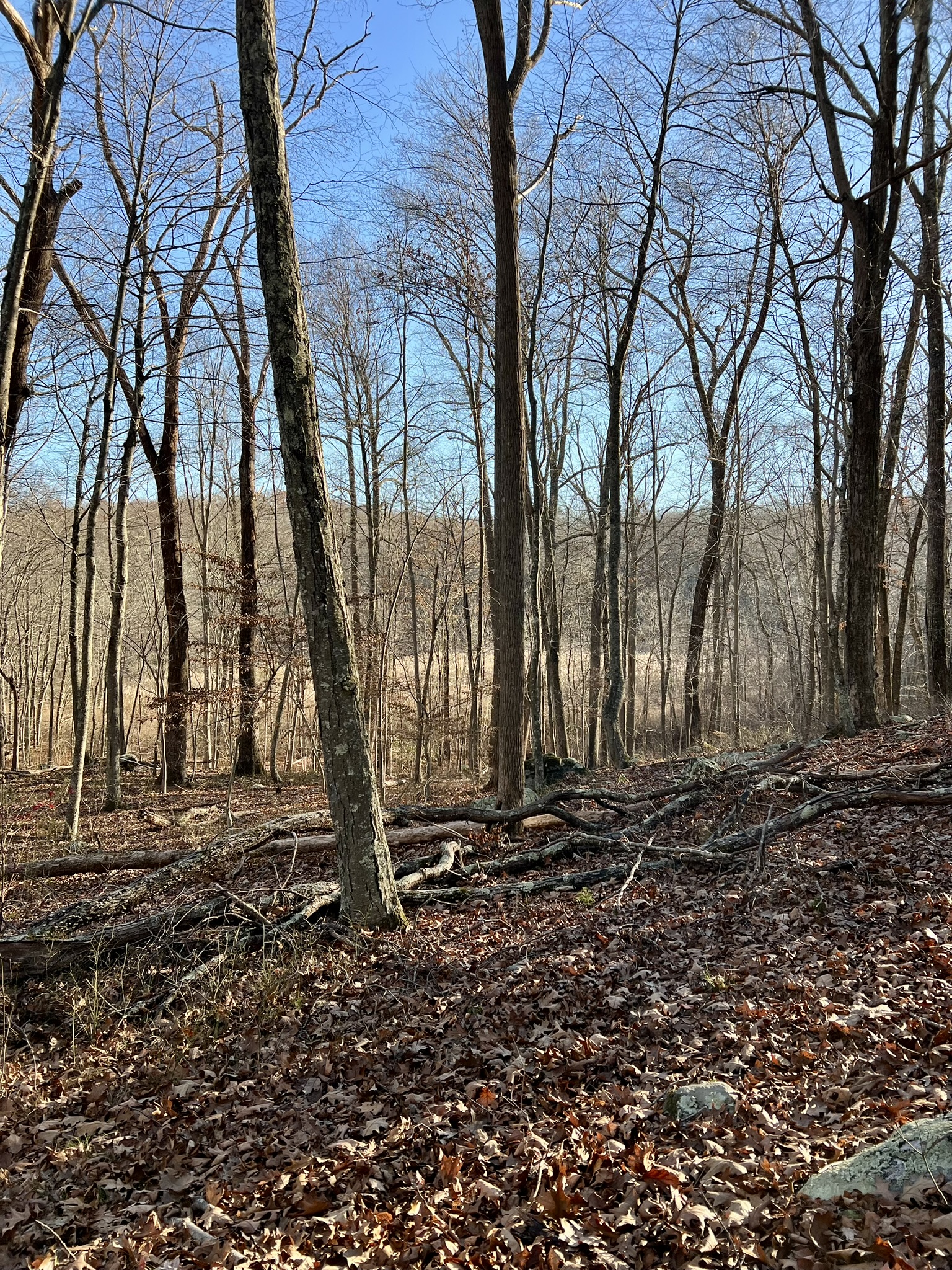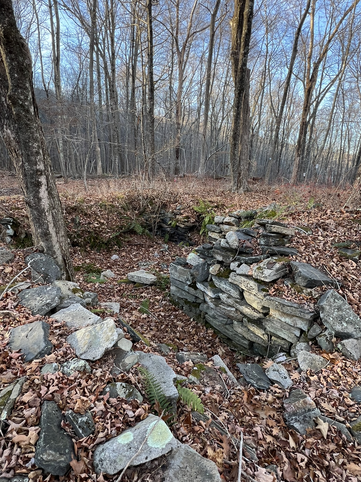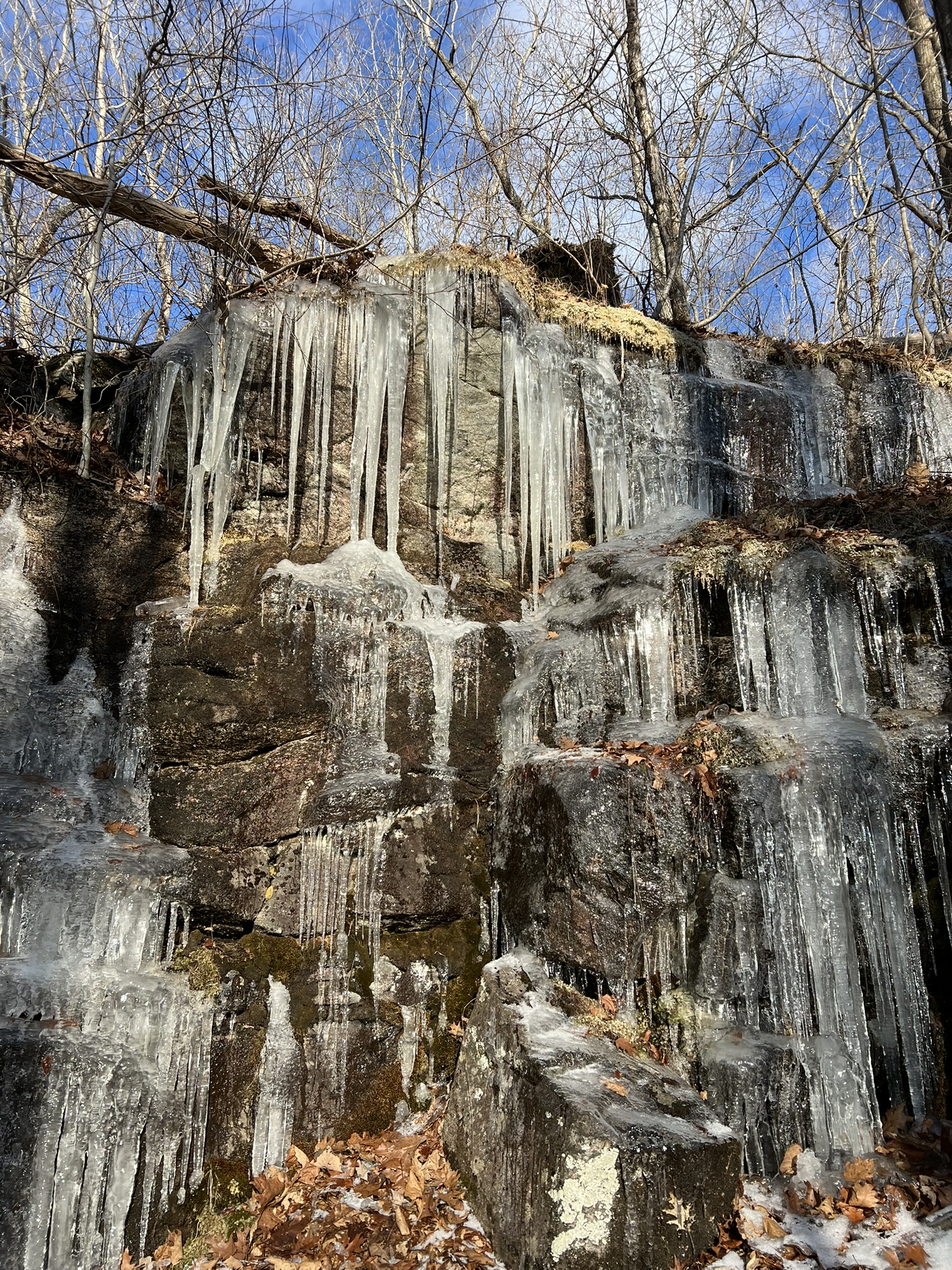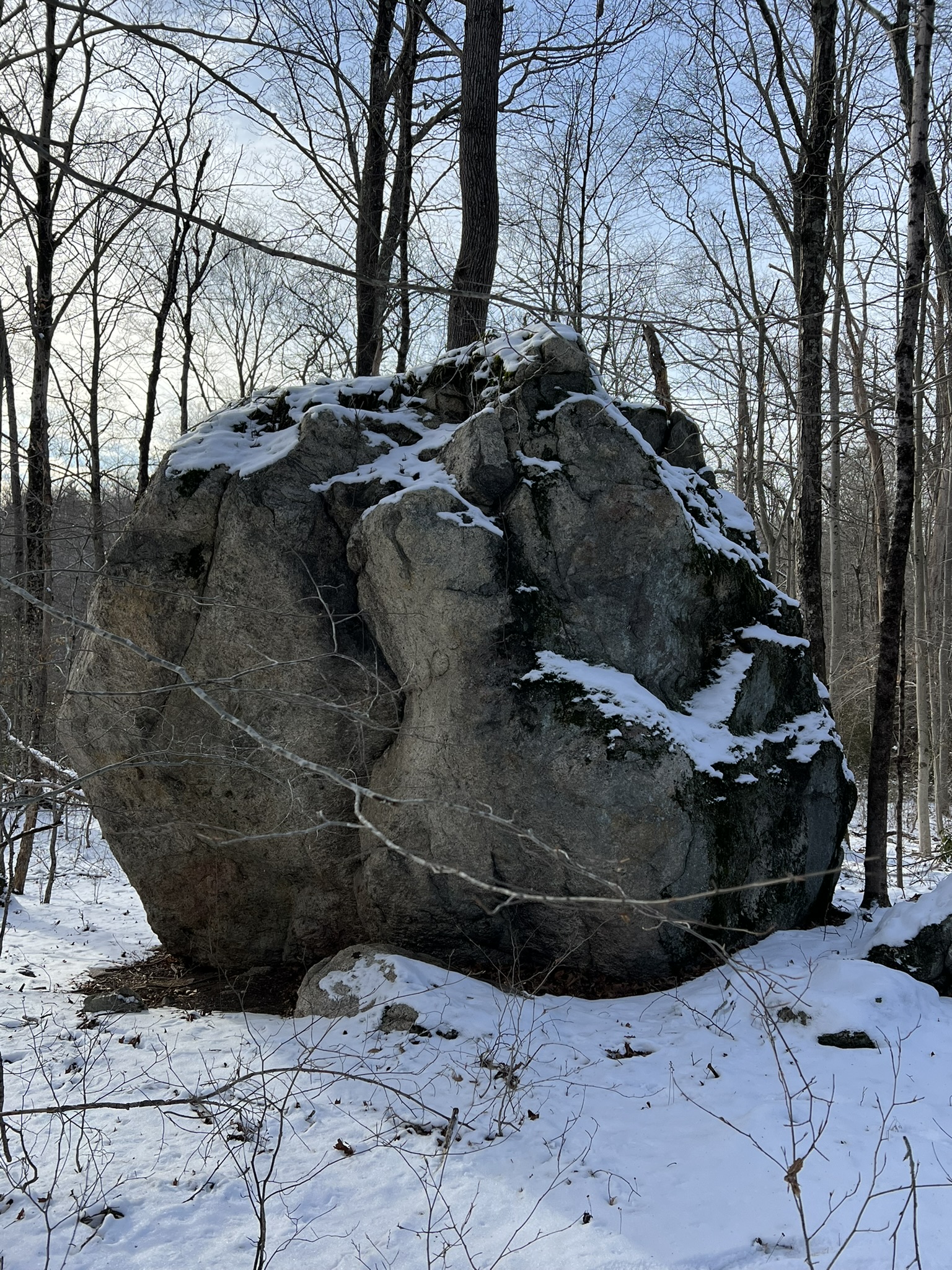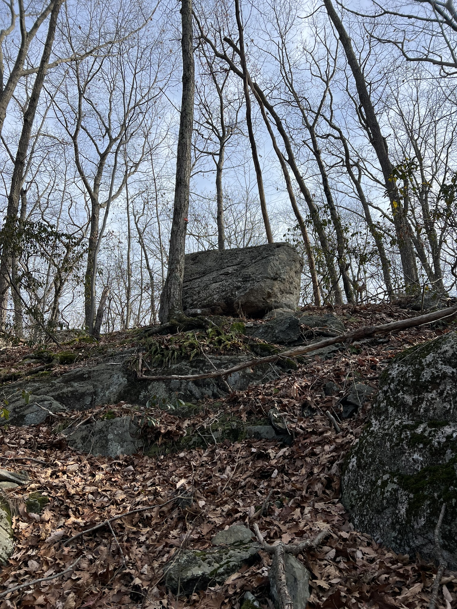 We returned later in the week, a few days after the first snowstorm of 2025. I’ll admit to being lazy, and confess that we parked in the northern parking lot along Route 151 to tackle CPs 45 and 46. Because the far northern trails do not appear on the map, I cheated a teensy bit and used AllTrails just until we reached a point that showed on the O-map, then I put my phone away. I came much better prepared, having taped the legend directly to the map. I also realized the map already had the control descriptions in a table in the bottom left hand corner (I had also written them out in longhand on the map.) I wore a wrist compass and used only one hiking pole, so navigating through the woods was infinitely easier. Making our way back to the car, we then drove to the official start (the lot at the Park entrance marked with a triangle on the map). Next up were the CPs south of the park road. These were fun, but a lot more challenging than the earlier ones. They were all well off any trail or road, so required a higher level of map and compass work. We found CP 39 easily, but struggled to find CP 40. We finally determined that it is probably missing. We then faced a new challenge – determining how to get to the next CP when you aren’t 100% sure where you are. We made some educated guesses, and worked hard to read the terrain as we made our way toward CP 41. I was relieved to eventually find it. The clue threw us off a bit, as it said “southeastern cliff”. In retrospect, we see this meant the cliff itself was the most southeast of some cliffs, but the CP was on the southwestern side of that particular cliff. But at least now we were 100% sure of our location, so navigating to CP 42 became easier in theory – a bit more difficult in the field as there were cliffs and laurel to get around! After snagging CP 42 we decided to call it a day.