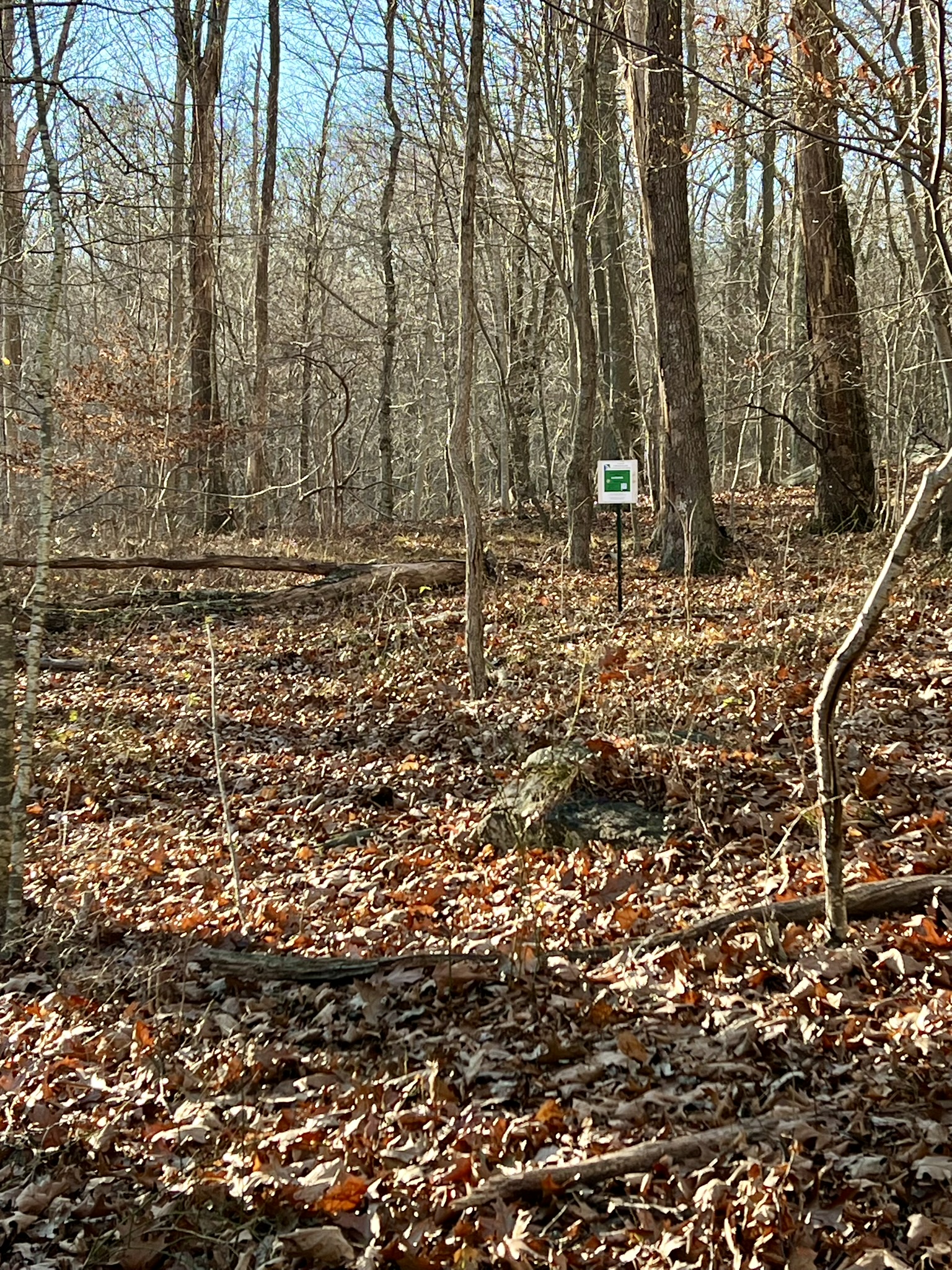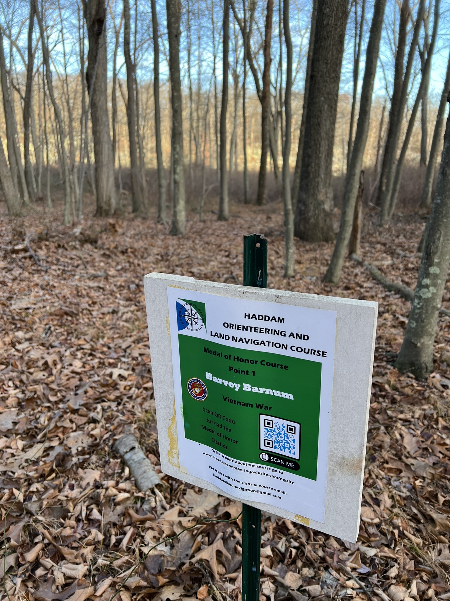 Haddam native Dan Dachelet created the Haddam course, which spans CT DEEP land and the Haddam Land Trust’s Beaver Ledges parcel. Dan learned compass and navigation skills in the military, where he developed a love of orienteering. This course was immensely challenging but also very fun for a variety of reasons. I recommend tackling this course after you have tried some beginner level courses. The main challenge is that the map has very few landmarks. There are a few symbols on the maps to denote cliffs and boulders, but no legend, so you need to know what the symbols mean. Another challenge is that there are no control descriptions to provide hints as to what you are looking for, and in many cases the points are some distance from any trail. For our first visit in mid-November we had a short time window before dark, so decided to try for points 7, 5, 10 and 12 in the northern part of the forest. Despite the challenges, we soon learned these were mitigated by the control points themselves, which are large signs on chest-high signposts. The next surprise was the dedications to different Connecticut Medal of Honor recipients. The name and war are listed on the sign, along with a scan code where you can pull up each soldier’s unique story. With each find we took the time to look up and read aloud the events that led to the proffering of the medal. It was a very poignant experience. Anyone who has questions about the course, or for organizations interested in an in-person class in orienteering, email dandachelet@gmail.com.
