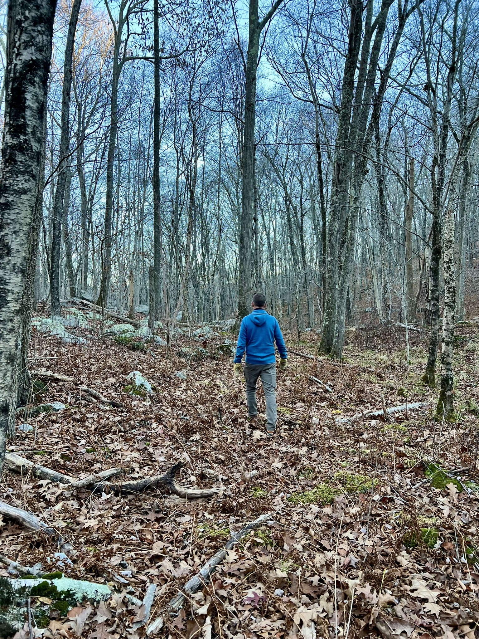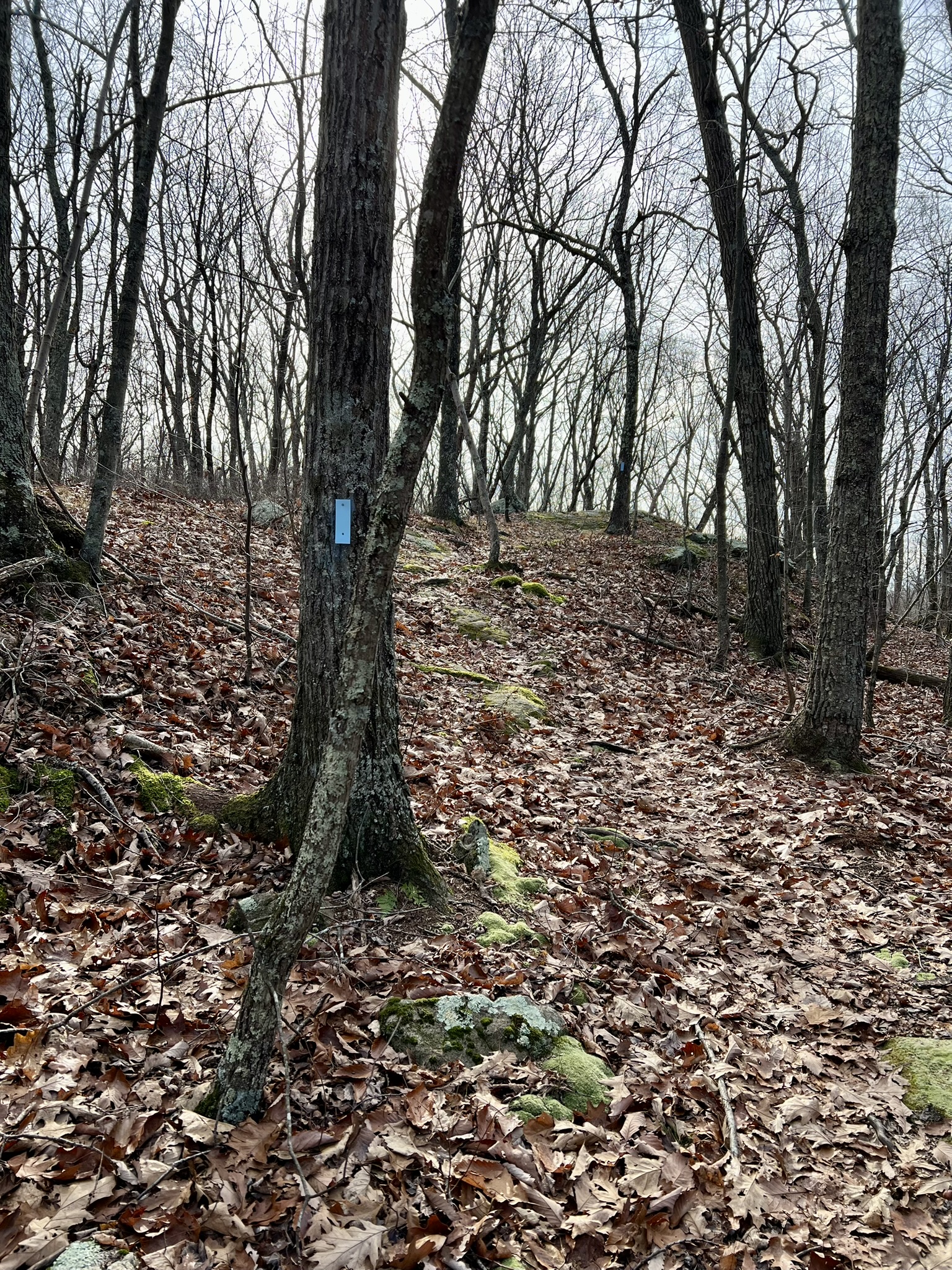 I was on a roll. Is there such a thing as orienteering fever? If so, I think I have it. The Chatfield Hollow course was also an Eagle Scout Project, completed by Connor Walsh of Troop 18 in Killingworth in 2010. The course is published on the NEOC website, and I am pleased to report that all the CPs are in place 15 years later. On Thanksgiving weekend our friend and Tom’s adventure racing teammate, Molly, was visiting, so we made a plan to visit Chatfield Hollow to knock off some CPs. We focused on the northern and western points – N, L, K, I and E. We started with CP-N, and Molly spotted it first. Finding the first one is always exciting because until that point you aren’t sure exactly what you are looking for. We learned that the Chatfield Hollow CPs are all small orienteering red and white square plaques on trees low to the ground. At that point, I insisted on taking the lead, since Tom and Molly are more experienced and I needed the practice. My advantage was that I knew the trails in Chatfield Hollow inside and out, which felt a little like cheating. Standing at CP-N, I decided we should tackle CP-L as follows: take the trail heading west. When it makes a 90 degree turn to the south we would look for a large boulder about 50m along the trail, then go slightly farther and turn to bushwhack northwest following the grade of the hillside until we encountered the north/south stone wall shown on the map. From there we would follow the east/west facing stone wall toward its end keeping in mind the control point description was “Hill, Top.” When I spotted it exactly where I thought it might be I was hooked!