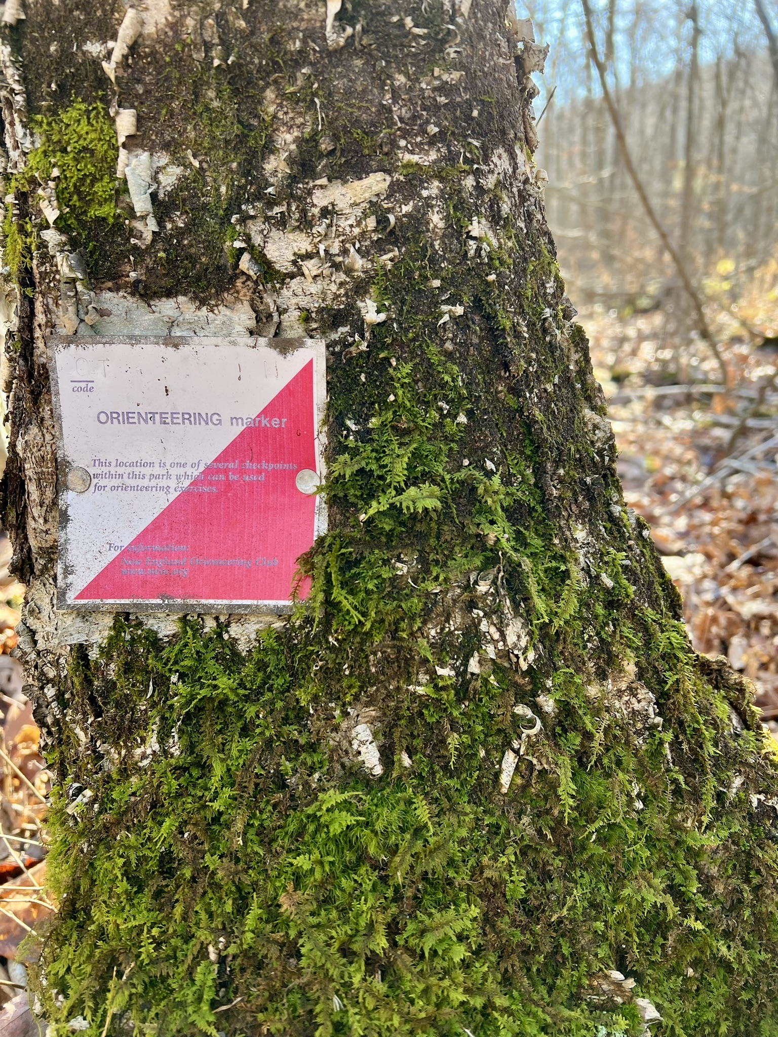 While most orienteering events are temporary, with control points (CPs) put up for a defined period of time, there are several permanent orienteering courses (O-courses) in Connecticut where you can practice orienteering skills at your own pace. While each one varies slightly, most of them have CPs that are small square markers with the trademark orienteering symbol of a white and orange triangle.