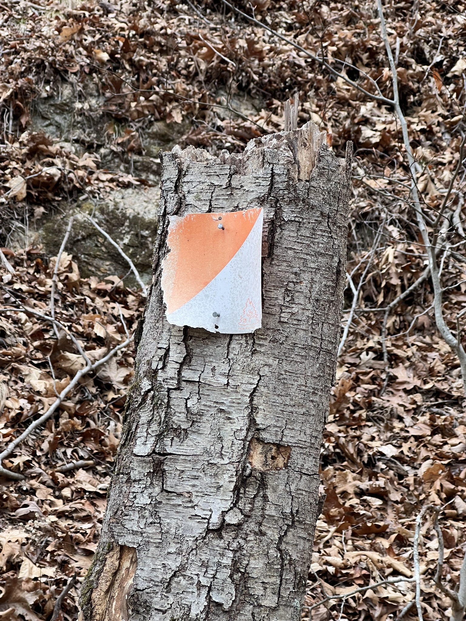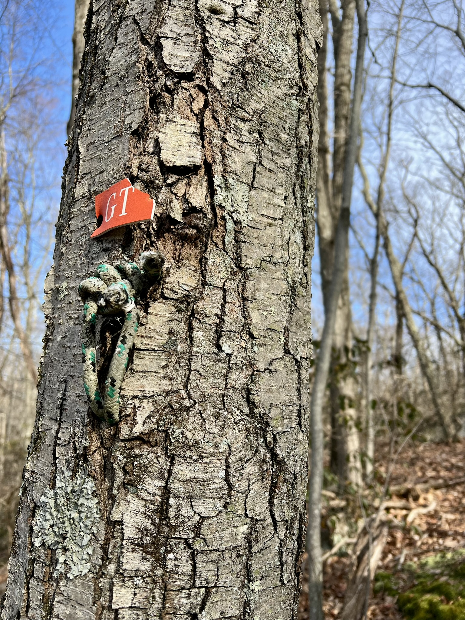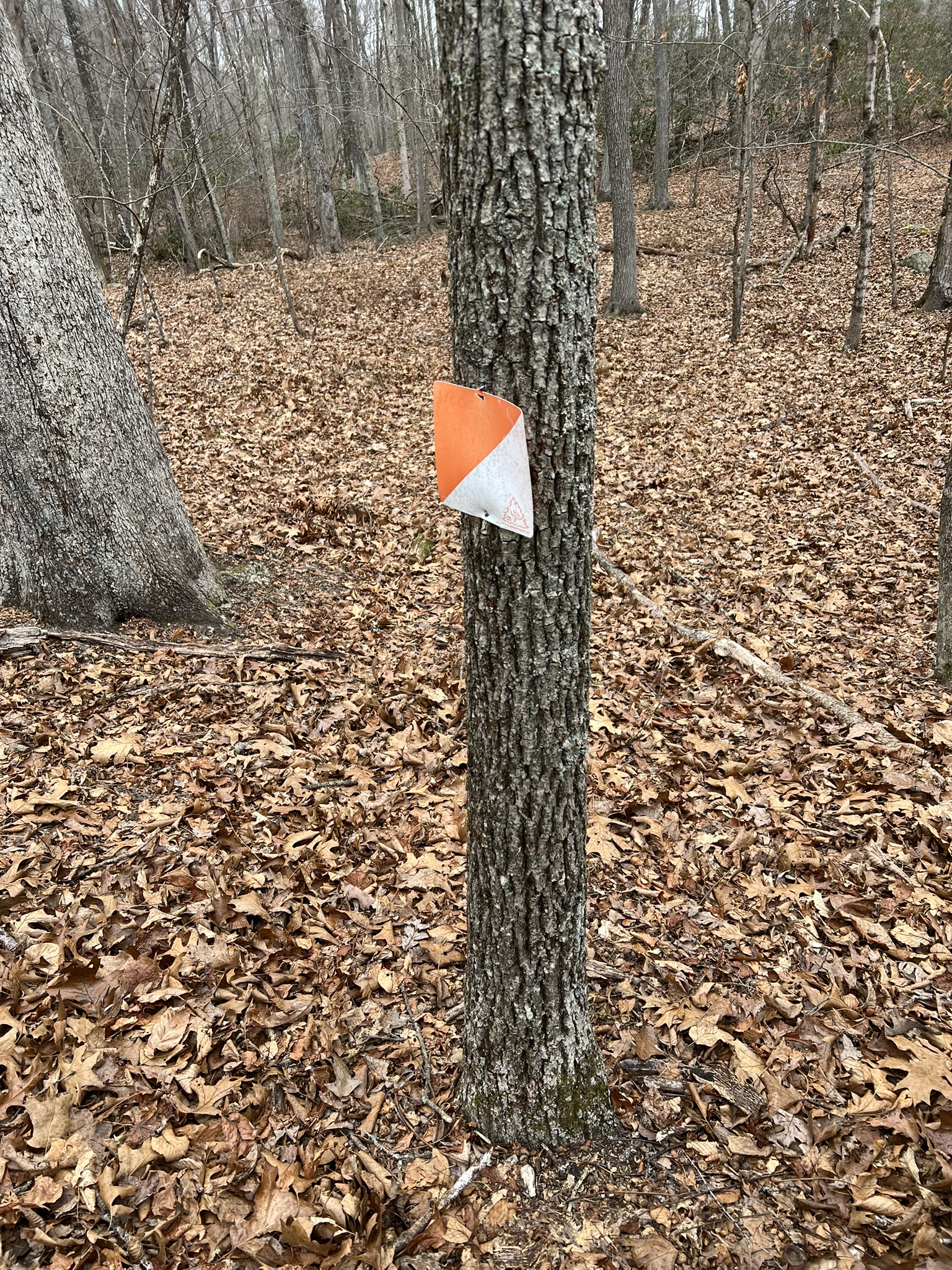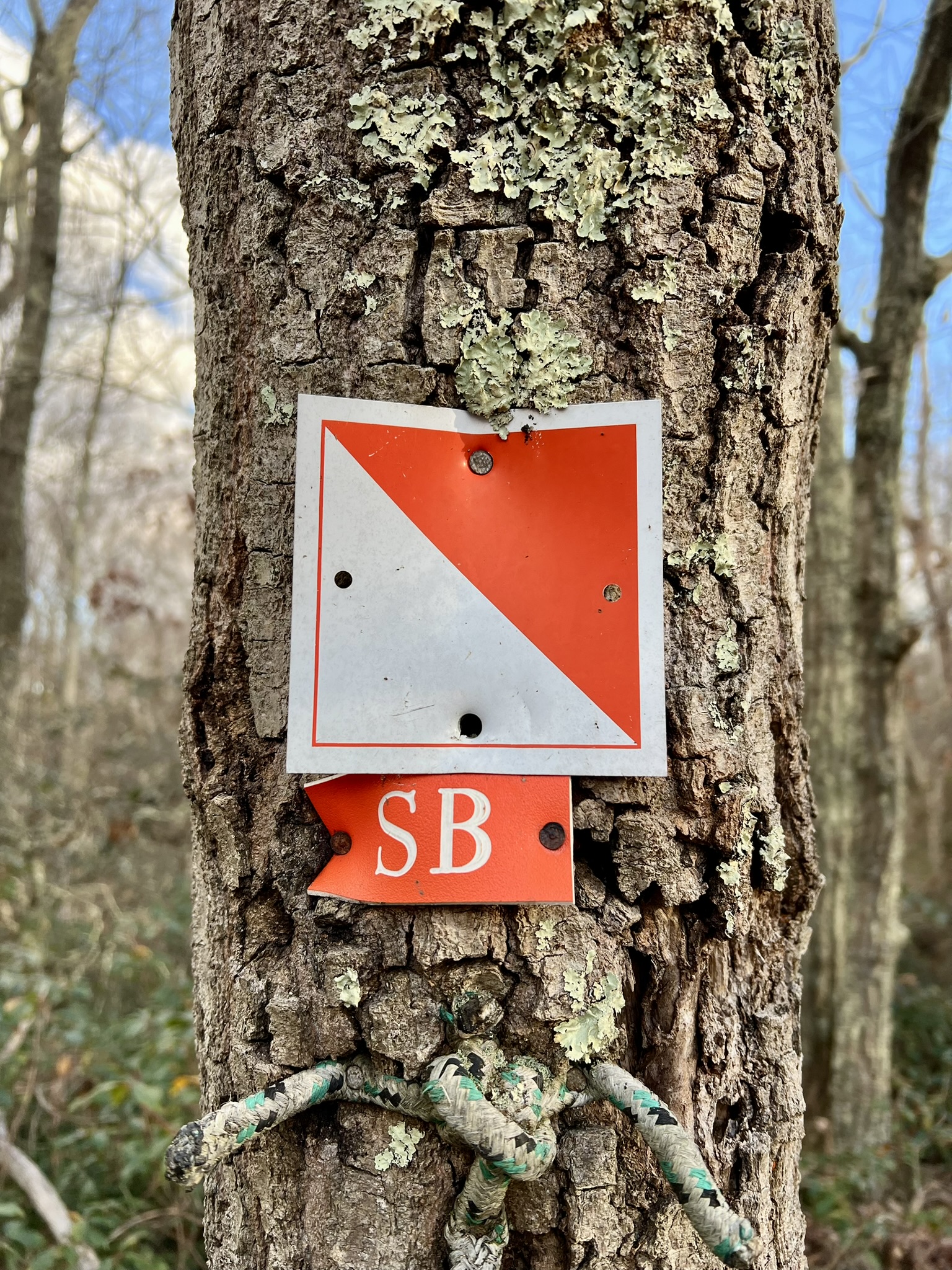 Noah Hastings created the Rockland Preserve O-course in 2013 as his Eagle Scout project. The original project had 14 points, each marked with a square orienteering marker, a label with unique identifying letters, and a different rope knot. When Tom and I arrived at the Rockland lot on Route 79 I got a lesson in making orienteering judgment calls. The map showed the trailhead to be south of the lot, and when I couldn’t find a trail to the south, I was stymied. That’s when Tom suggested that I consider the topography instead. He encouraged me to look at the surrounding terrain, and compare it to the terrain on the map. He pointed to a narrow valley and said “that looks like a re-entrant to the west which matches the map.” It turned out that the map was wrong, and that the trail actually leaves the parking lot from the right side — the back northern corner. (If you’re unfamiliar with the term “re-entrant”, Google describes it as follows: “In topography, a ‘reentrant’ refers to a low, V-shaped area between two hill spurs on a hillside, essentially a small valley or indentation where water naturally collects and flows downhill, appearing on a map as contour lines pointing back into the hillside rather than outwards like a spur: it’s often called a ‘draw’ in orienteering”.) Finally on the correct trail, we quickly found CP12 at head height on a tree and not hidden at all. We decided to do a clockwise loop to get 7 of the 14 points, heading first in the direction of CPs 11 and 10. Our next challenge was a double whammy – we soon realized that only some of the trails are shown on the map, so we had to put extra thought into our route. Then, after much backtracking and searching, we also were certain that CP11 was missing. This happened again with CP10 and I started to take photos and GPS coordinates of where we thought the CPs should be. In total, we determined that 3 of the 7 CPs on our loop were no longer there.