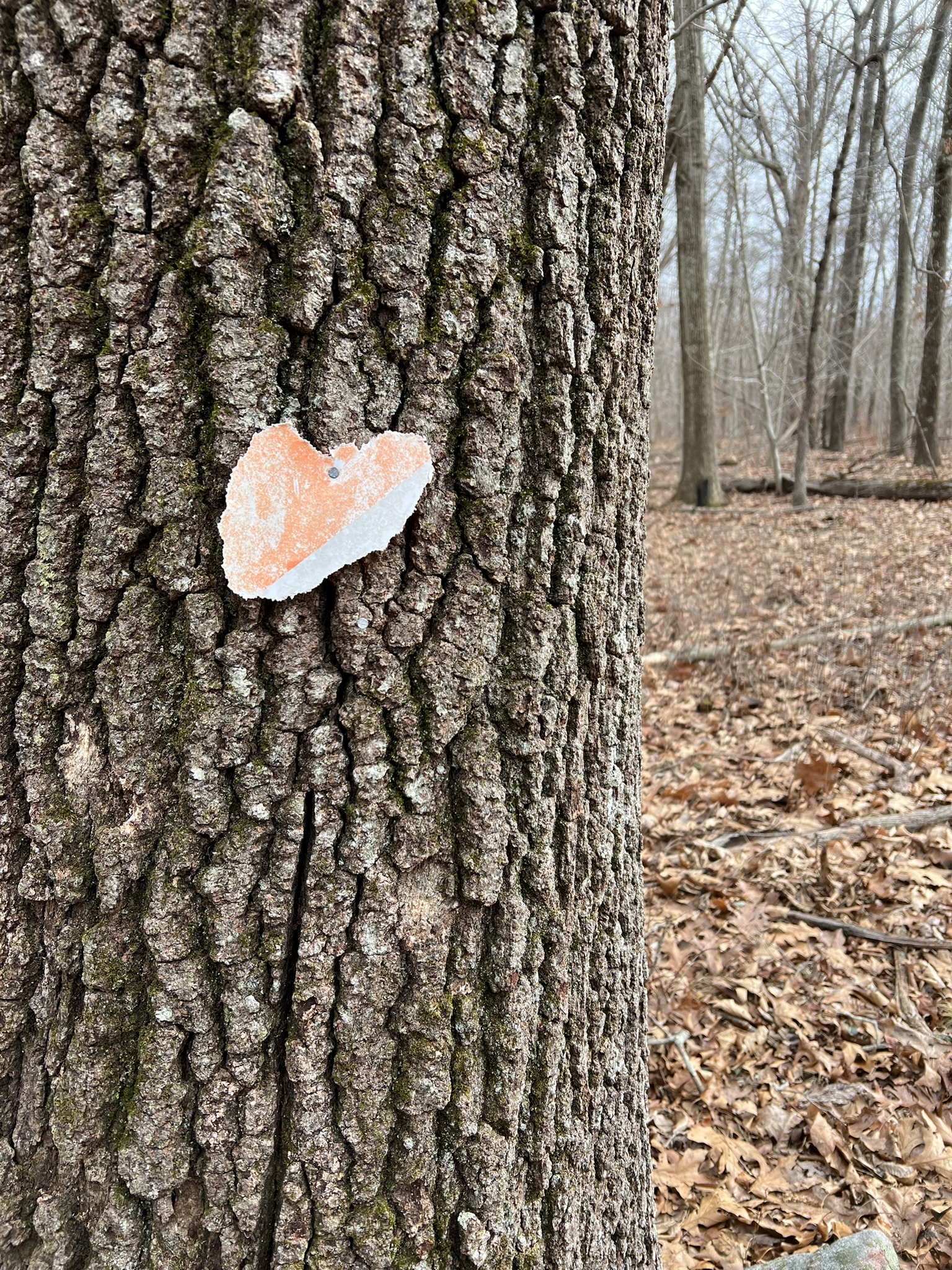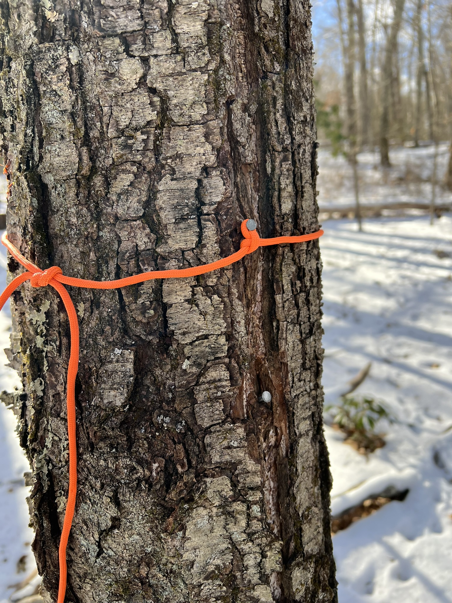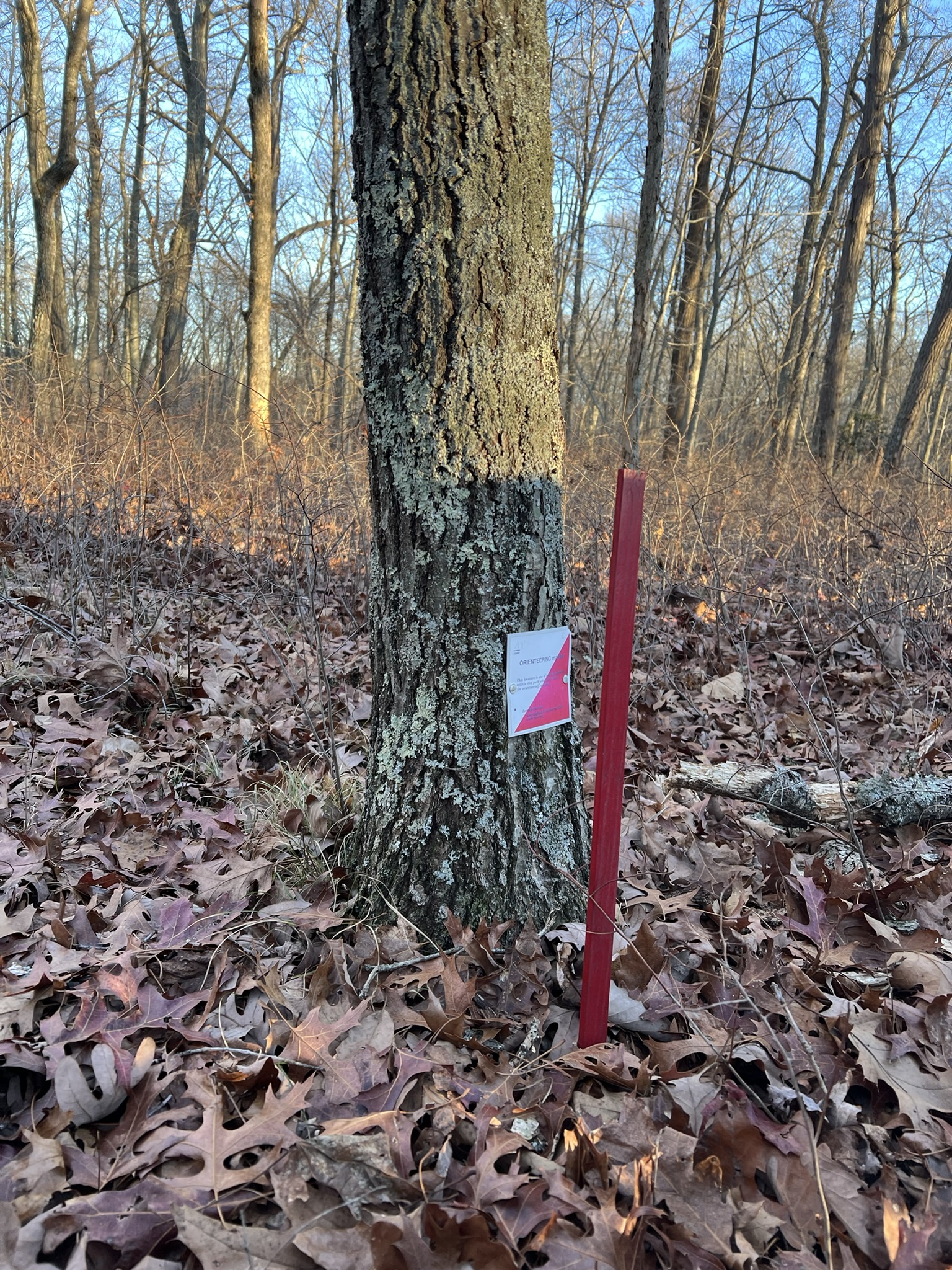 I was eager to finish the course, so returned the next day by myself with my newly honed skills and attacked CPs 1 through 7 from the Renee’s Way parking area. I faced similar challenges, discovering that 4 of the 7 CPs were missing. As a side note, the trails on the map around CPs 1, 2 and 3 are not exactly accurate, and the purple blazed trail is new. Luckily I was already familiar with this preserve. I recommend going by the landmarks noted for this section, rather than the trails. By the time I was done, I suspected that 7 of the 14 points were missing completely, and several others were broken or partial. I otherwise loved the course as a beginner challenge and was keen to see how I could help reinvigorate it. As serendipity would have it, when I reached out to the local Madison Boy Scout Troop 490, they had recently had the same thought. We joined forces and I got in touch with Noah Hastings to share my discoveries. Noah was pleased to see renewed interest in his 12-year old project and he generously took time over the holidays to go out on the course and mark trees for replacement CPs. Scout leader, Bill Johnson, and his son, Jack, have taken the lead on acquiring new CPs, and making a plan to install them on the course. The February storm cycle has impacted this work, but hopefully by the time you read this the course will be newly refreshed. They have decided to leave off both the unique initials associated with each CP and the rope knots, which degraded quickly when exposed to the elements.