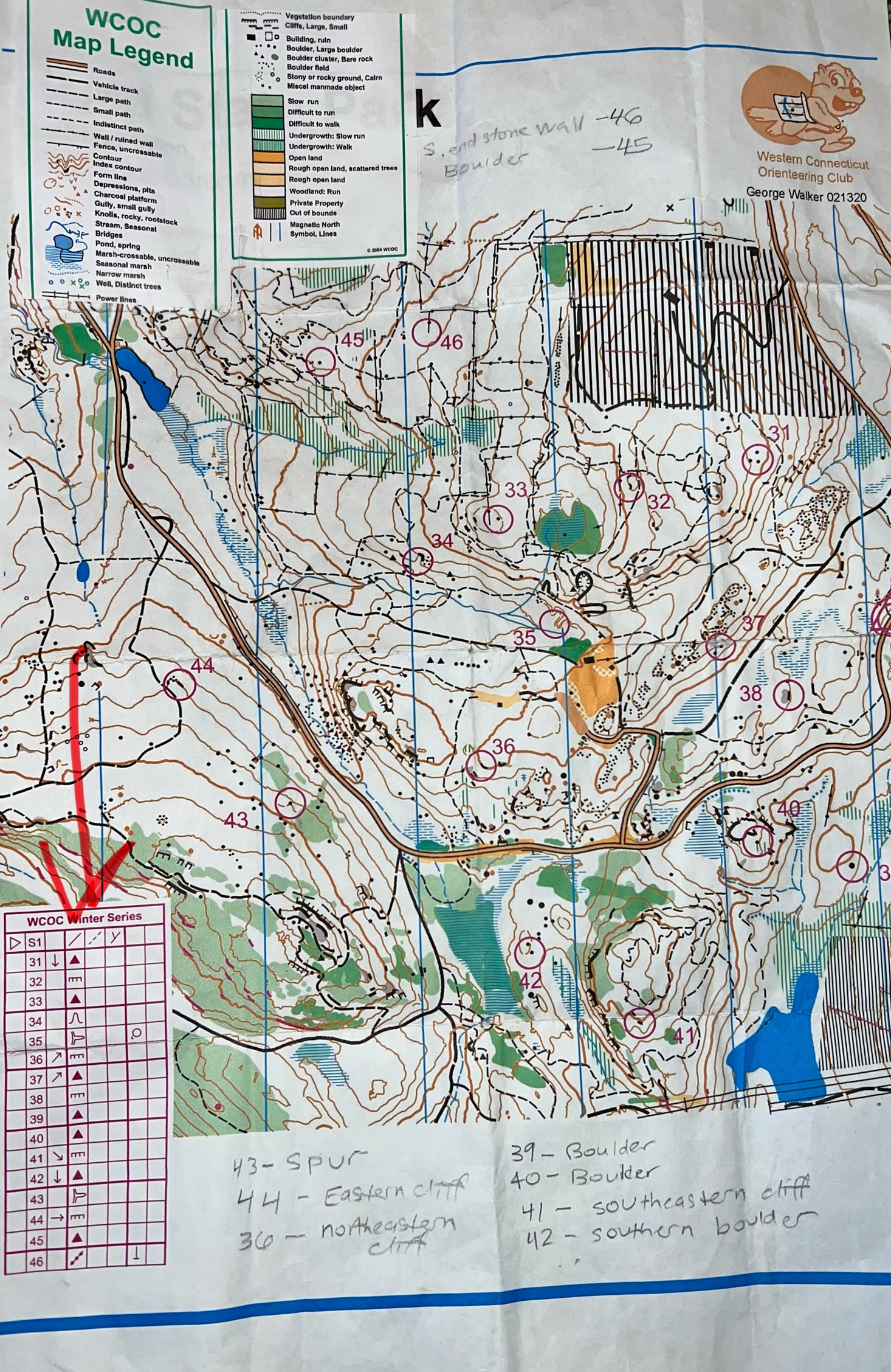 From left to right: snowy bushwhack; a large boulder in the woods; my map with legend taped on and clues both written and in table (see red arrow); where we think CP 43 is supposed to be.