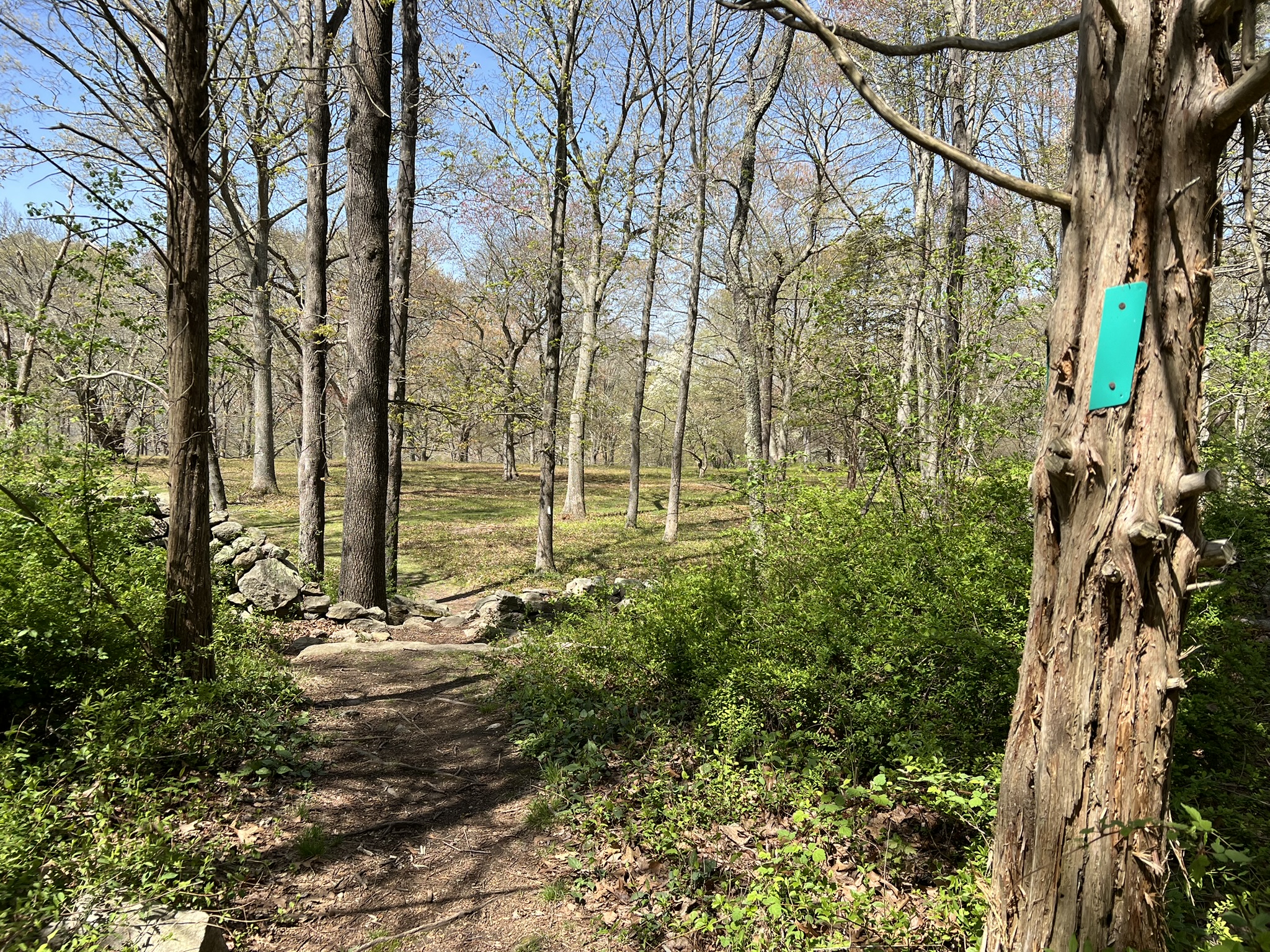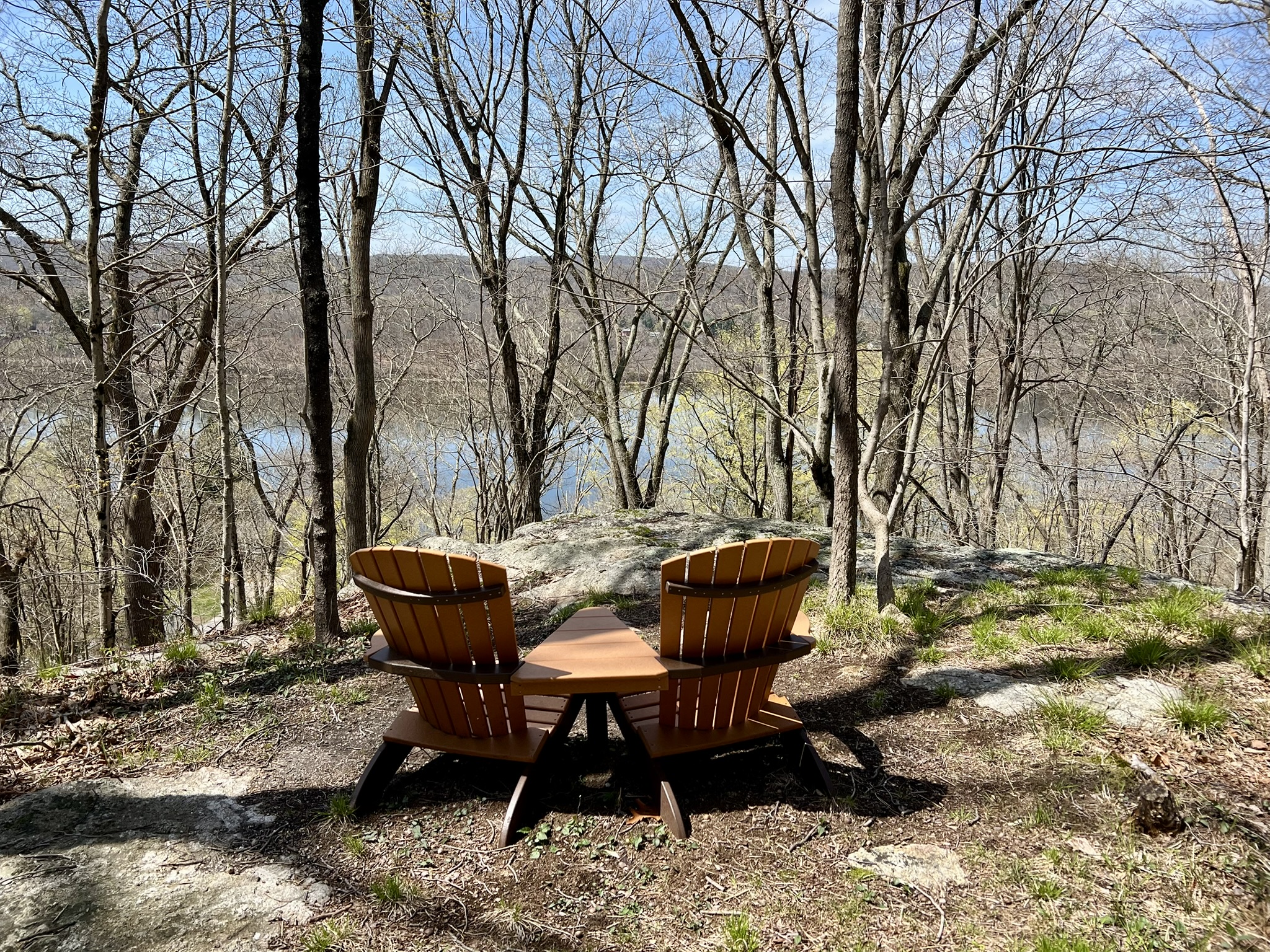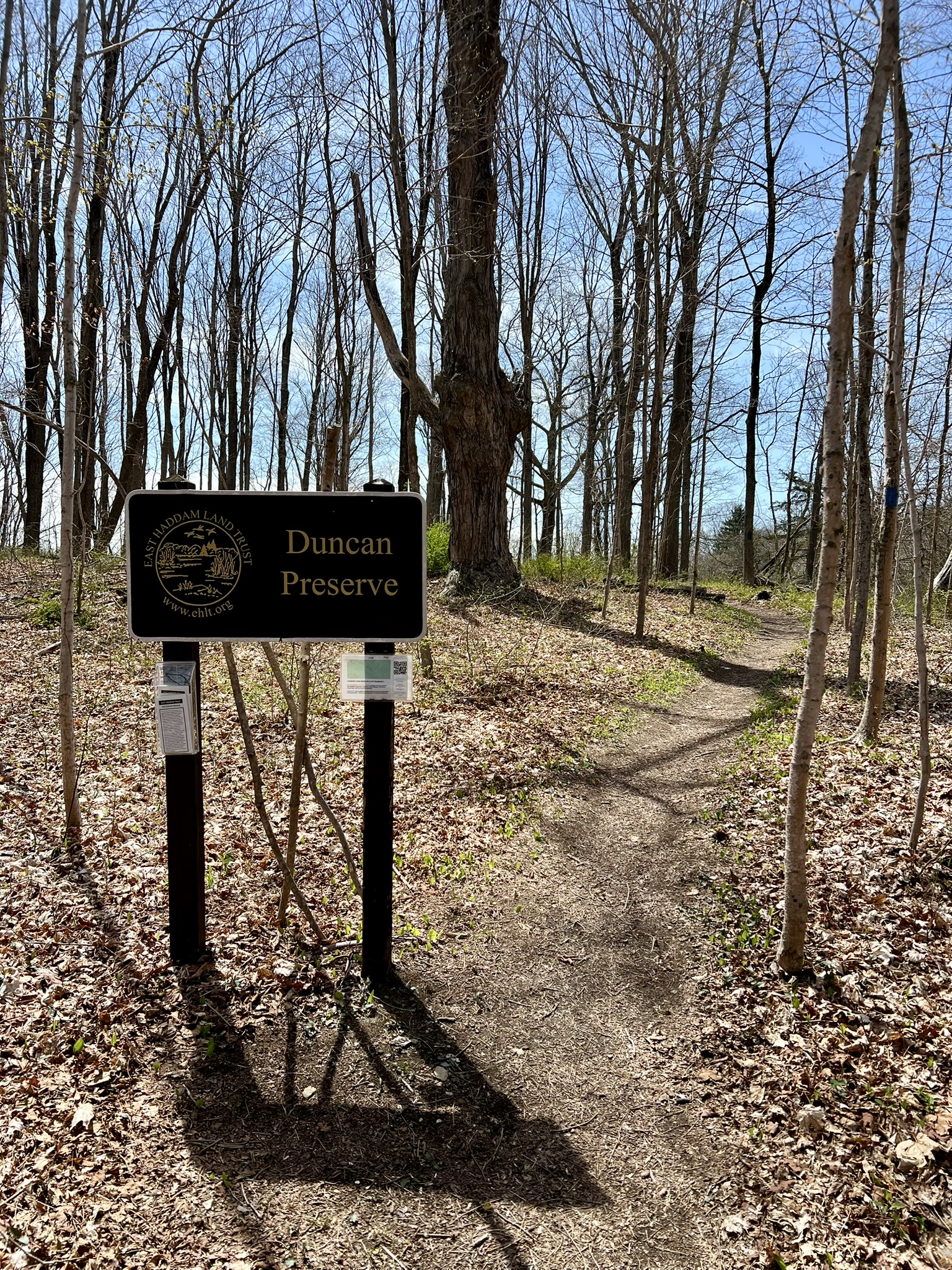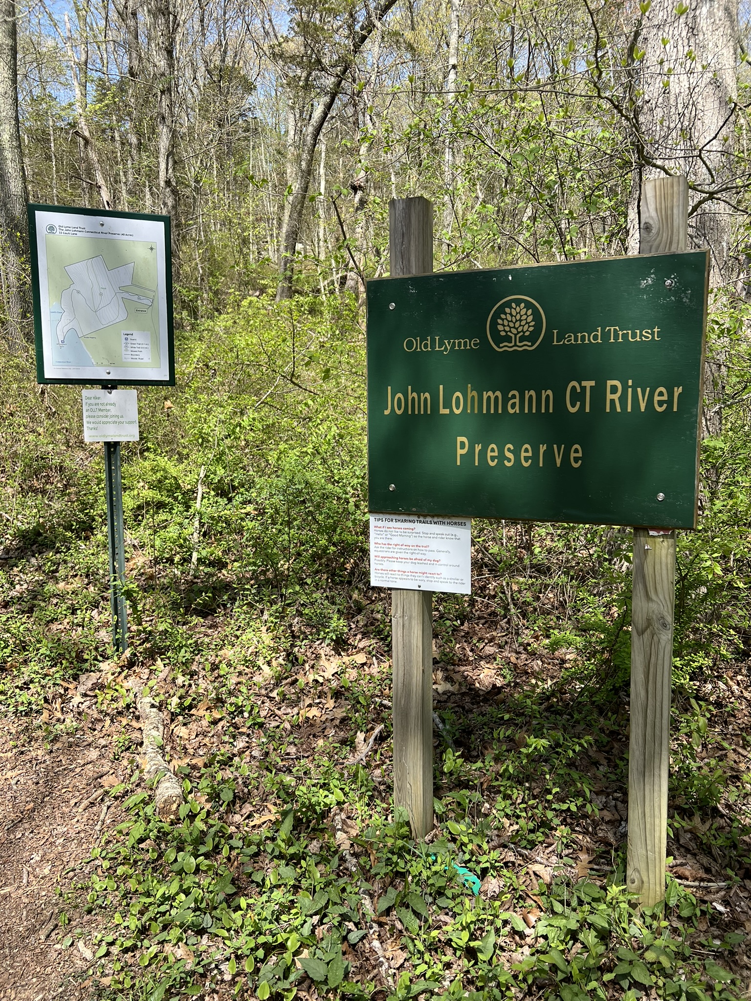 The parking for this sweet little preserve is on Porges Road where there is a pullout with room for several cars. I visited in April before the foliage blocked the river views. While the views will not be visible in summer, it is still a lovely hike, and can be combined with other nearby opportunities to experience the river. This property was acquired from the Duncan estate by the Connecticut River Gateway Commission and later donated to the East Haddam Land Trust. Volunteers have created two trails on the property shown on this TRAIL MAP: a blue loop trail and a bisecting red trail. A short distance from the trailhead is the original site of St. Stephen’s Episcopal Church, constructed in 1791 and moved its current location on Main Street in 1921. There are some of the original foundation stones and a signboard with details about the Church’s history. From there, the trail descends steeply to the site of an old rock quarry which provided much of the stone used in the construction of the Church. When the blue trail diverged, I stayed to the right to do a counter-clockwise loop, ignoring the next intersection with the red trail and continuing straight. After a short distance I reached a rocky outcropping with a double Adirondack Chair that offered seasonal views of the Connecticut River. I hadn’t planned on taking a break this early in my hike but I could not resist. From there, the trail parallels the river for a distance before looping around. When I reached the other red trail intersection I took it to cross back to the blue trail, then followed blue past the rock quarry until I once again reached the red trail. At this point I retraced my steps to my car. I managed to eke out just over one mile.