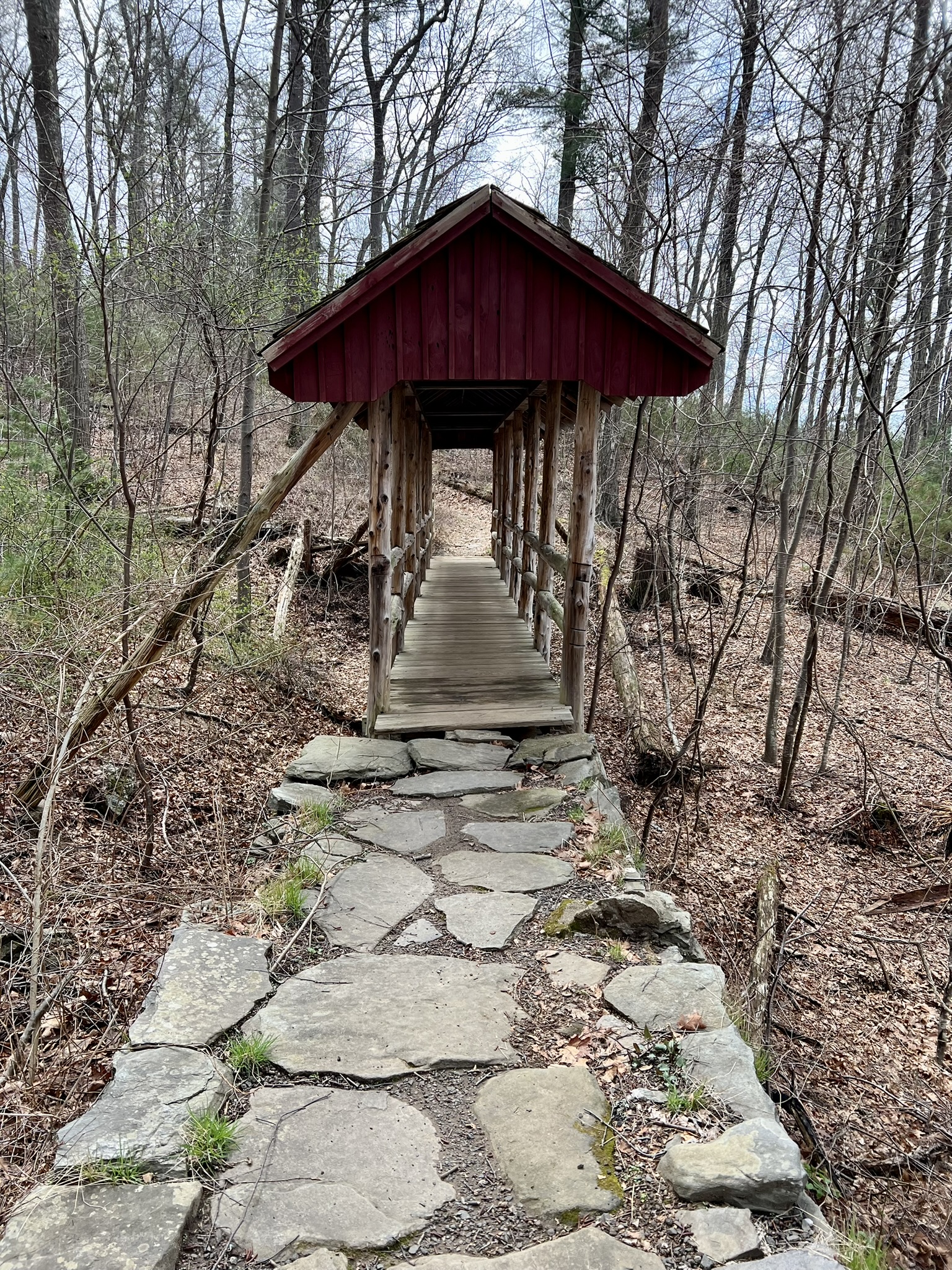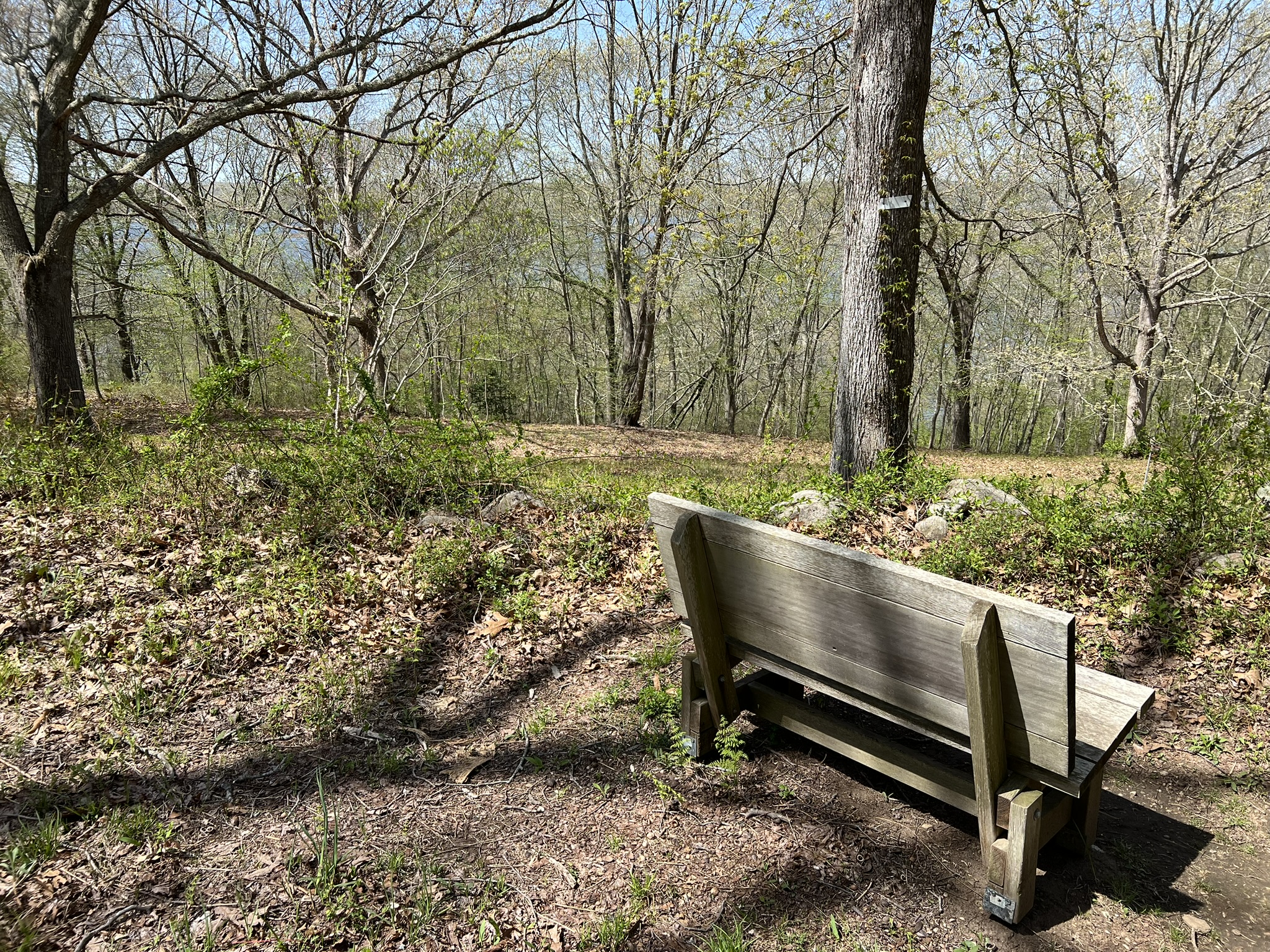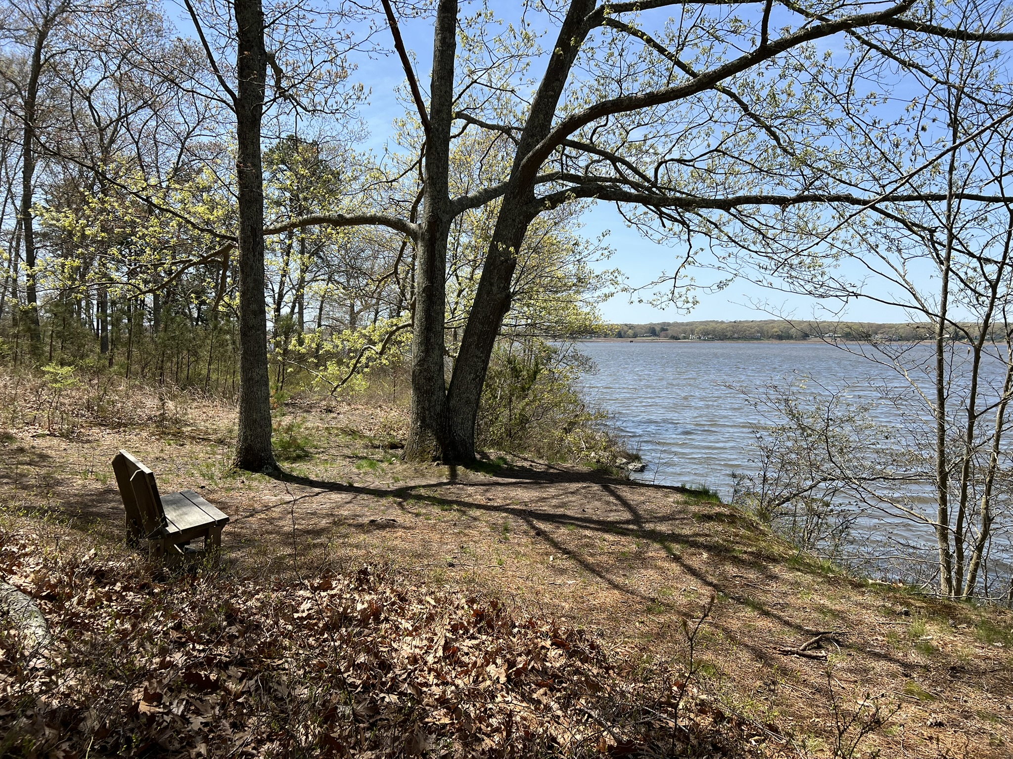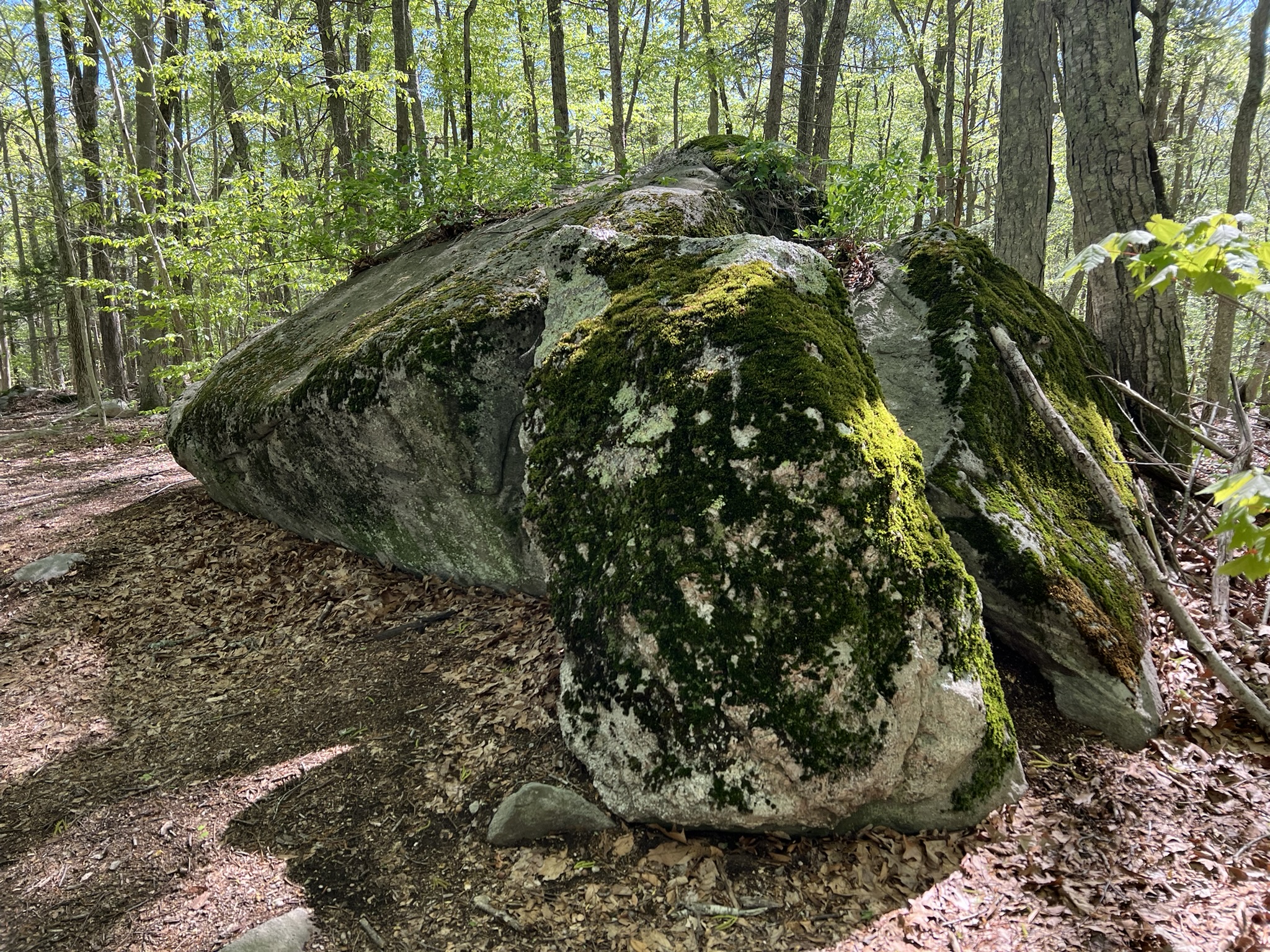 The parking for this sweet little preserve is on Porges Road where there is a pullout with room for several cars. I visited in April before the foliage blocked the river views. While the views will not be visible in summer, it is still a lovely hike, and can be combined with other nearby opportunities to experience the river. This property was acquired from the Duncan estate by the Connecticut River Gateway Commission and later donated to the East Haddam Land Trust. Volunteers have created two trails on the property shown on this TRAIL MAP: a blue loop trail and a bisecting red trail. A short distance from the trailhead is the original site of St. Stephen’s Episcopal Church, constructed in 1791 and moved its current location on Main Street in 1921. There are some of the original foundation stones and a signboard with details about the Church’s history. From there, the trail descends steeply to the site of an old rock quarry which provided much of the stone used in the construction of the Church. When the blue trail diverged, I stayed to the right to do a counter-clockwise loop, ignoring the next intersection with the red trail and continuing straight. After a short distance I reached a rocky outcropping with a double Adirondack Chair that offered seasonal views of the Connecticut River. I hadn’t planned on taking a break this early in my hike but I could not resist. From there, the trail parallels the river for a distance before looping around. When I reached the other red trail intersection I took it to cross back to the blue trail, then followed blue past the rock quarry until I once again reached the red trail. At this point I retraced my steps to my car. I managed to eke out just over one mile.