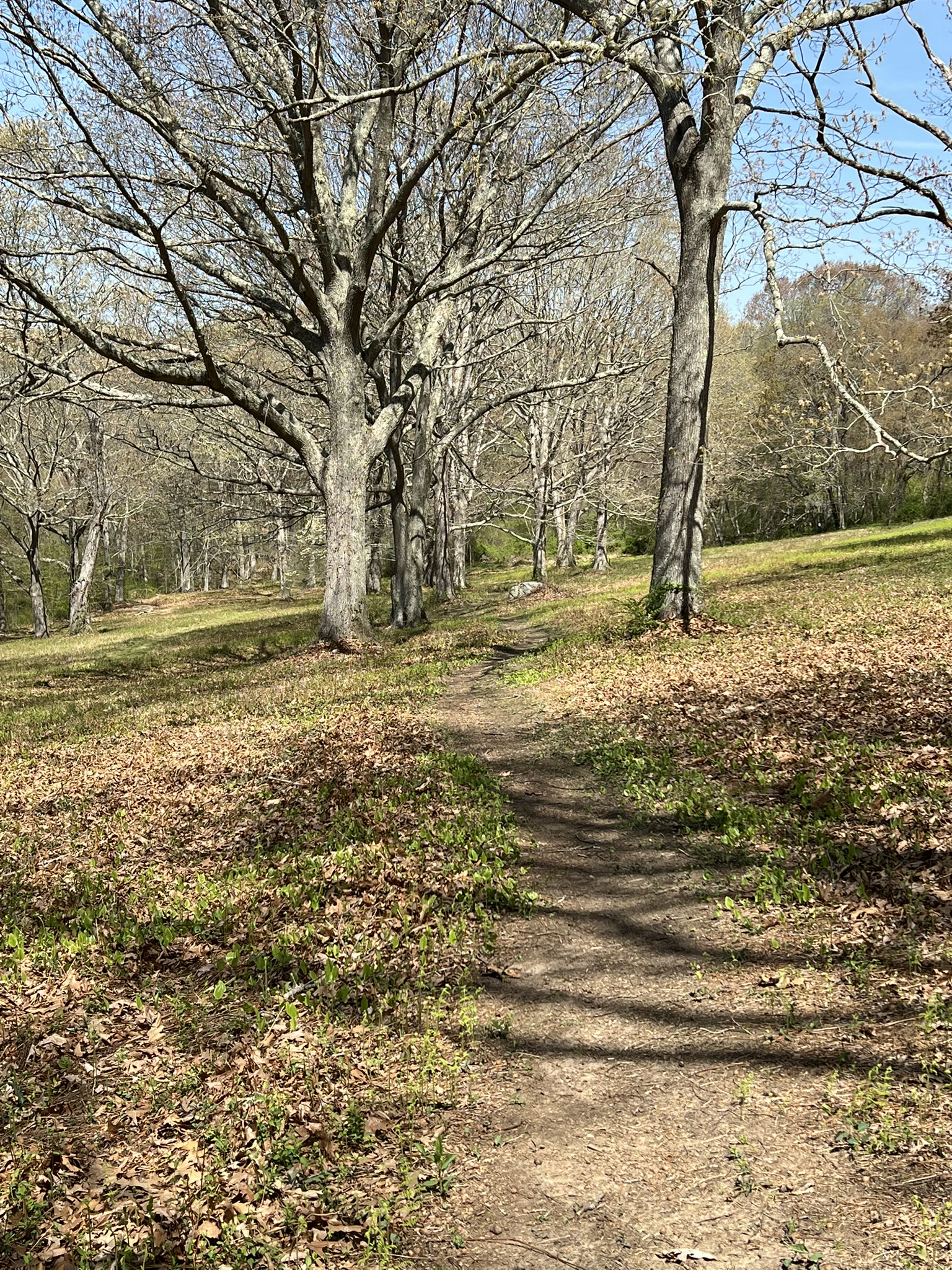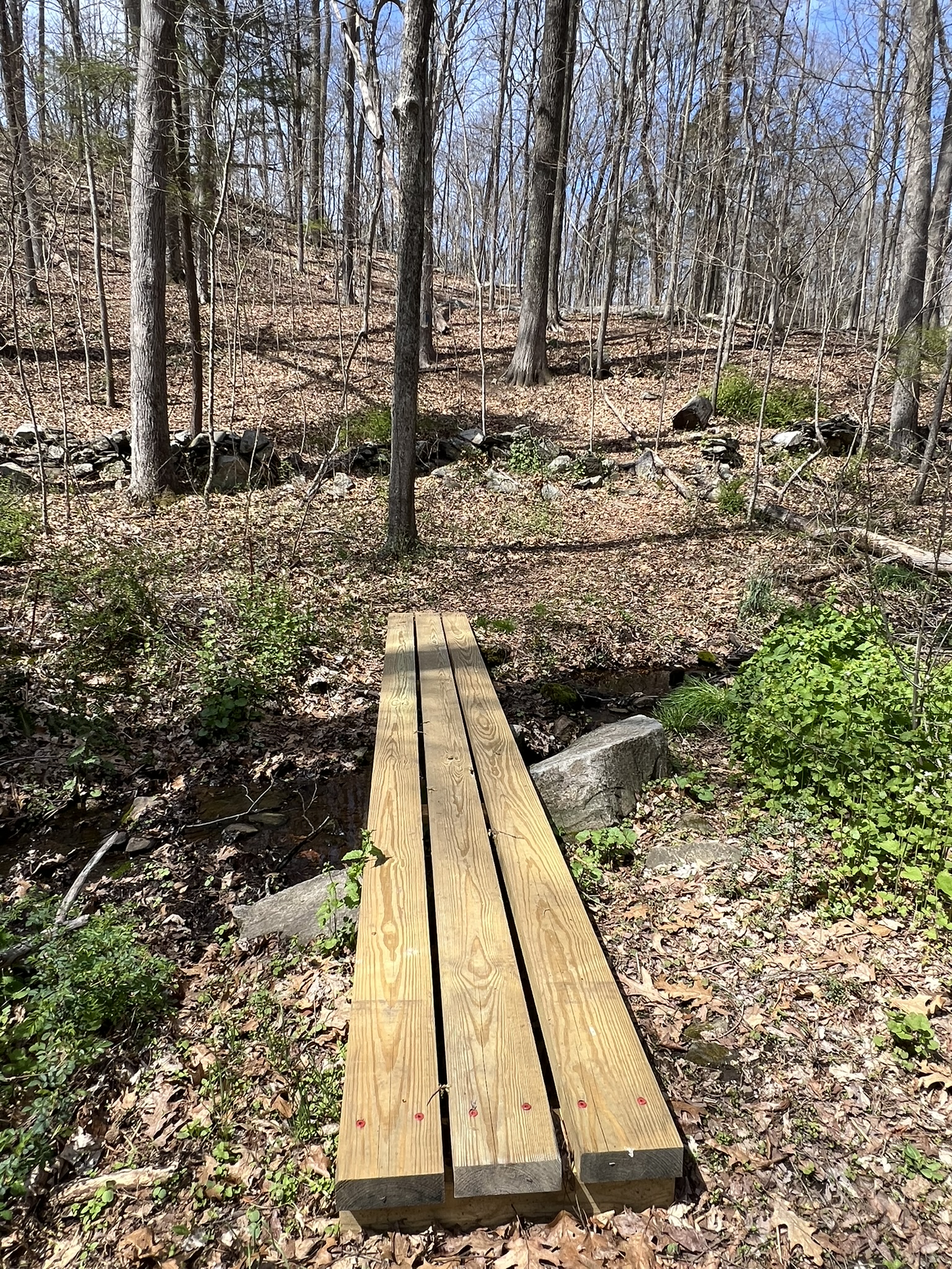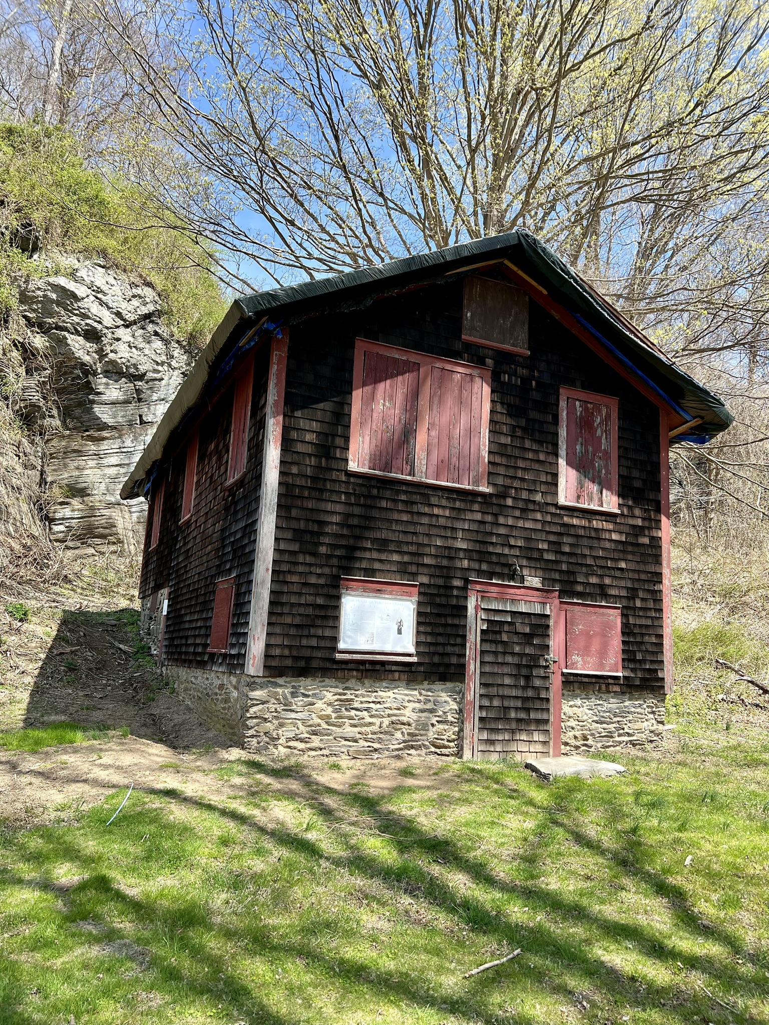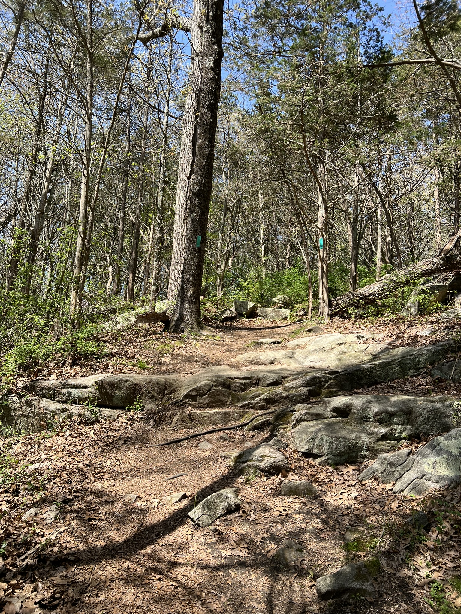 The parking for this sweet little preserve is on Porges Road where there is a pullout with room for several cars. I visited in April before the foliage blocked the river views. While the views will not be visible in summer, it is still a lovely hike, and can be combined with other nearby opportunities to experience the river. This property was acquired from the Duncan estate by the Connecticut River Gateway Commission and later donated to the East Haddam Land Trust. Volunteers have created two trails on the property shown on this TRAIL MAP: a blue loop trail and a bisecting red trail. A short distance from the trailhead is the original site of St. Stephen’s Episcopal Church, constructed in 1791 and moved its current location on Main Street in 1921. There are some of the original foundation stones and a signboard with details about the Church’s history. From there, the trail descends steeply to the site of an old rock quarry which provided much of the stone used in the construction of the Church. When the blue trail diverged, I stayed to the right to do a counter-clockwise loop, ignoring the next intersection with the red trail and continuing straight. After a short distance I reached a rocky outcropping with a double Adirondack Chair that offered seasonal views of the Connecticut River. I hadn’t planned on taking a break this early in my hike but I could not resist. From there, the trail parallels the river for a distance before looping around. When I reached the other red trail intersection I took it to cross back to the blue trail, then followed blue past the rock quarry until I once again reached the red trail. At this point I retraced my steps to my car. I managed to eke out just over one mile.