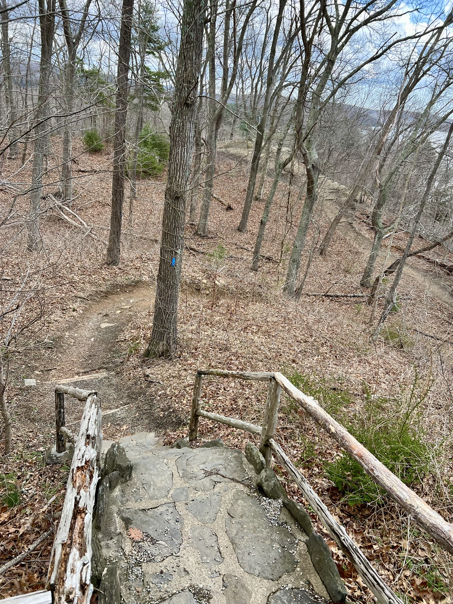 According to the website, the castle was “built in 1914 by William Hooker Gillette, the actor, director, and playwright most famous for his portrayal of Sherlock Holmes. The ornate, 14,000-square-foot stone fortress sits 200 feet over the Connecticut River…and is surrounded by 184-acres of gorgeous Connecticut woodlands. After his passing, the State of Connecticut purchased the castle and adjoining acreage to create a state park.” (If you are interested in a castle tour, click the “Tour” button on the website for details. Advanced booking is recommended.) I visited on a blustery day in early April to explore the red and blue trails – the two trails closest to the river as shown on this TRAIL MAP. I started on the red trail which begins after passing through the archway on the approach to the castle on the upstream (right) side. I followed the trail in a clockwise direction, going closest to the river to start. The trail is steep in places, often with eroded sections to navigate. There are mostly seasonal views of the river through the trees, and several side trails that end abruptly. The trail gets more interesting at the point where it dips down to the water’s edge. Here there is a picnic table and good views of the river. As the trail loops back it passes through some of the interesting rock structures and landscape features Gillette incorporated into his property. The trail connects to the yellow trail which returns the castle. The trail map lists the mileage as .41 but I clocked it at .70 including a few short detours onto the unmarked sections. Before exploring the blue trail I took in the views from the “Grand Central Station” pavilion and the Castle’s terrace. These locations offer the best unobstructed views of the river from a high vantage point. I spent some minutes watching the Chester/Hadlyme Ferry cross the river.