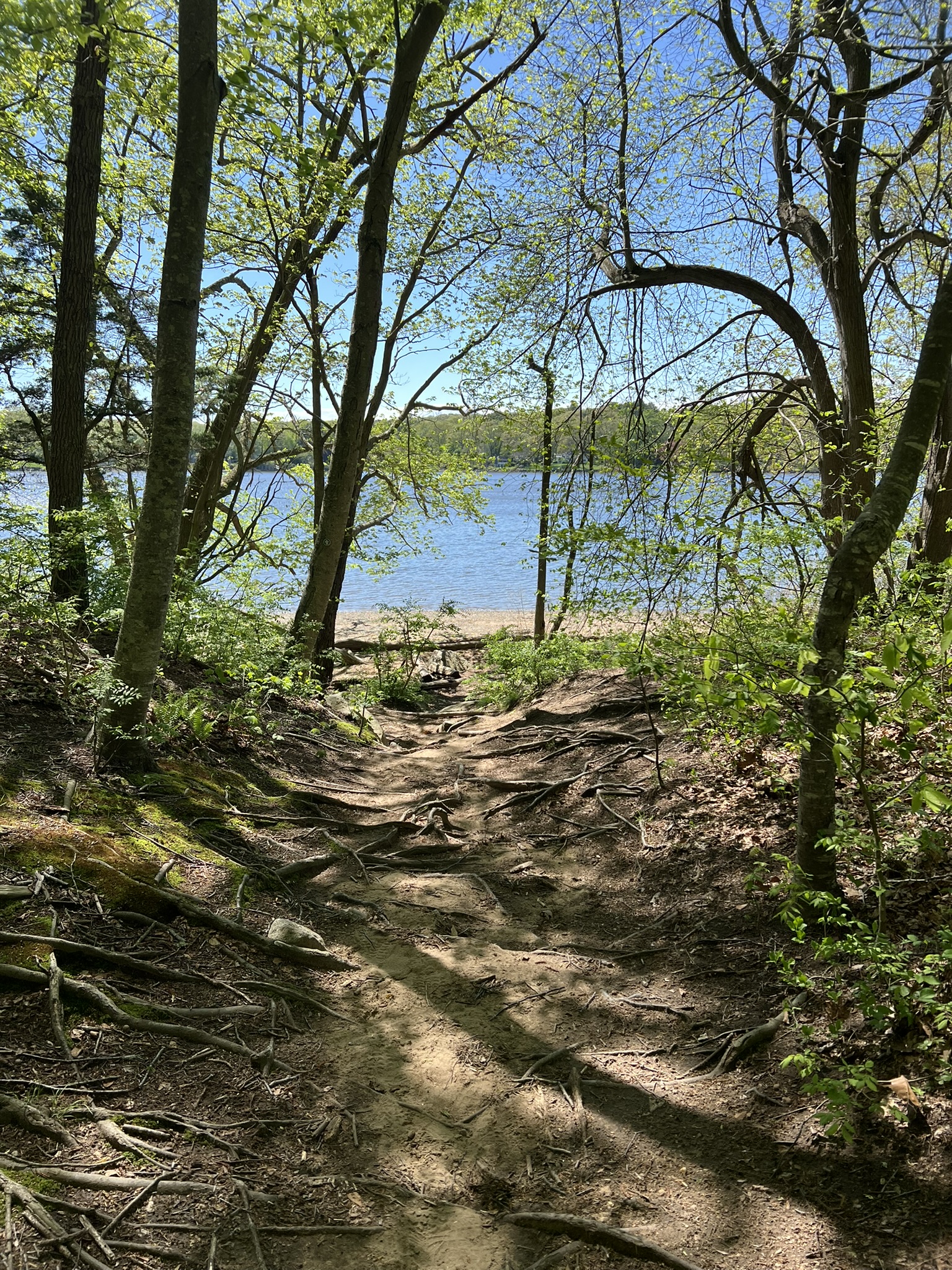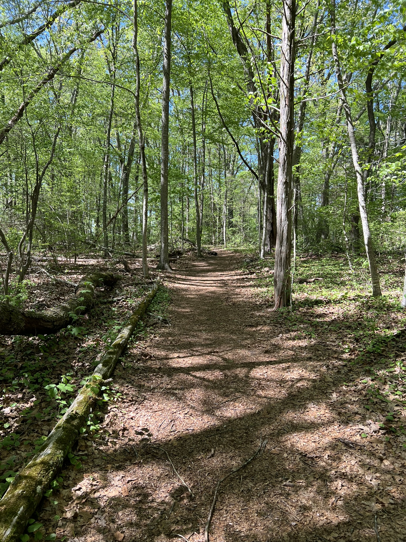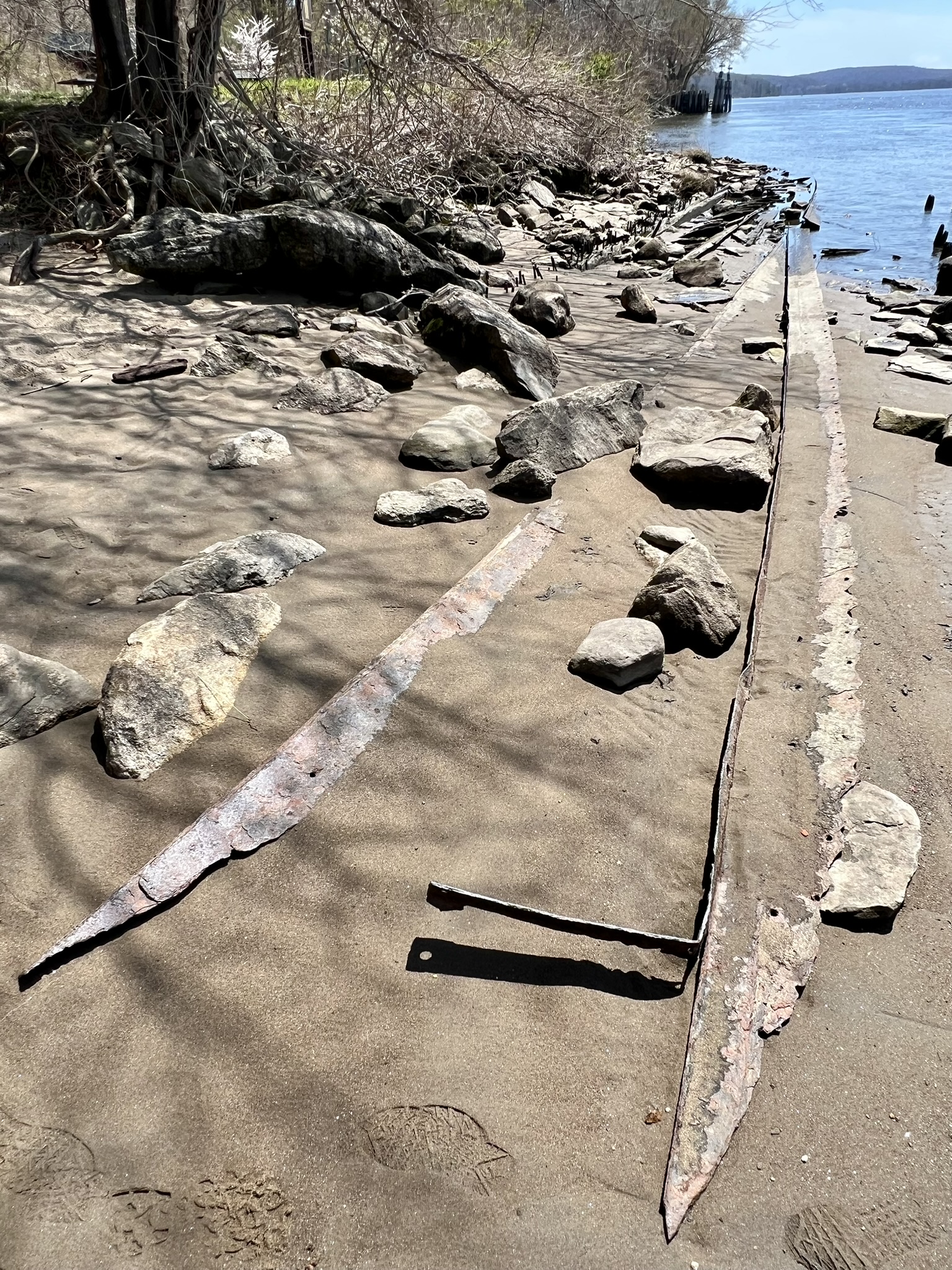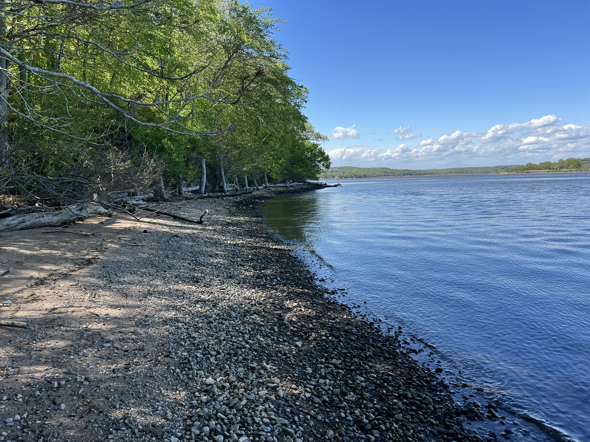 To the south of Essex Center lies the Turtle Creek Preserve. The first thing I noticed when I visited in May was how much better maintained the trails were, including blazing, which had been sporadic at best. Checking the kiosk, I learned that the prior steward, The Nature Conservancy, donated the property to the Essex Land Trust in 2024. Many thanks to the Essex Land Trust for all their improvements to the property. From the parking lot on Watrous Road I started on the green trail going clockwise. After crossing the private road I noticed a new orange blazed trail option. Staying on the green trail, I detoured to take the side trail down to the beach along South Cove. It was low tide and a beautiful sunny day after two days of heavy rain. Continuing on the green loop, I once again crossed the private road, then took the white trail on the left. This trail leads to a long beach along the Connecticut River. Often obscured in summer, look for the two large rusted mooring balls set back from the trail.