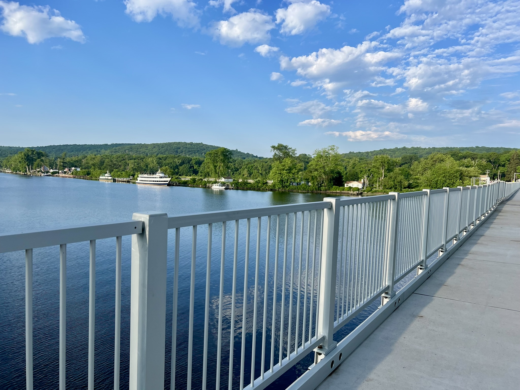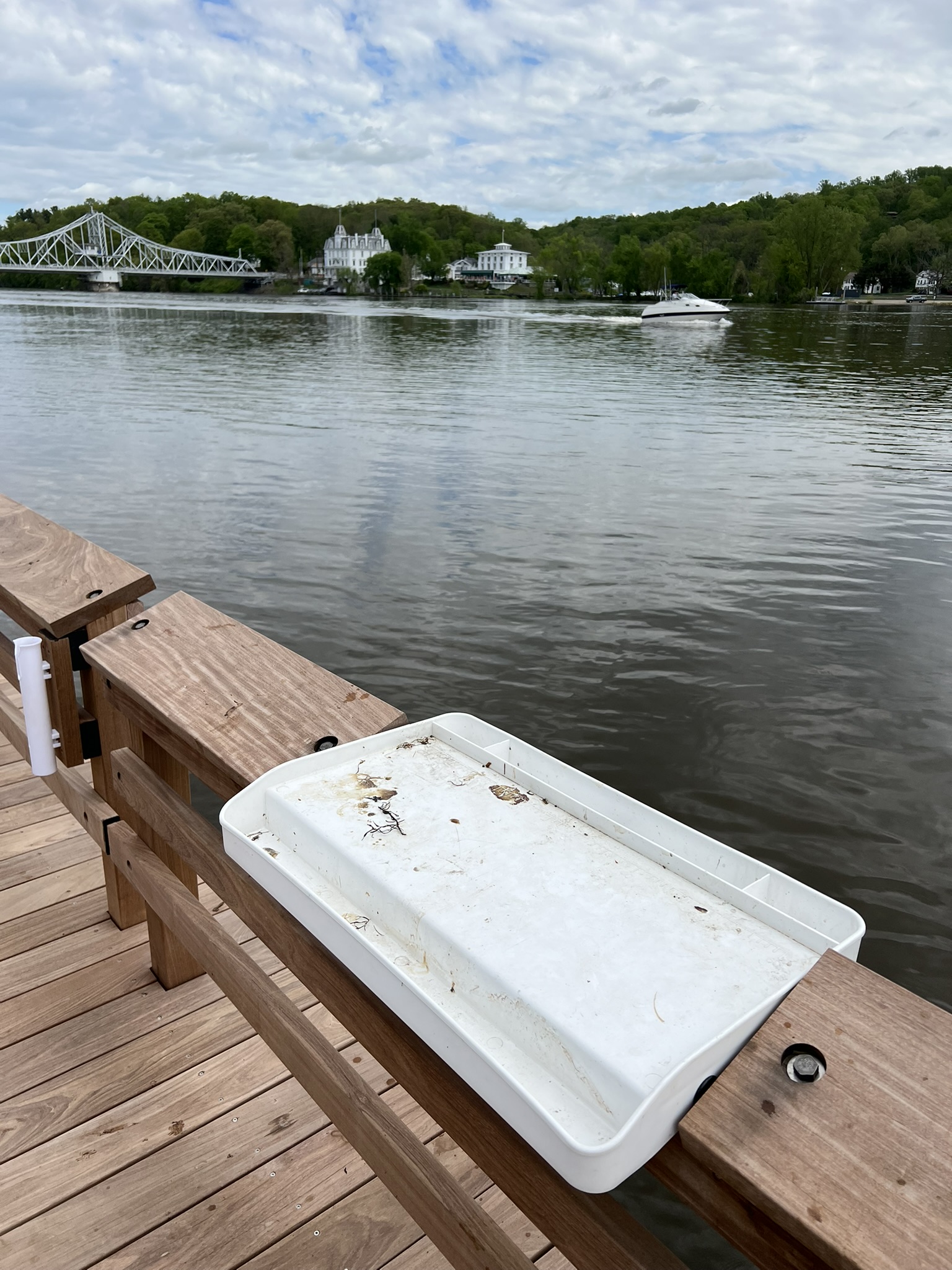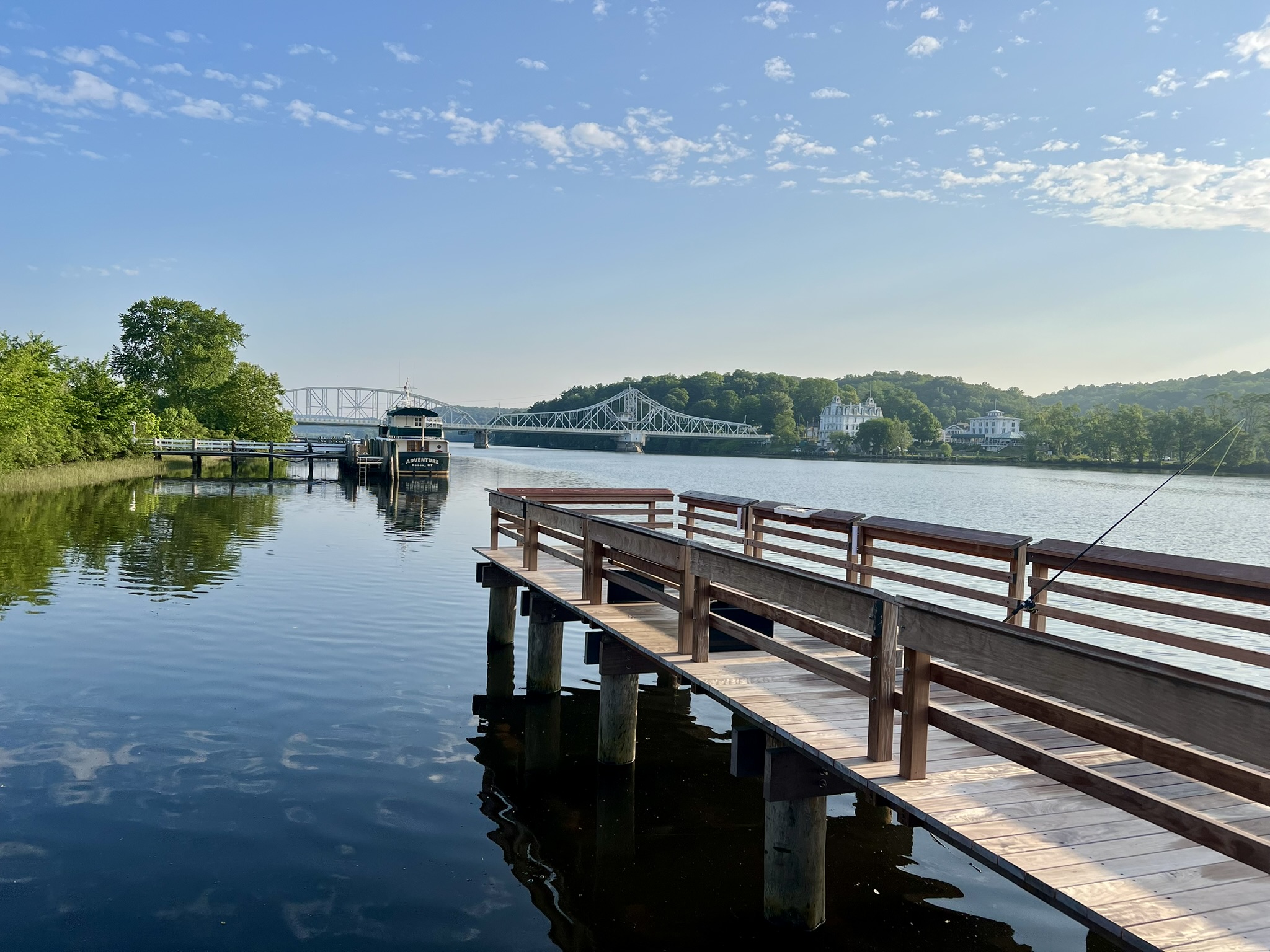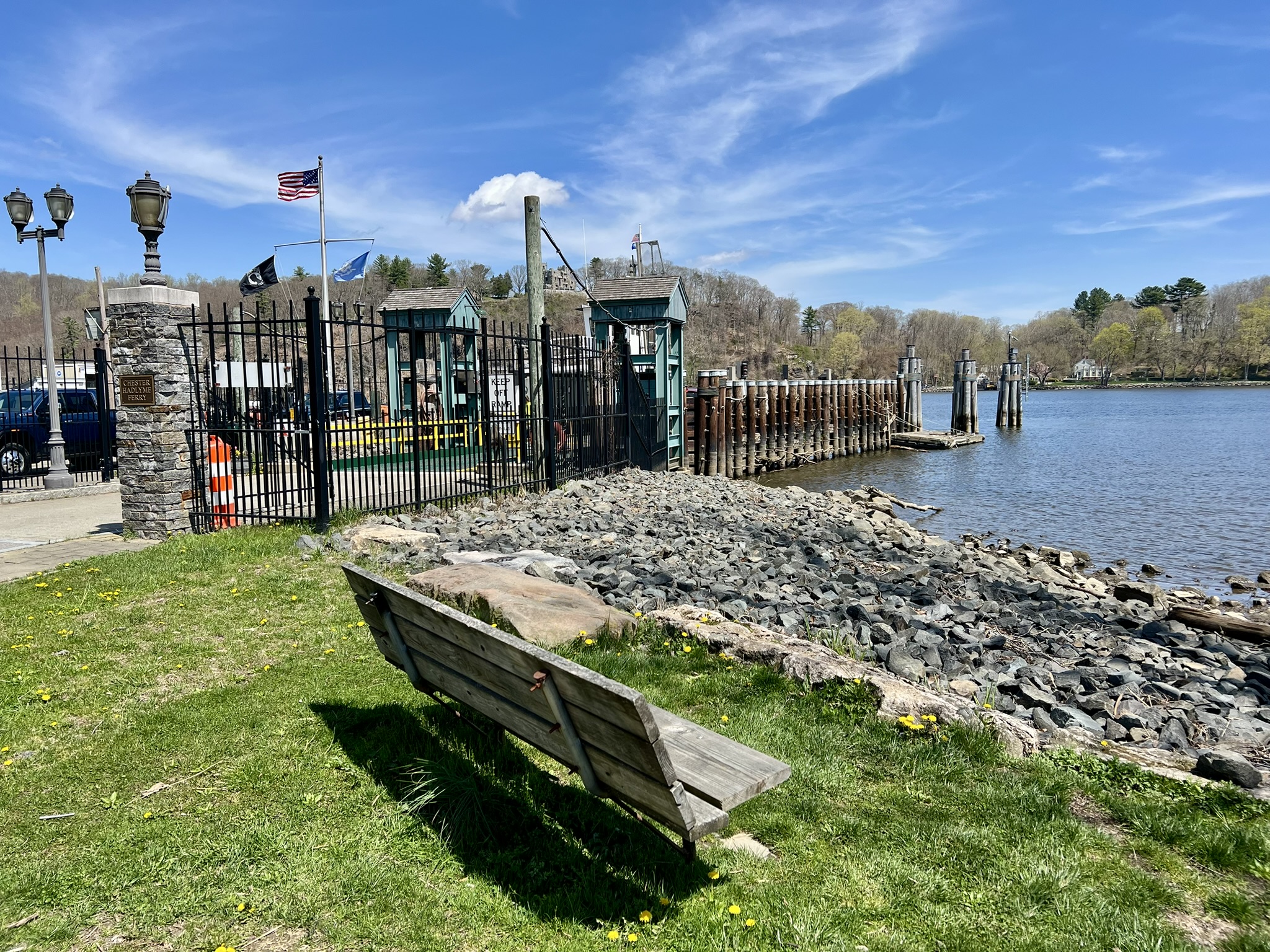 Continuing south on Route 154 to Tylerville and turning onto Route 82 will bring you to Eagle Landing State Park. This “park” is mostly a series of large gravel parking lots for river boat cruises, so I was delighted when I stopped by in early May and discovered a brand new fishing pier. When I looked it up, I found this press release from April 25th. The new pier is a joint Amtrak/DEEP project to provide an alternate fishing location because the Ferry Landing boardwalk and pier in Old Lyme is closed for a bridge replacement project. A new concrete sidewalk leads to the pier from the last parking lot. There are two benches, multiple pole holders, a line recycling container, and several pans to measure and gut fish. The pier has views of the East Haddam Swing Bridge and Goodspeed Opera House upstream, and a small plane airport directly across the river.