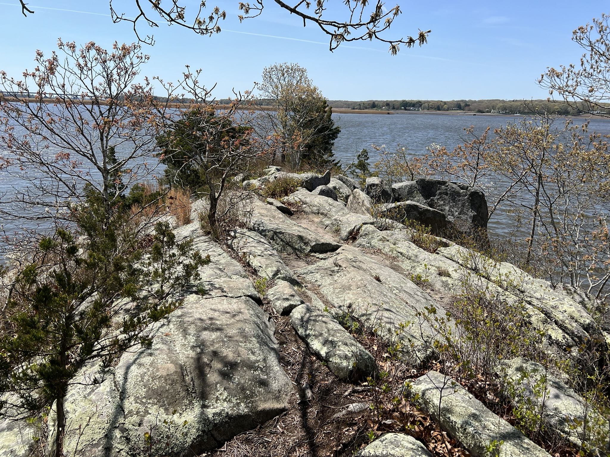 From the bench, follow the obvious path that leads down the hill at a gentle sloping angle and follow it as it curves back around to reach the level of the river. When you see some old outbuildings built into the hillside veer to the right to follow the path towards the river. The path then splits, with the trail to the right leading to a bench near the water’s edge fringed with mature pitch pines. The path to the left leads to Whaleback Rock, a rocky promontory that juts into the river. I happened to visit at high tide, but I have visited at low tide and was able to walk out all the way to the end. In summer be very careful of poison ivy. I saw some starting to emerge when I visited in early May. When I was there the shadbush was in bloom. The genus is Amelanchier and I have always known it by the name “Serviceberry”, but now I prefer to call it shadbush since it got that nickname because it blooms around the same time that the shad run. Pick out a slab of rock, take a seat and spend some time watching the river go by.